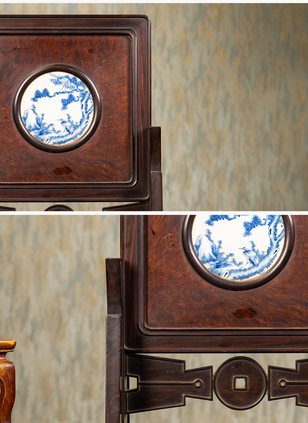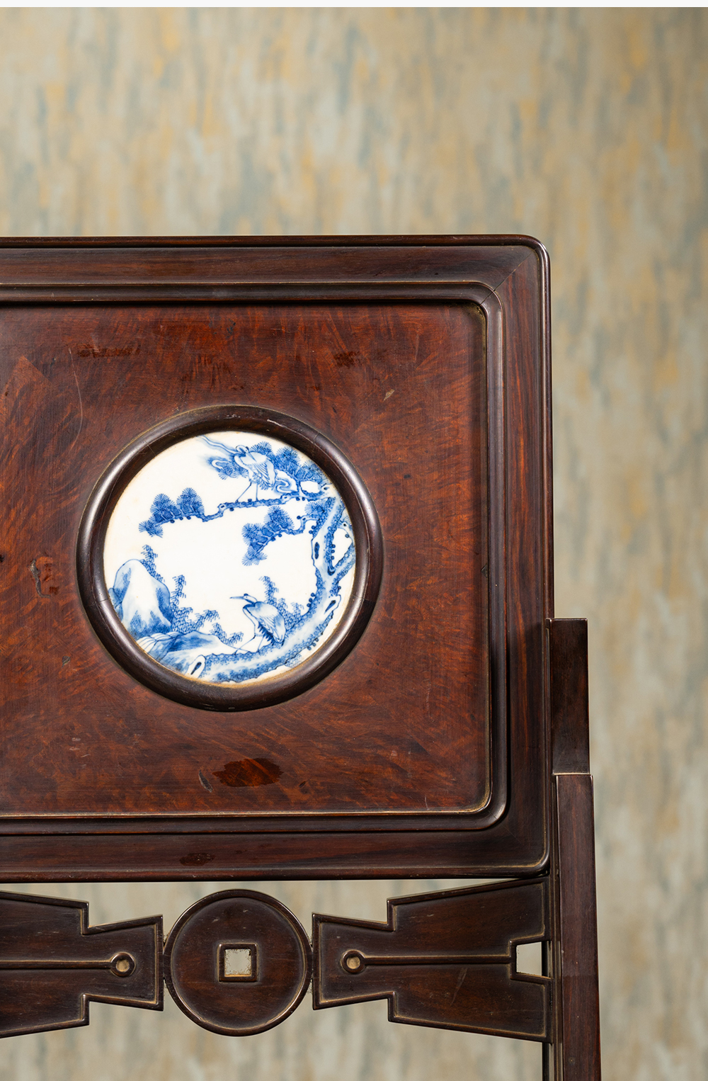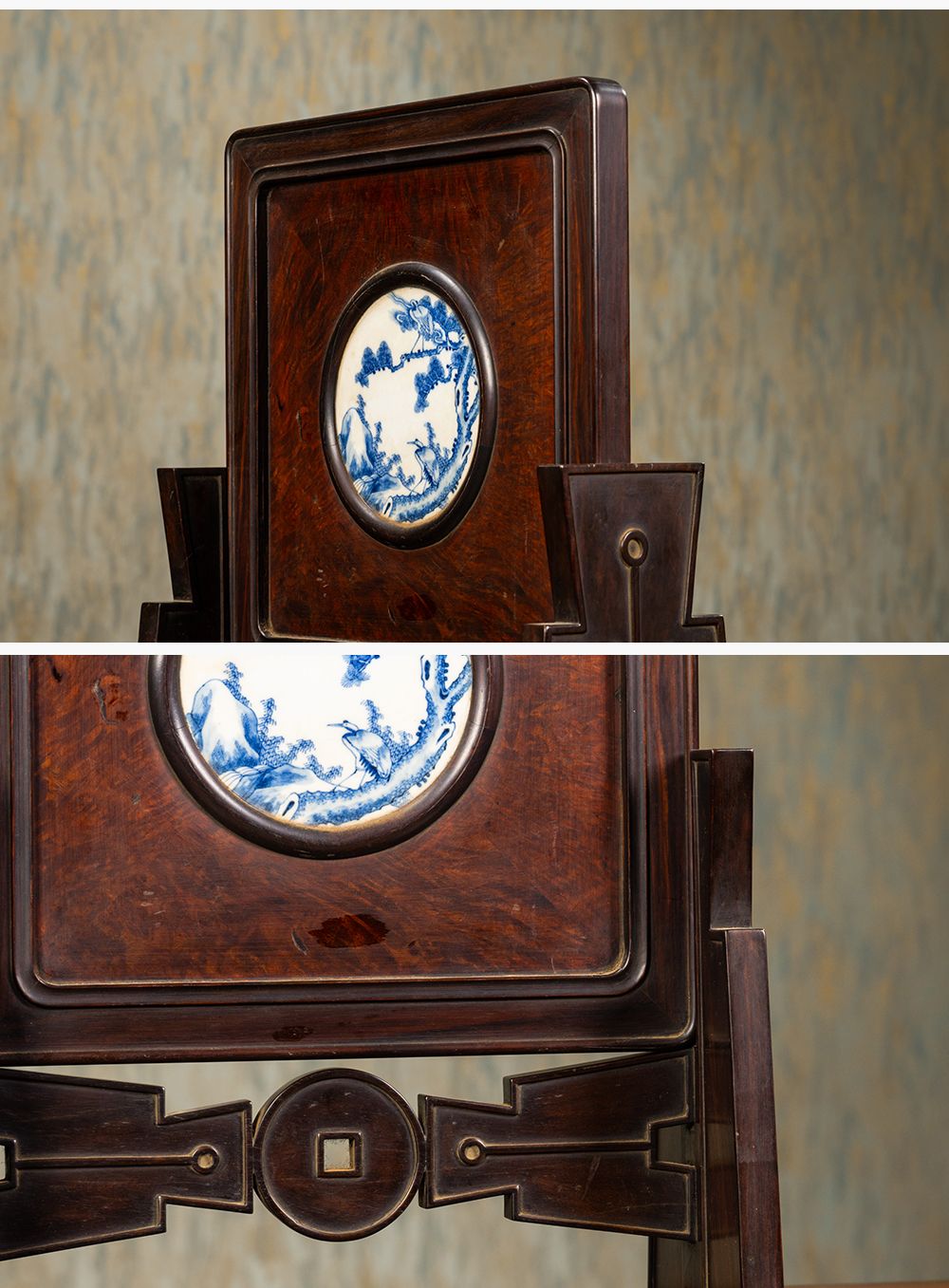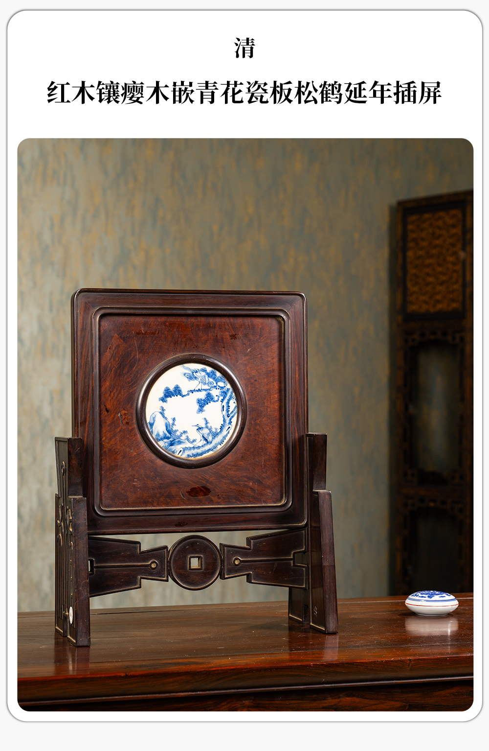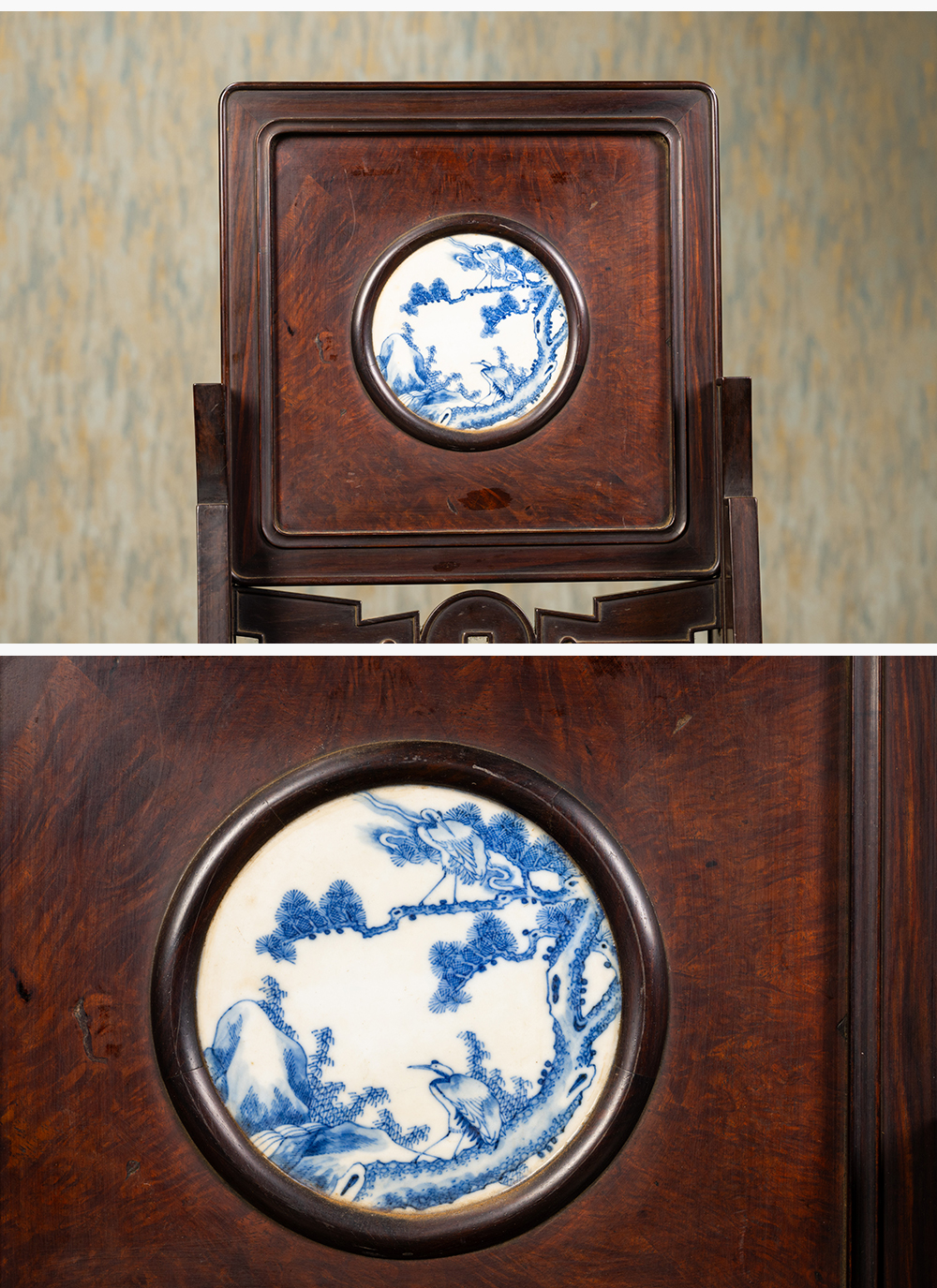 清 红木镶瘿木嵌青花瓷板松鹤延年插屏