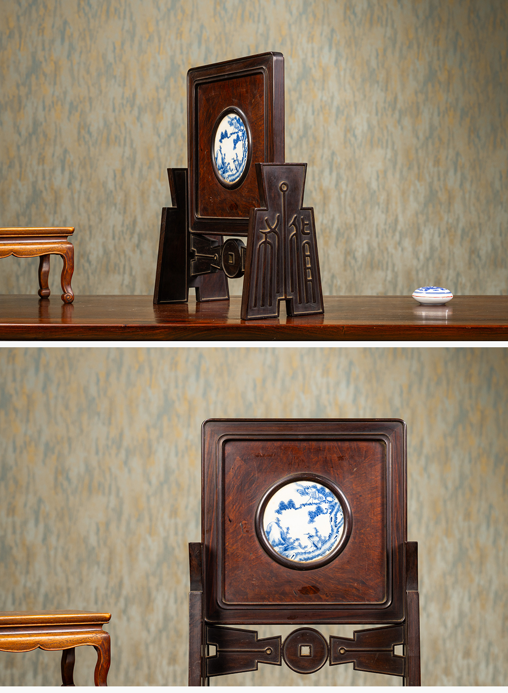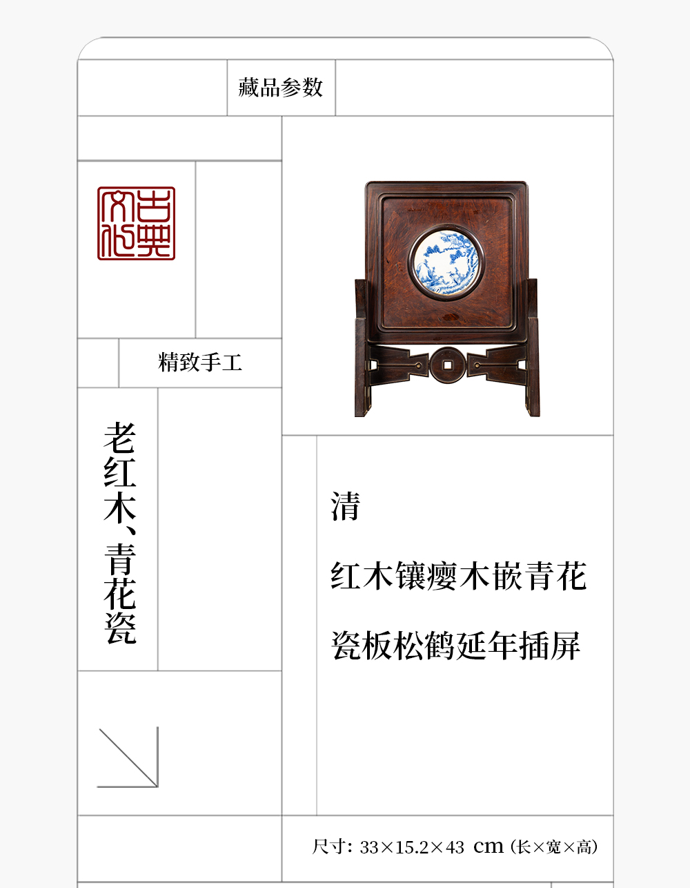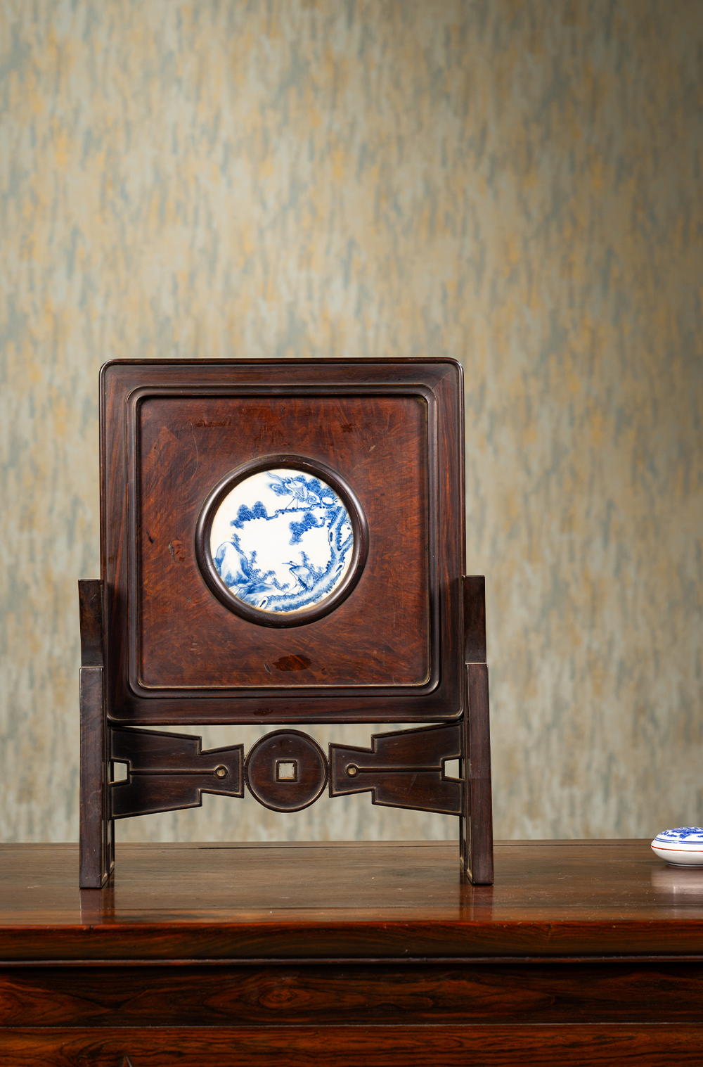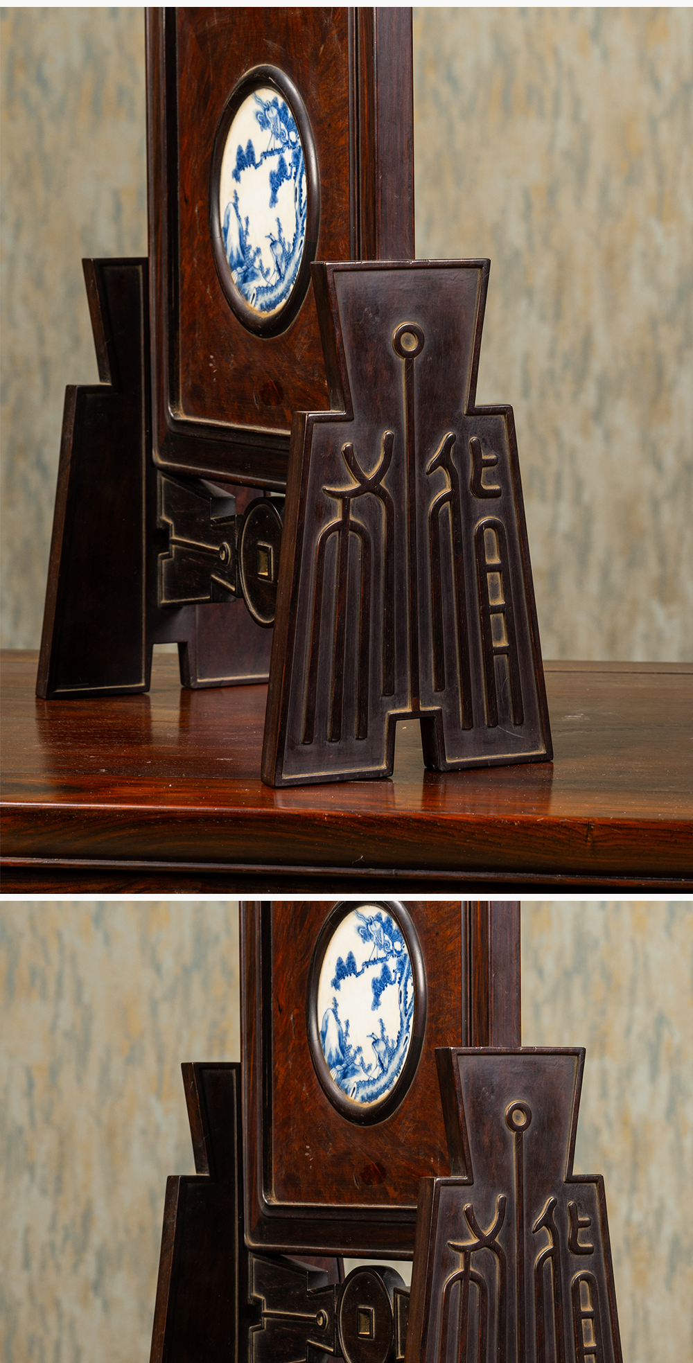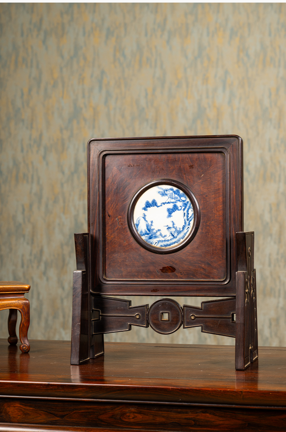 清 红木镶瘿木嵌青花瓷板松鹤延年插屏