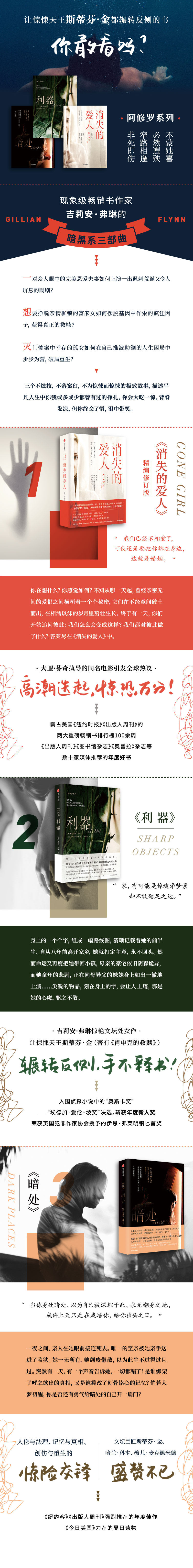 2006年出版的处女作《利器》入围“埃德加·爱伦·坡奖”(侦探小说中的“奥斯卡奖”)决选,斩获年度新人奖;荣获英国犯罪作家协会授予的伊恩·弗莱明钢匕首奖。2009年出版的《暗处》、2012年出版的《消失的爱人》双双荣登《纽约时报》畅销书榜,《消失的爱人》更是霸占美国《纽约时报》《出版人周刊》的两大重磅畅销书排行榜100余周。文坛巨匠斯蒂芬•金、哈兰•科本、薇儿•麦克德米德等均盛赞她深厚的写作功底。从某种意义上说,作者不仅是在构思一部部扣人心弦、让人欲罢不能的小说,更是在提出一道道关于成长、家庭、婚姻的道德辩题,发人深省。