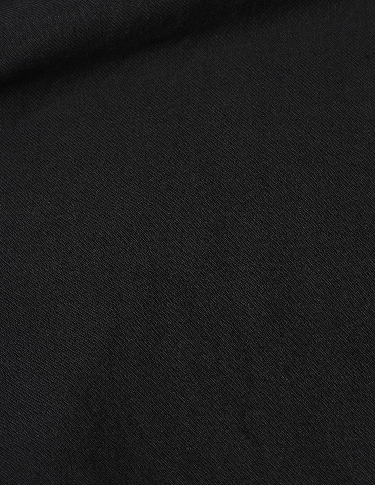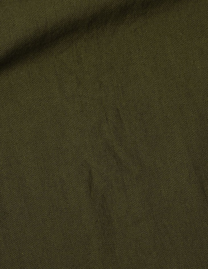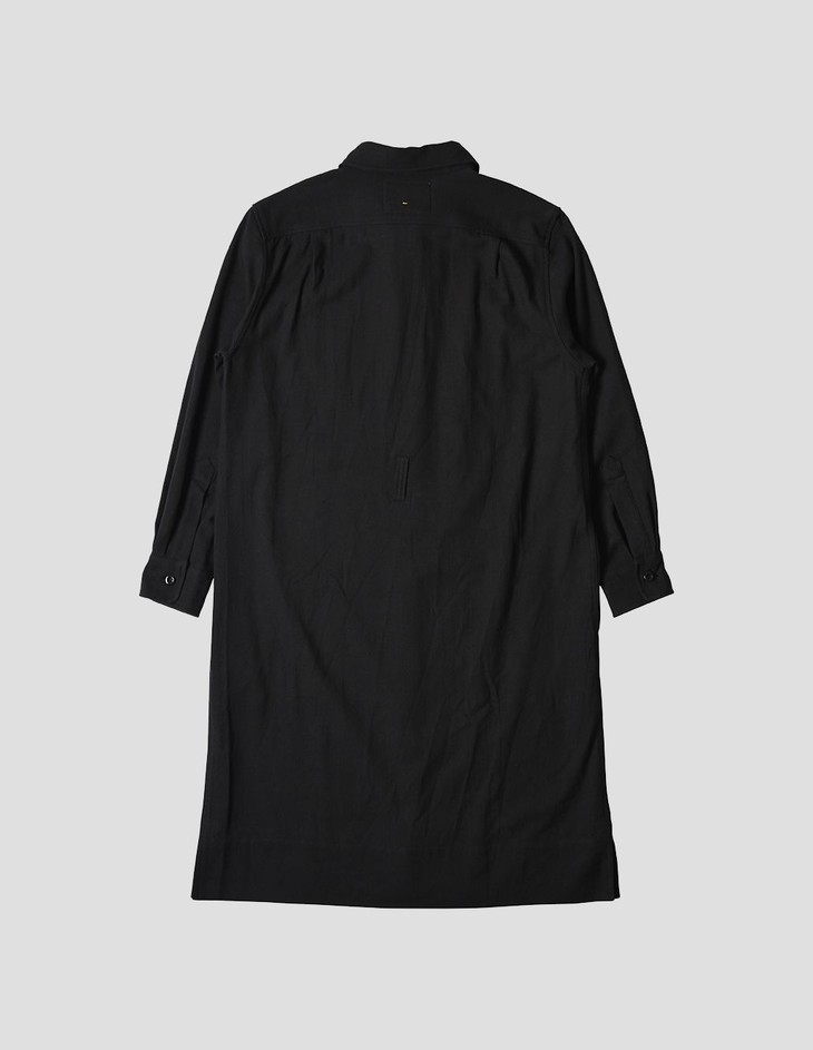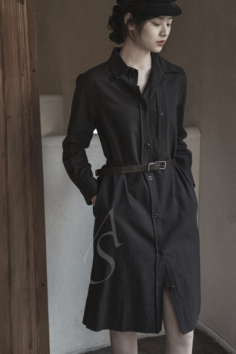 采用棉、亚麻及羊毛混织,面料呈现微妙的磨砂质感,亲肤而富保暖性。裙摆两侧的开衩和胸前直缝口袋打破了整体的平面感,系扣设计搭配腰带穿着更显身形挺拔。现有橄榄绿色、黑色两色可选。