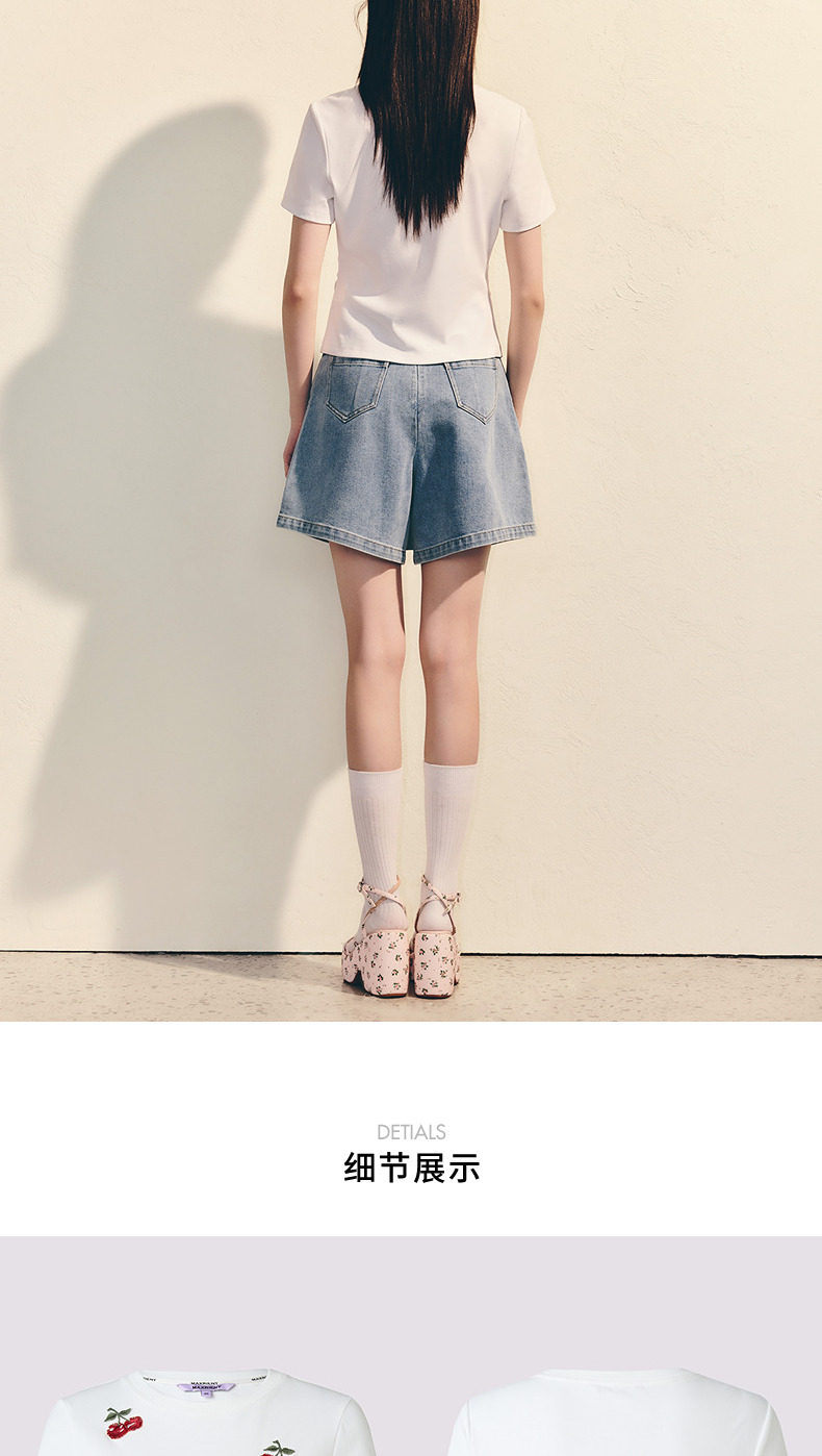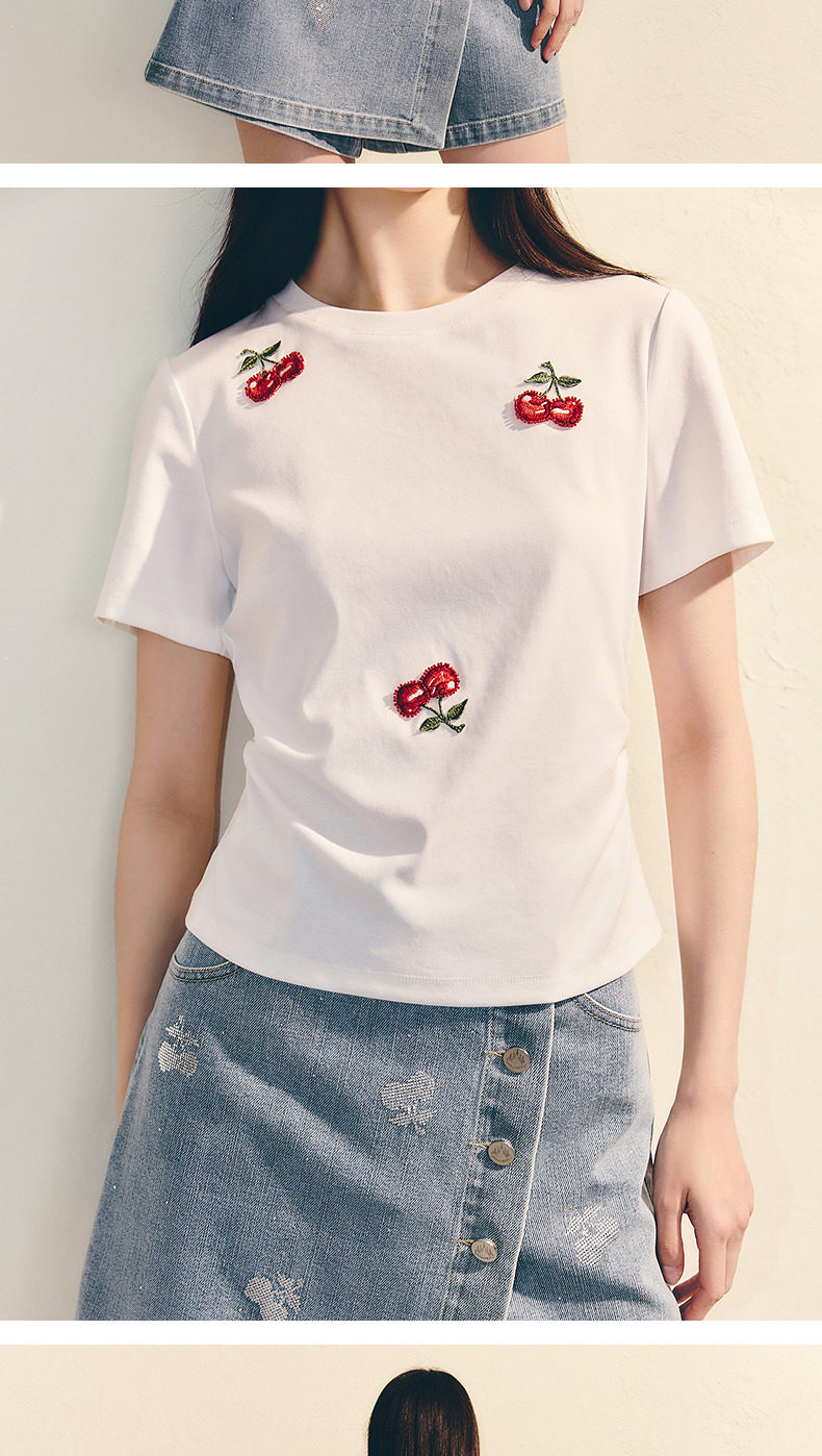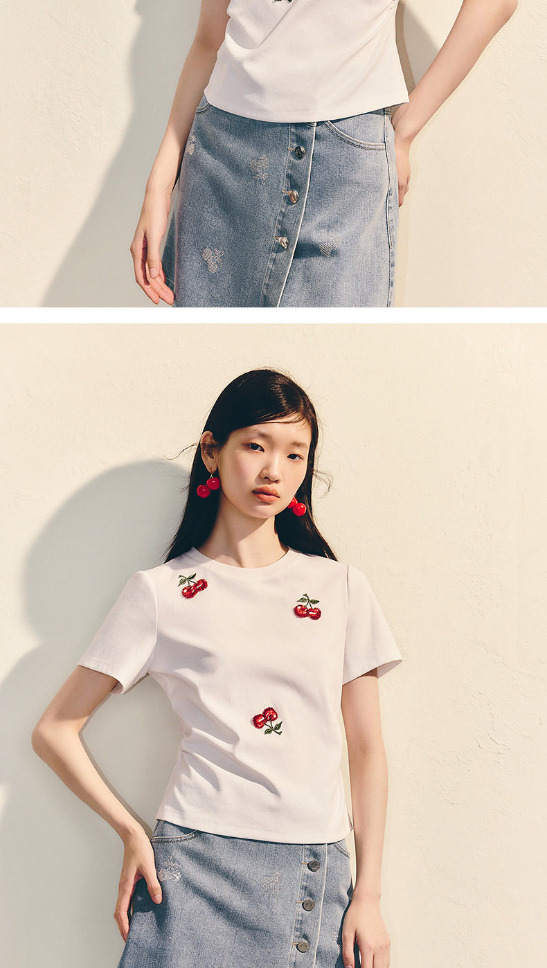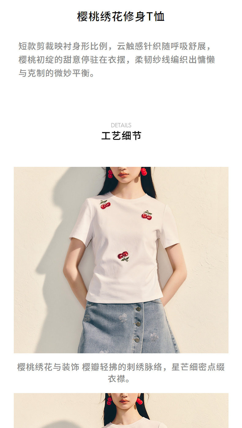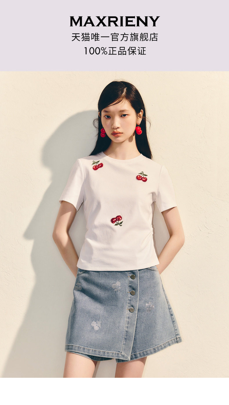 MAXRIENY甜美休闲感短袖圆领T恤2025夏季新款修身显瘦刺绣上衣女(货号:MS86TS014)