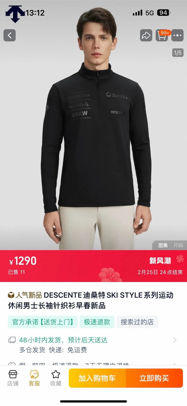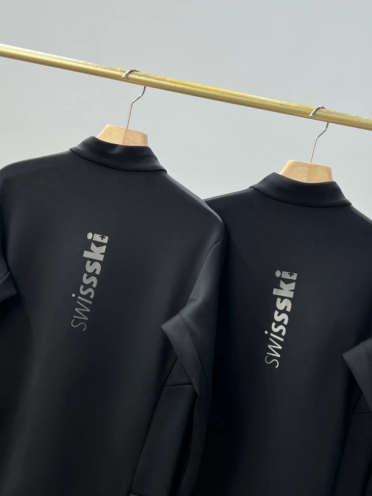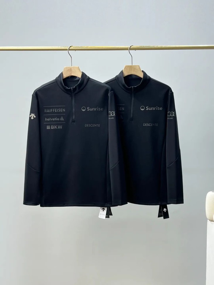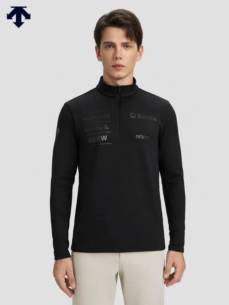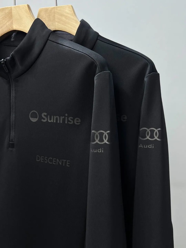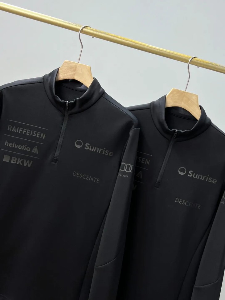 高山滑雪队奥迪合作联名款半高领卫衣在胸前和手臂上的LOGO是合作队赞助商的商标,塑造活力运动潮感。