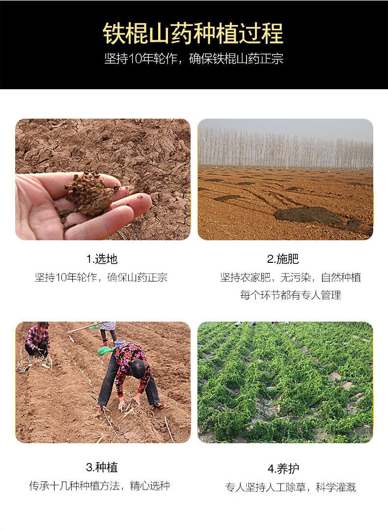 正宗垆土地铁棍山药,一块垆土地9年轮种,收一次山药,需要息养10年,才可以再次耕种。铁棍山药非常费地,能长到地下一米左右,身上的根毛孔还很粗大,使劲生长,汲取着地下的矿物质元素和精华!