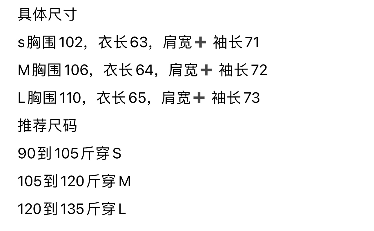 s胸围102,衣长63,肩宽➕袖长71