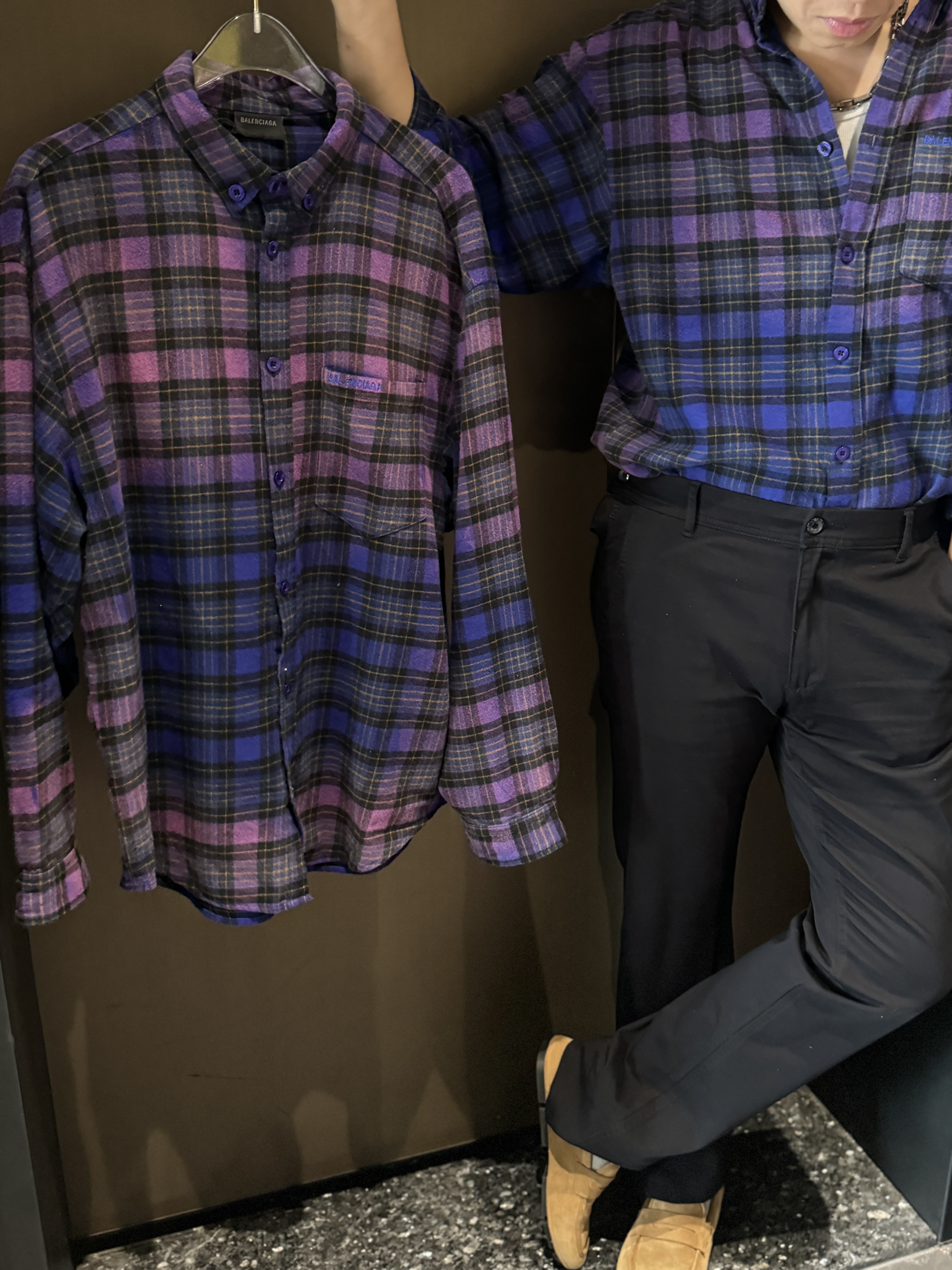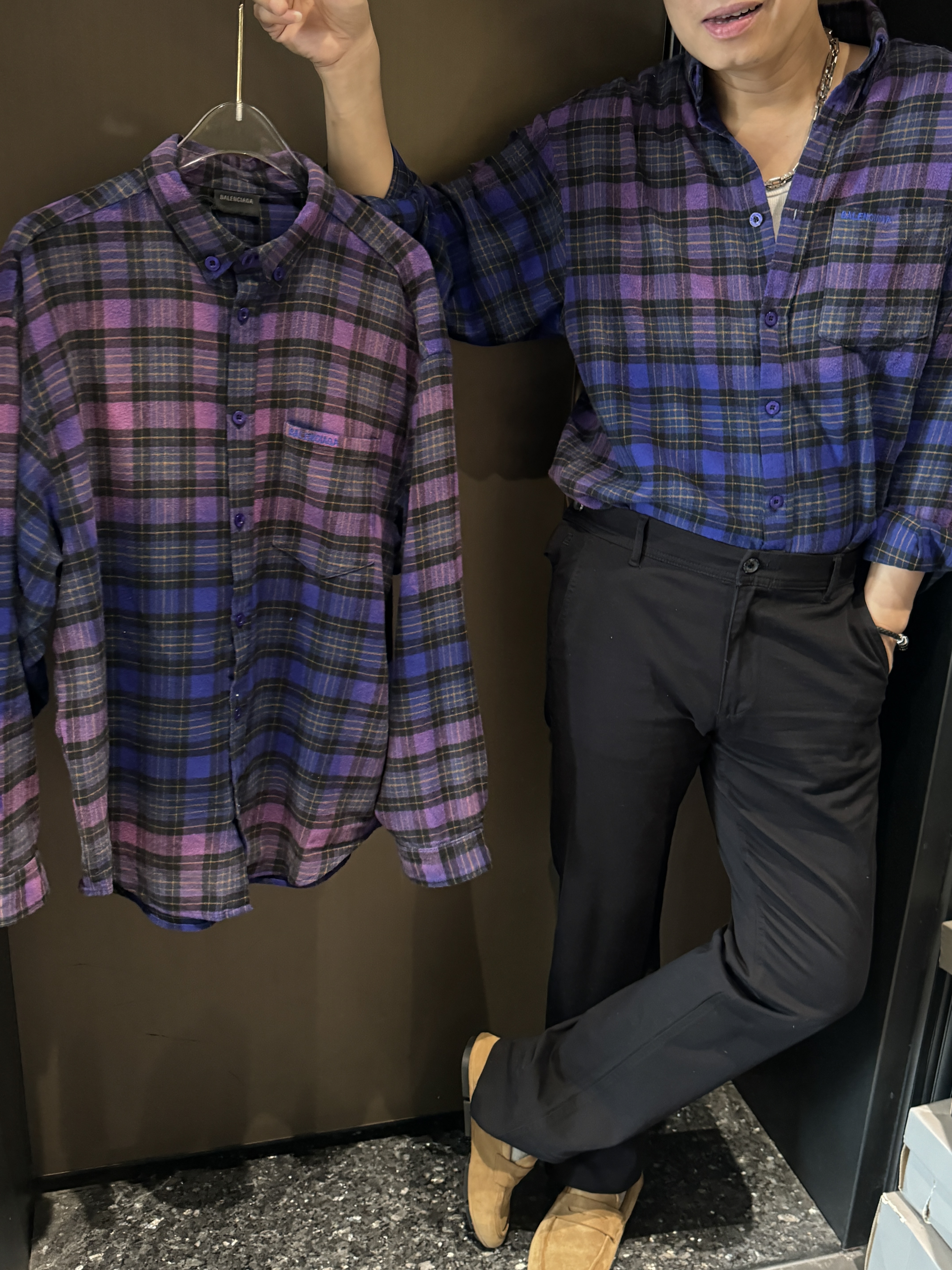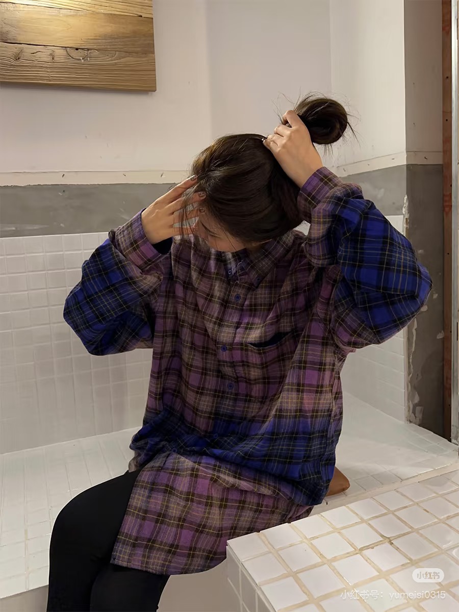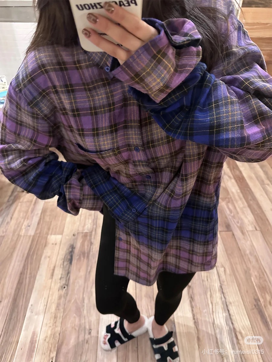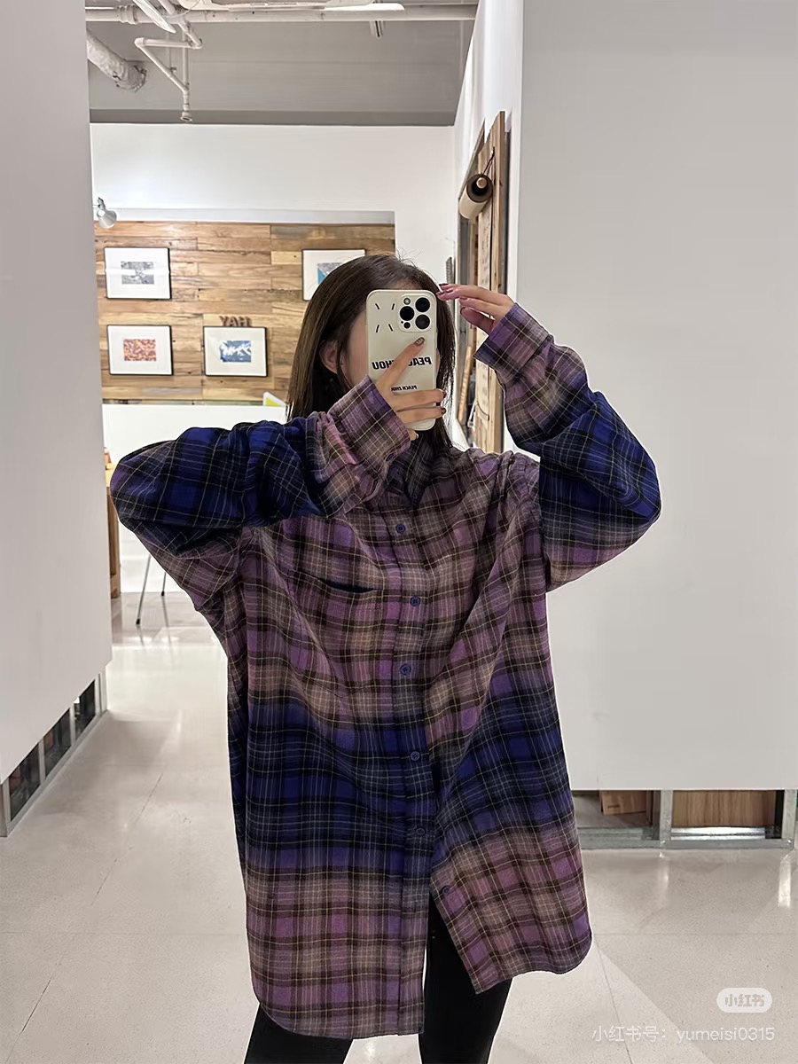 巴家新款|幻紫渐变格纹衬衫|颠覆经典 一眼入魂 高街玩家必入!Balenciaga 2025 秋冬重磅格纹衬衫,颠覆传统审美!【高定级面料】—— 指尖触碰即知阶级 采用意大利磨毛精棉混纺,表面呈现微绒雾面质感,每平方英寸经纬纱线加密20% ✅ 纽扣暗刻浮雕logo,指甲划过能感受到凹凸纹路!面料采用定织定染原版同款100%全面格子面料 手感柔软 上身质感十足垂感极佳