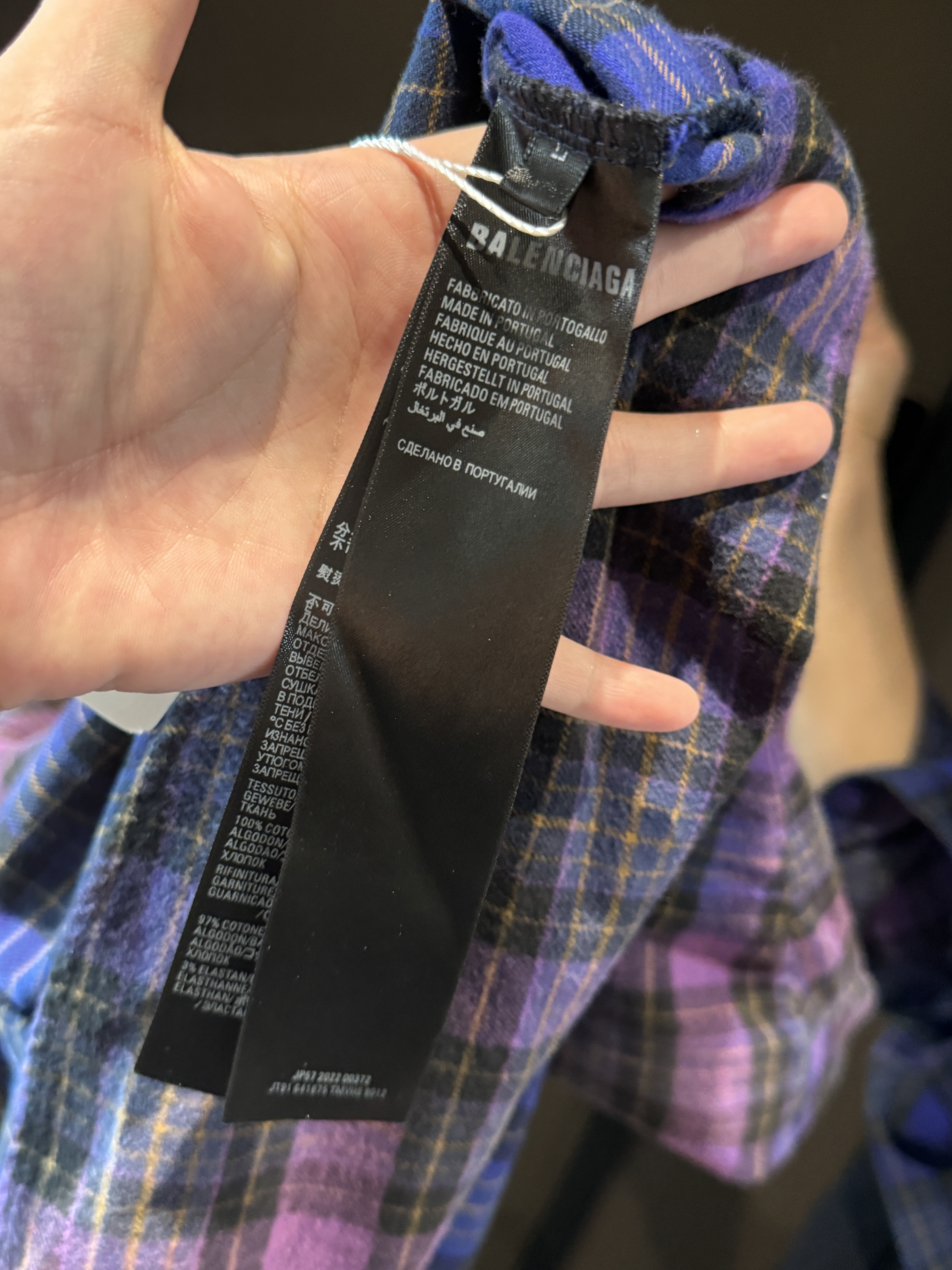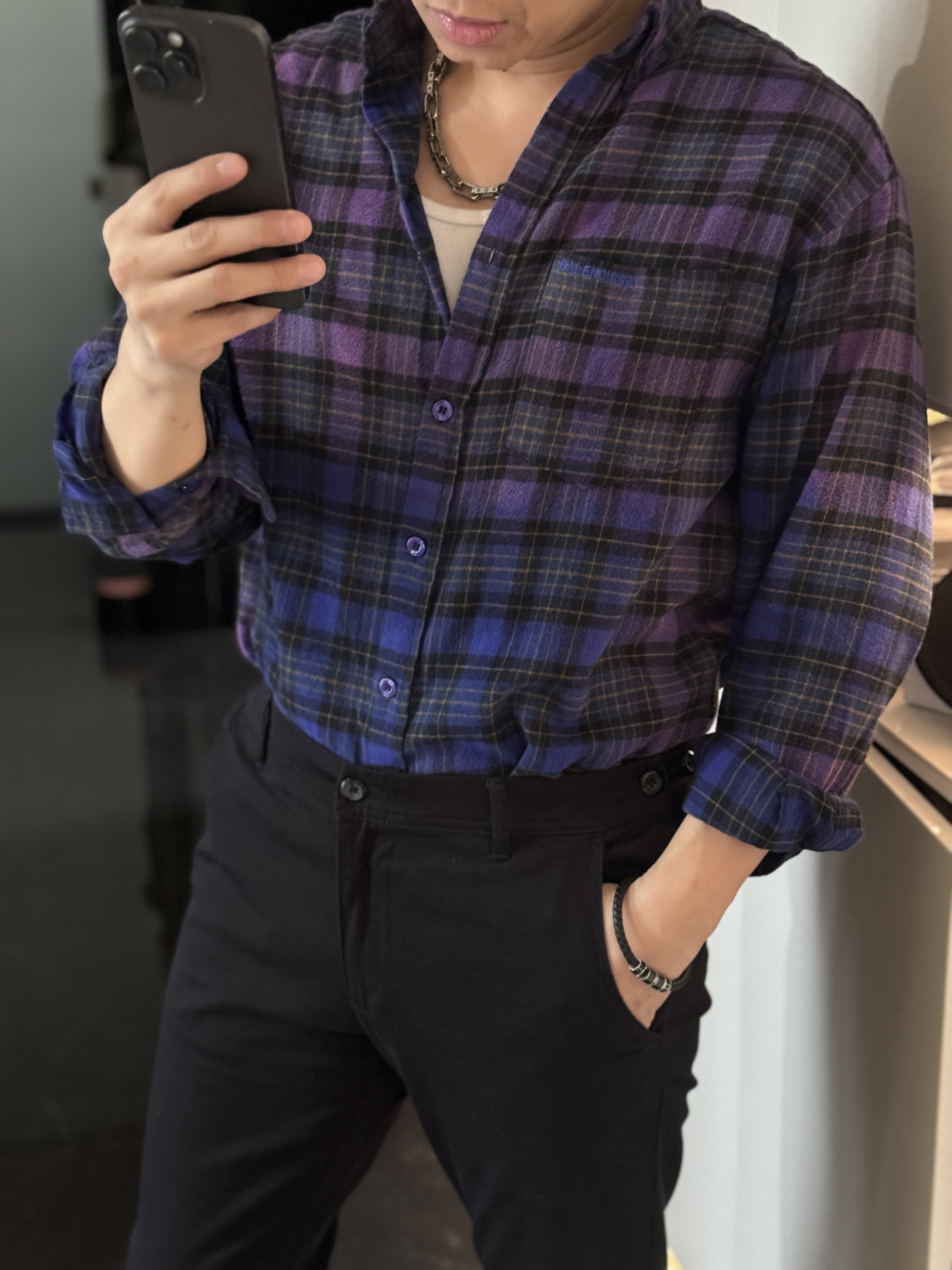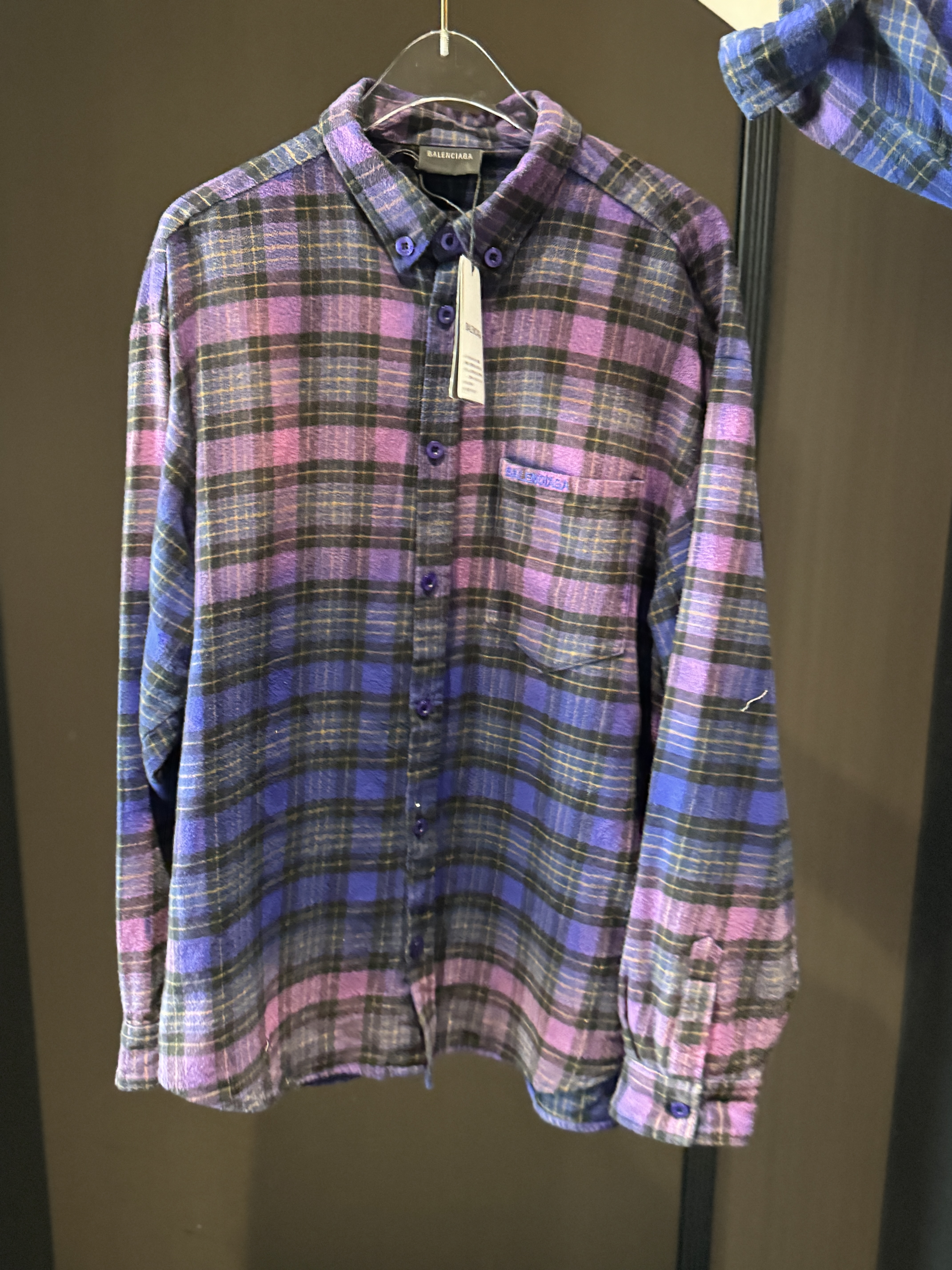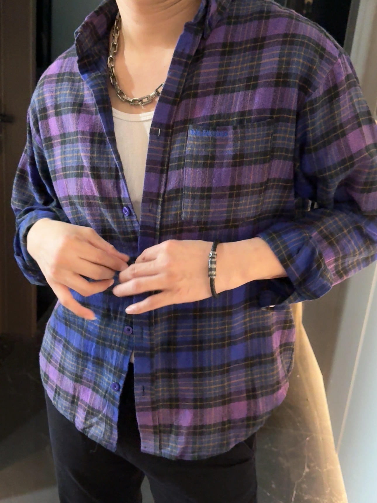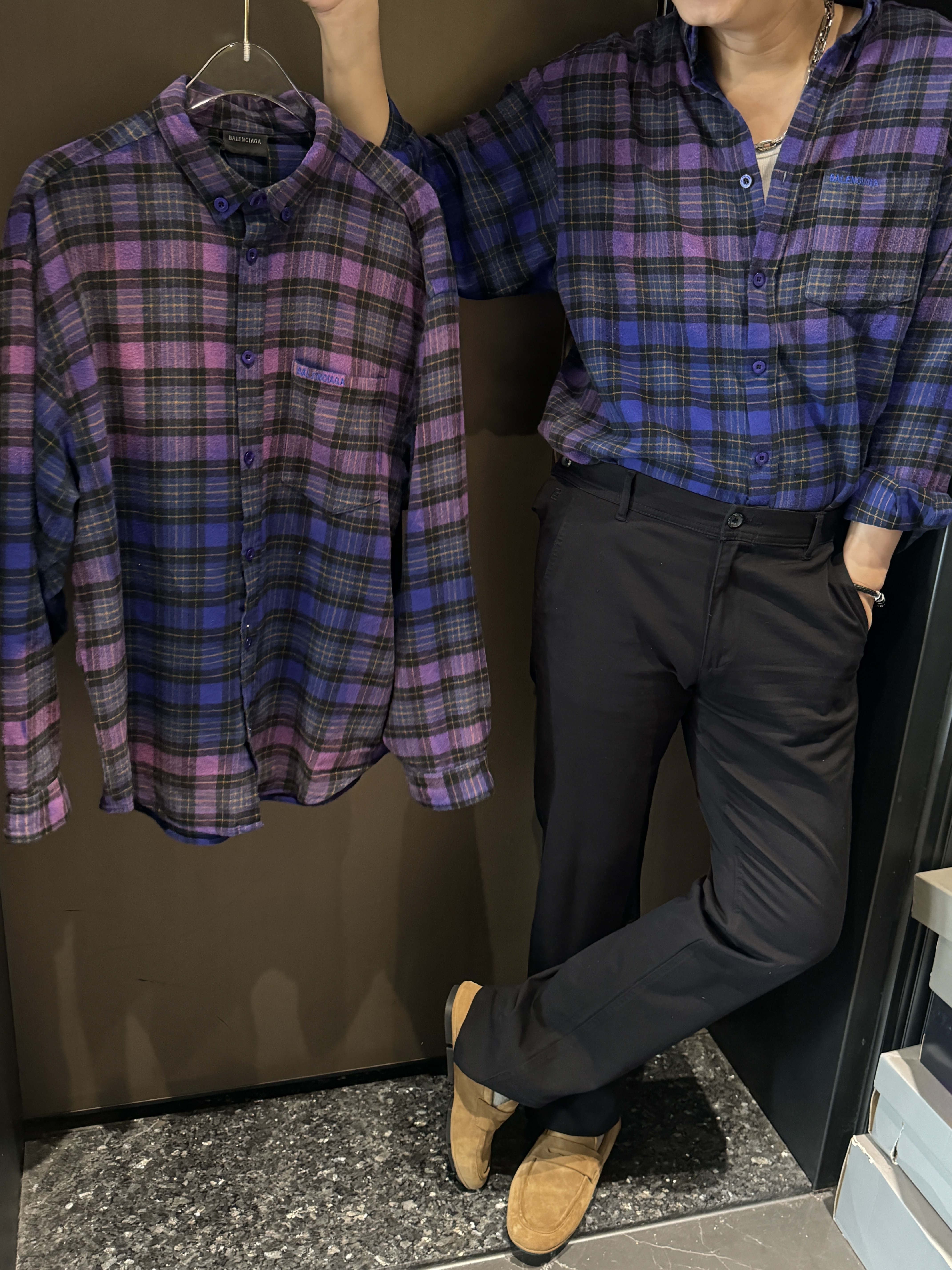 巴家新款|幻紫渐变格纹衬衫|颠覆经典 一眼入魂 高街玩家必入!Balenciaga 2025 秋冬重磅格纹衬衫,颠覆传统审美!【高定级面料】—— 指尖触碰即知阶级 采用意大利磨毛精棉混纺,表面呈现微绒雾面质感,每平方英寸经纬纱线加密20% ✅ 纽扣暗刻浮雕logo,指甲划过能感受到凹凸纹路!面料采用定织定染原版同款100%全面格子面料 手感柔软 上身质感十足垂感极佳
