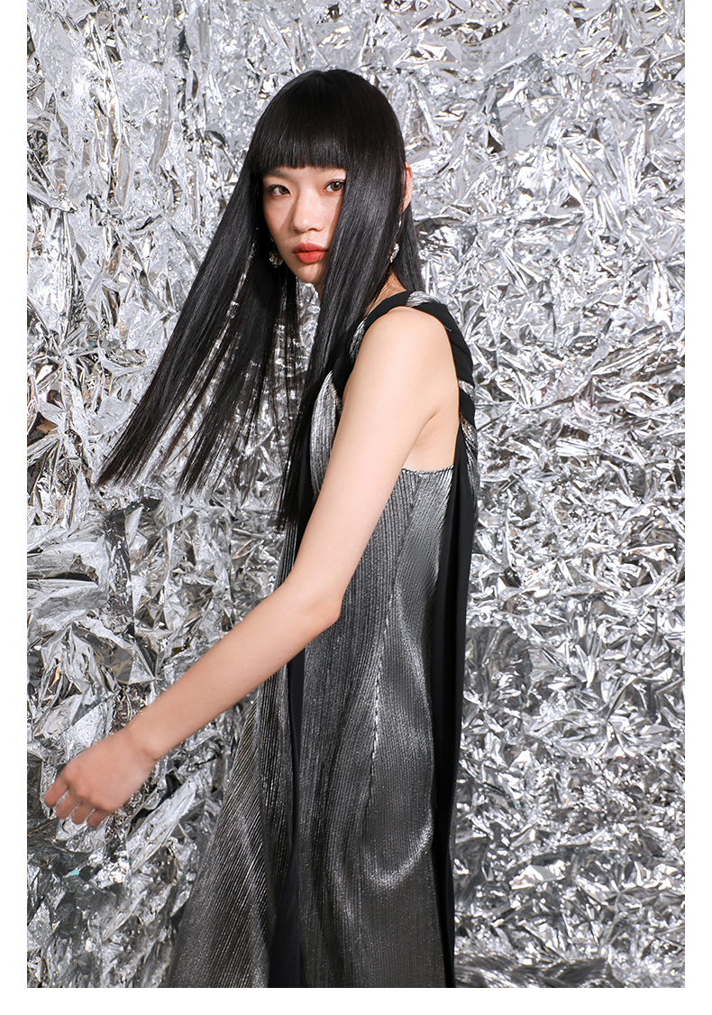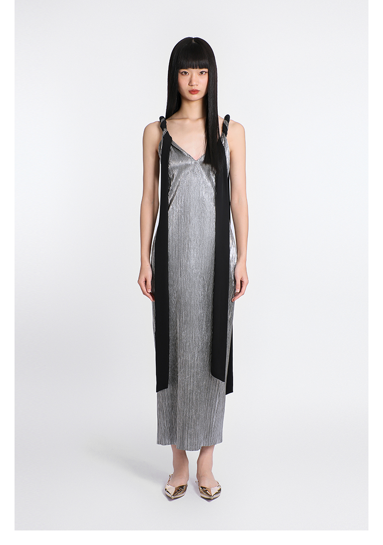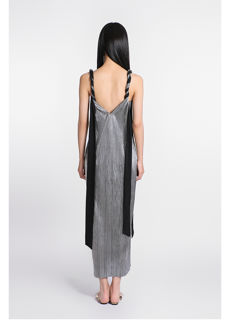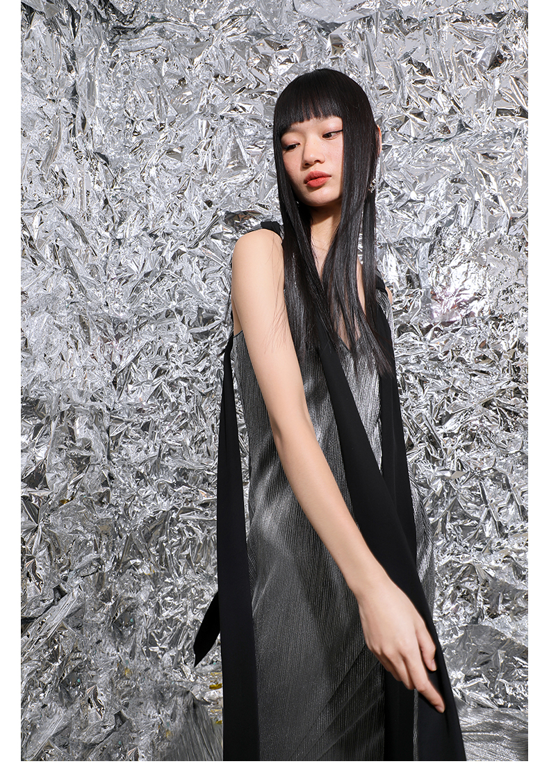 【浮华梦】肩部交织飘带金属感大V领长款连衣裙/0000786A
