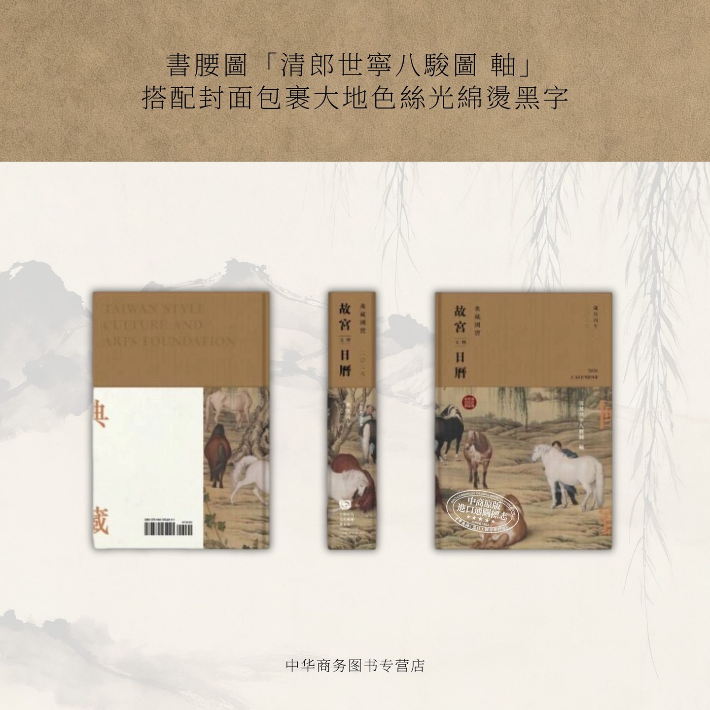 版式和尺寸上,32開本、130x190m、圓背精裝,書腰圖「清郎世寧八駿圖 軸」,搭配封面包裹大地色絲光綿燙黑字,顯溫暖高雅質感、古情新意。