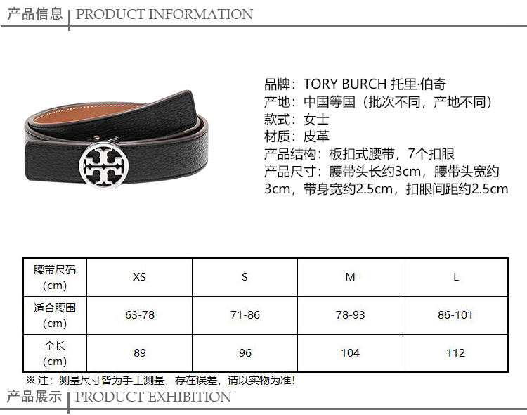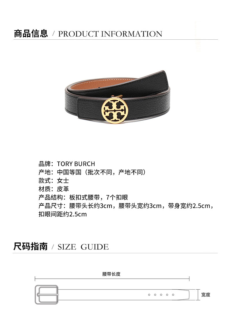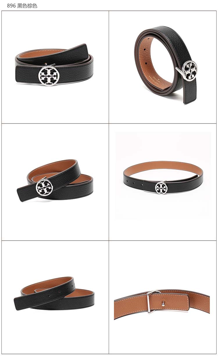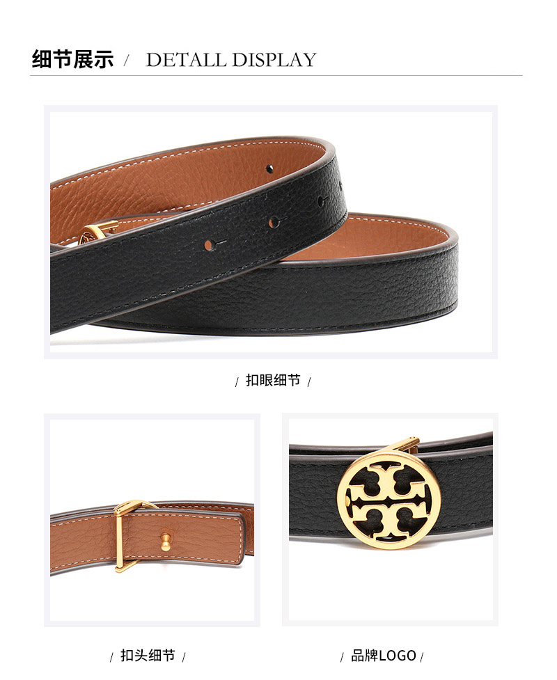 Tory Burch/汤丽柏琦 女士黑色棕色皮革双T金色板扣式双面皮带腰带 56643