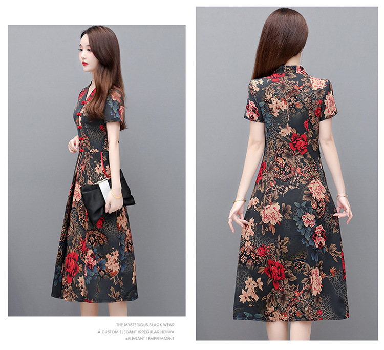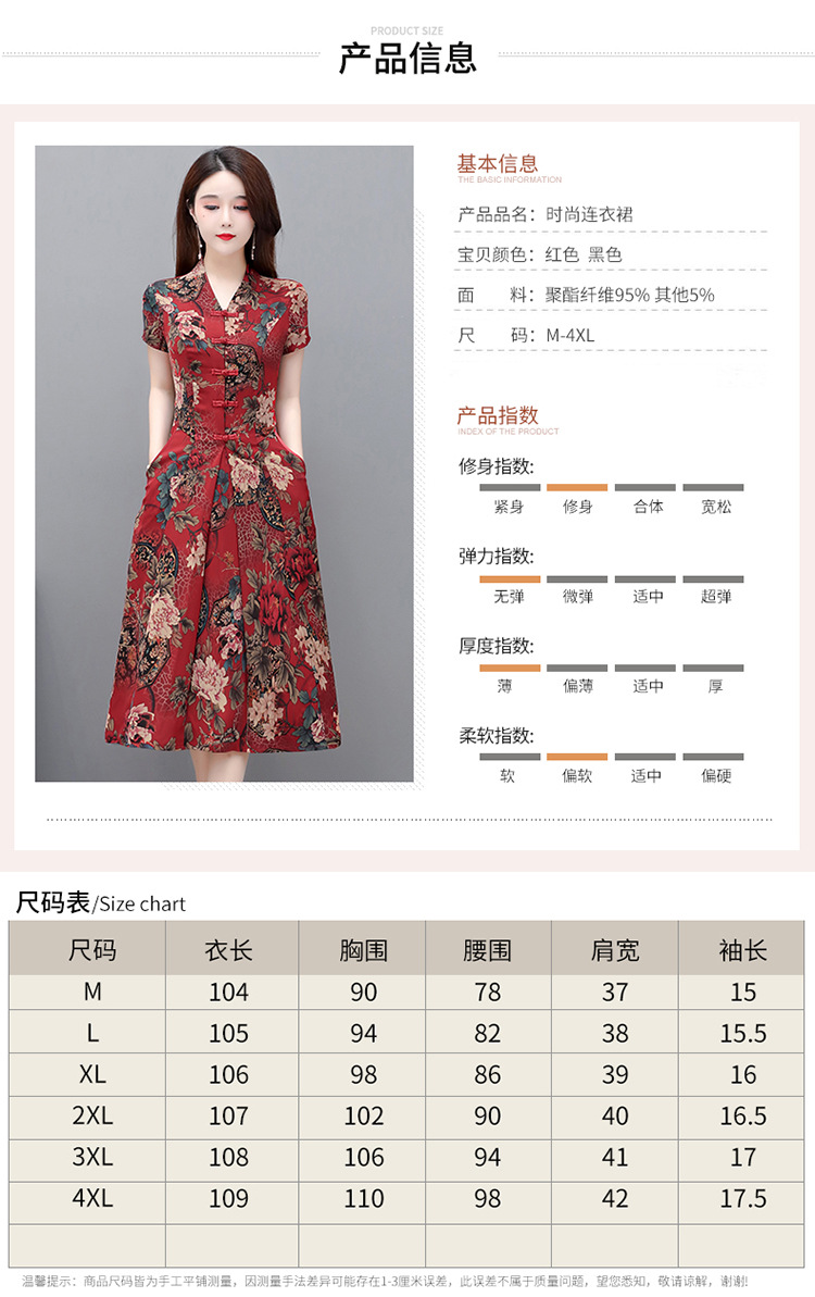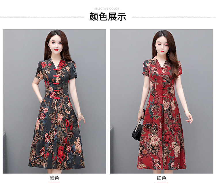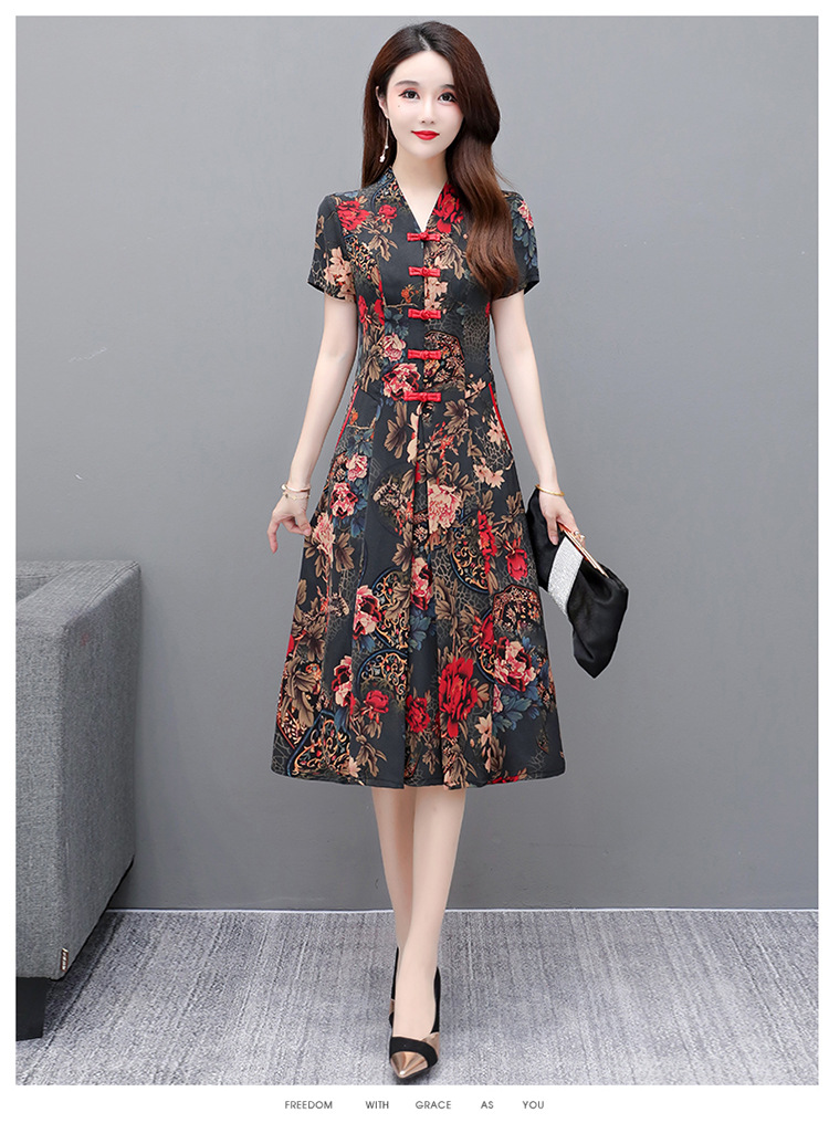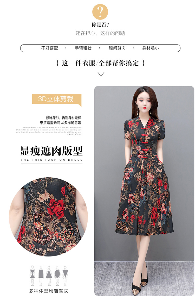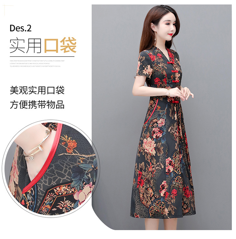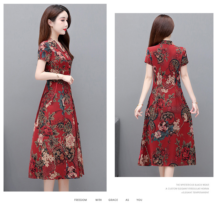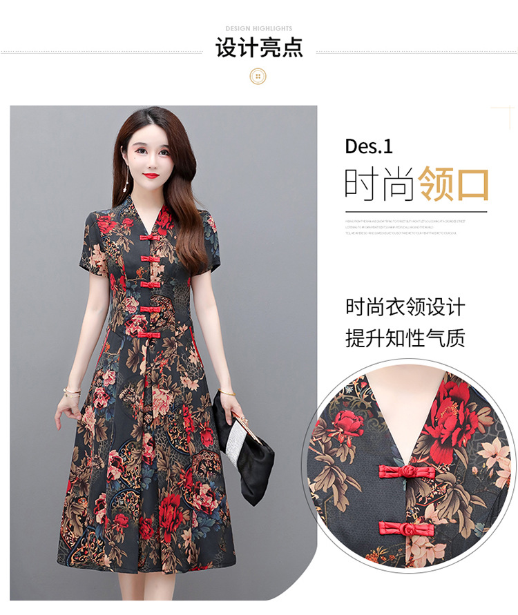 复古优雅,夏款印花中长款时尚A字裙V领短袖修身气质连衣裙QYM-XYKL-134-L