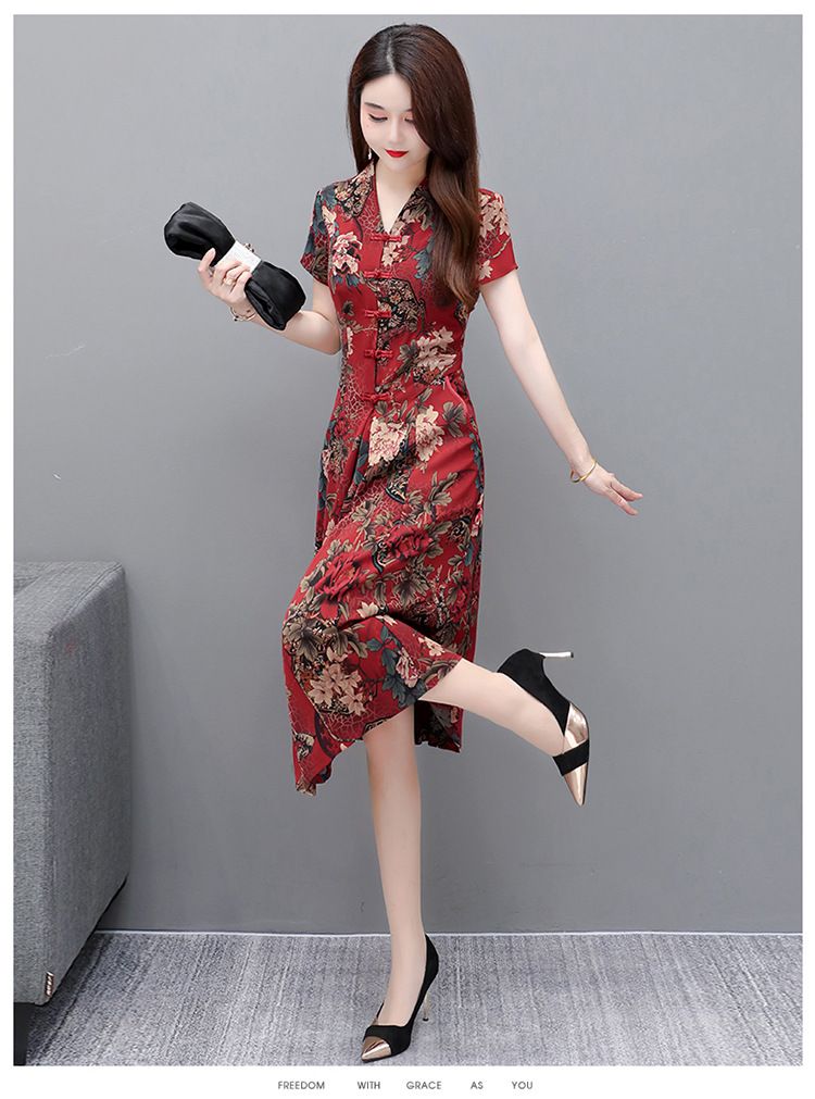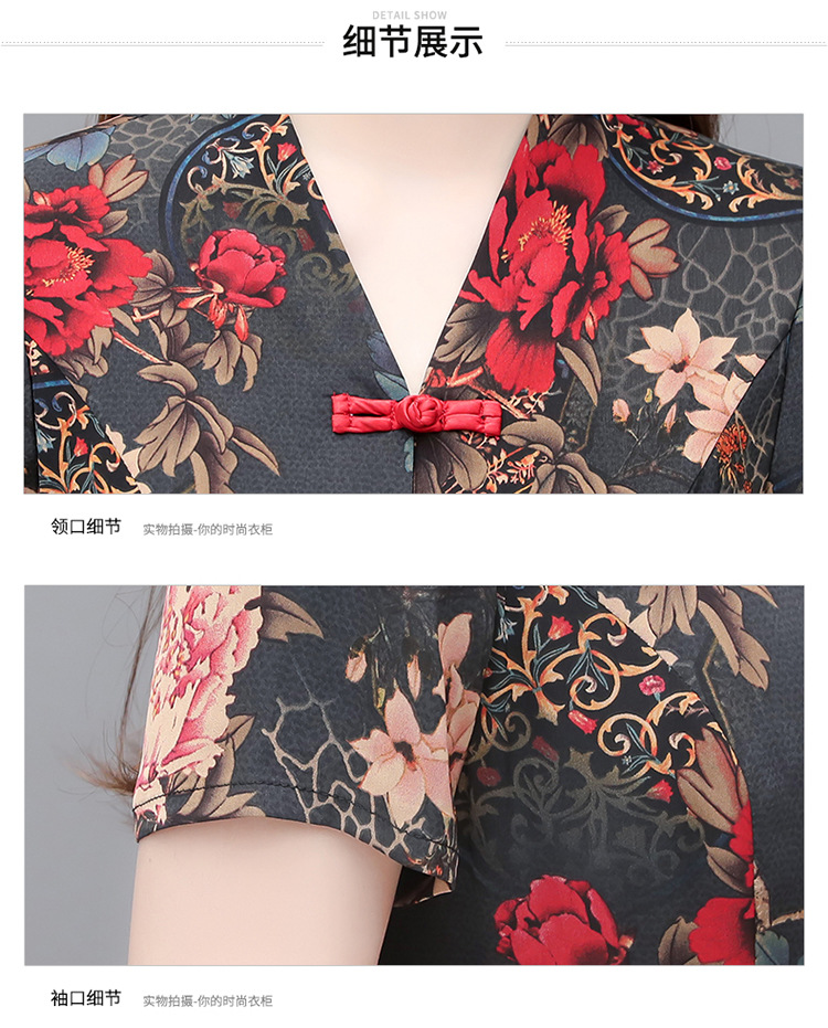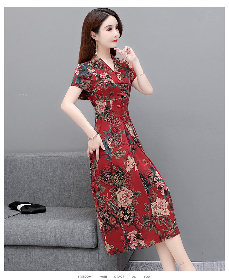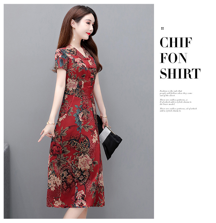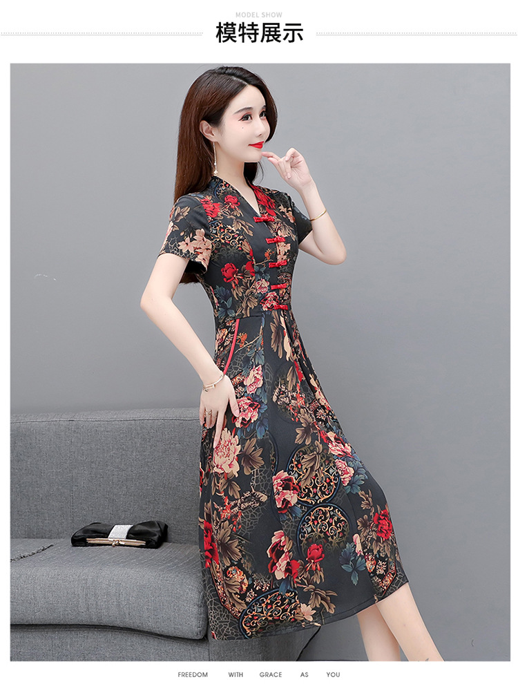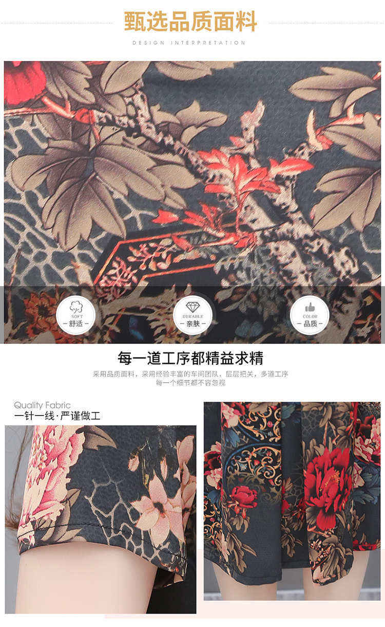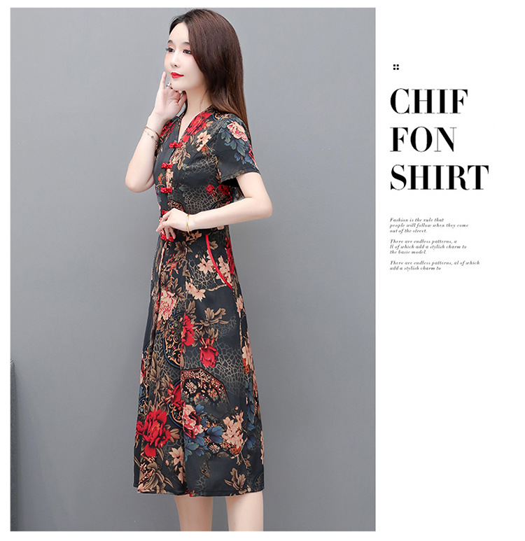 复古优雅,夏款印花中长款时尚A字裙V领短袖修身气质连衣裙QYM-XYKL-134-L