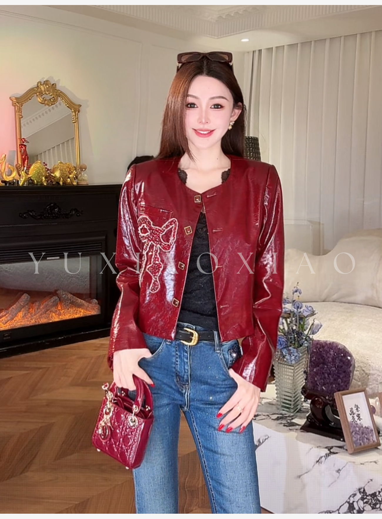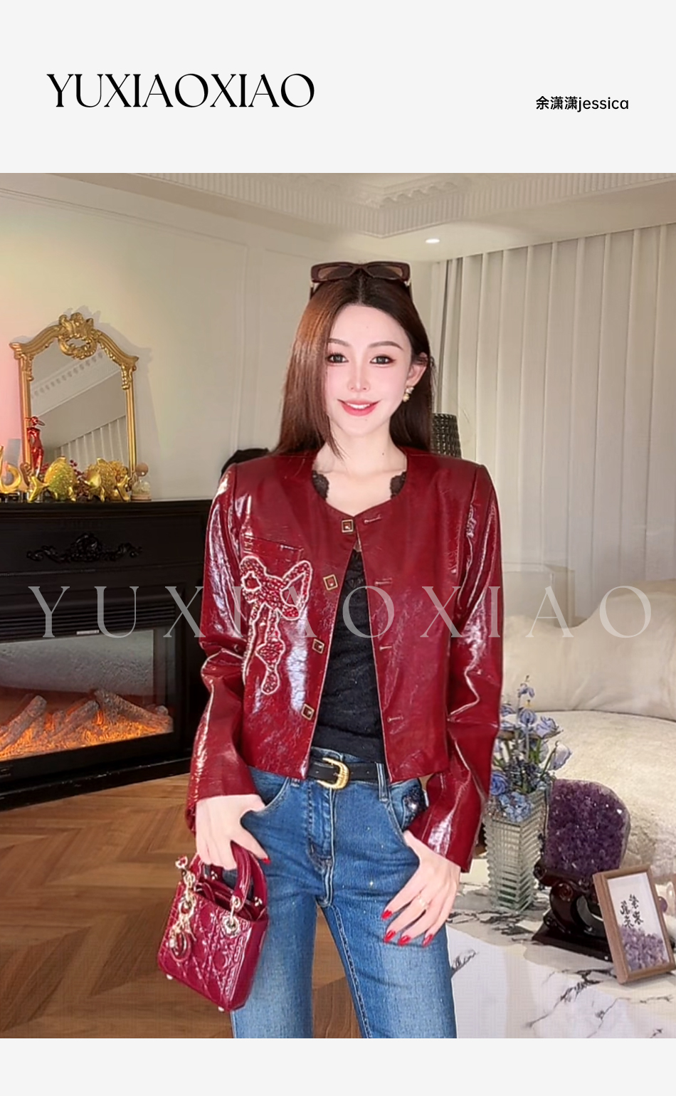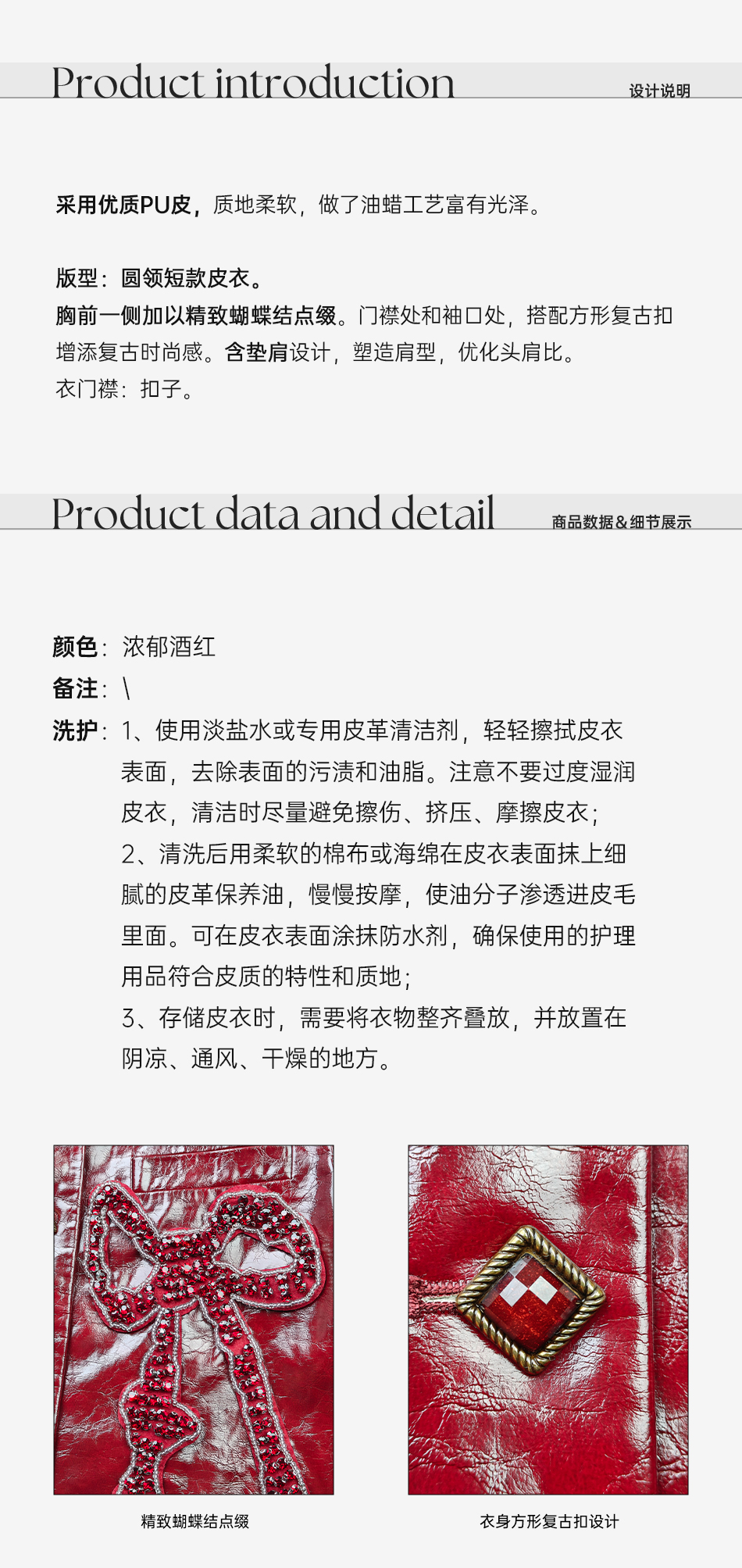 余潇潇【红宝石机车】复古时尚感精致蝴蝶结油蜡工艺圆领皮衣外套