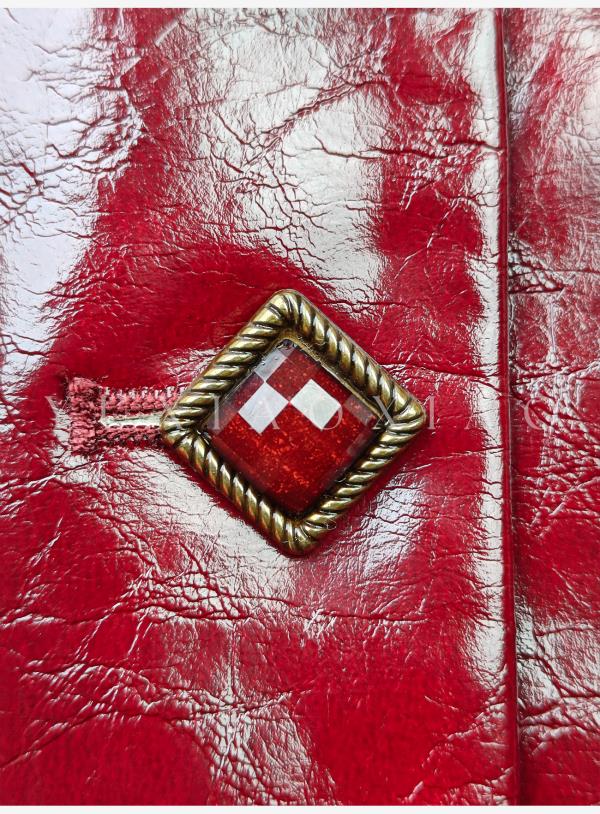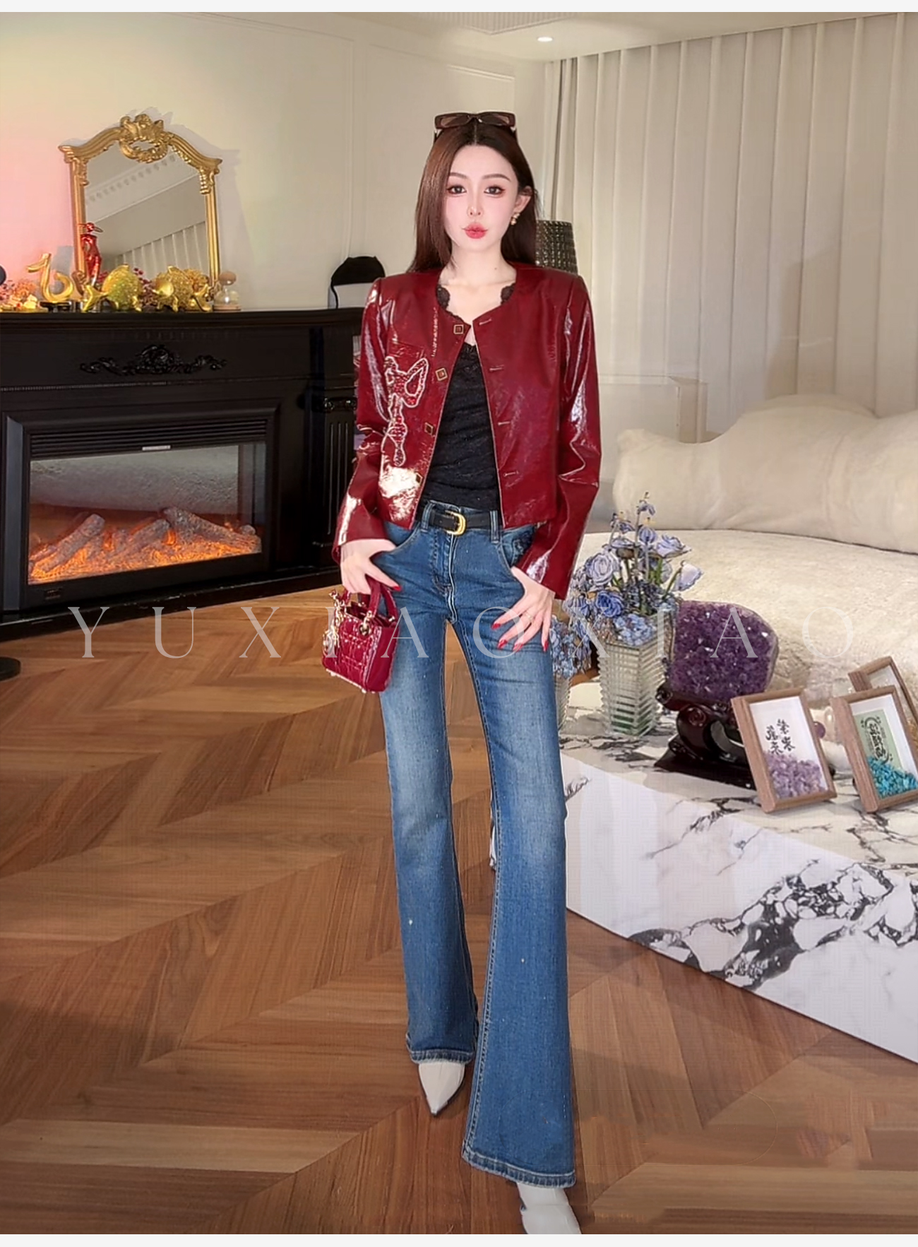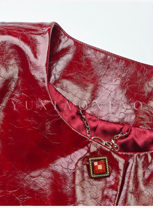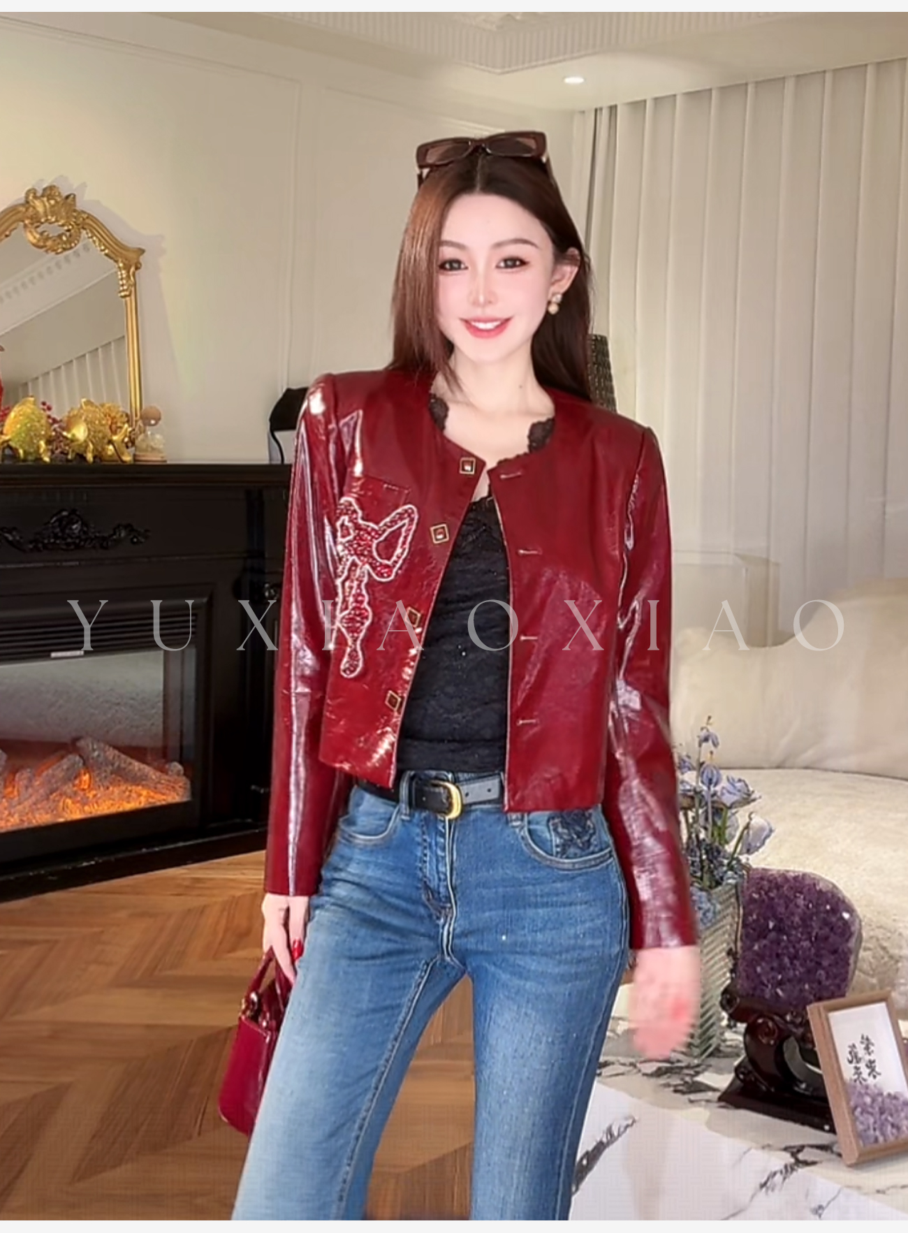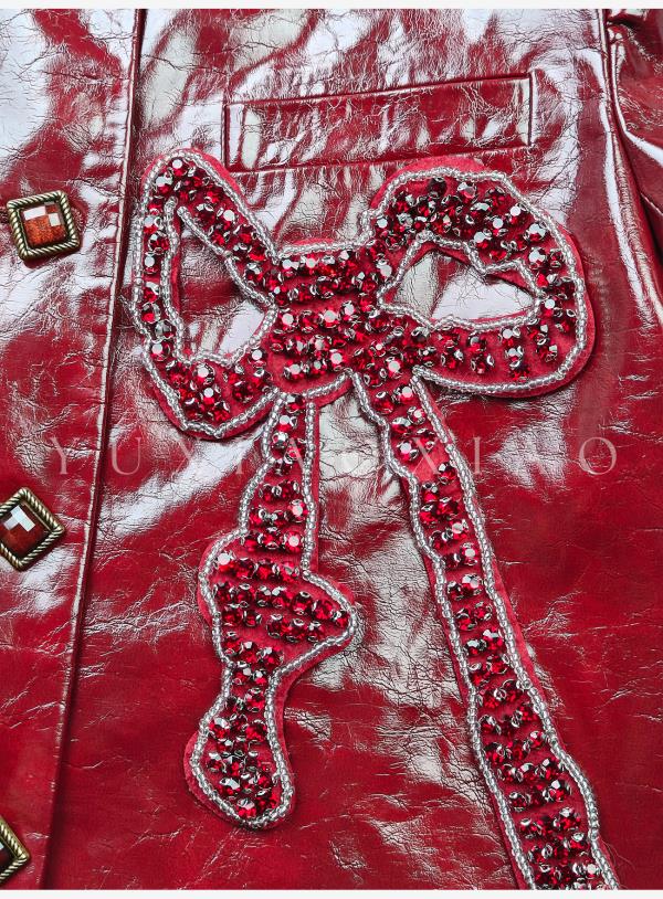 余潇潇【红宝石机车】复古时尚感精致蝴蝶结油蜡工艺圆领皮衣外套