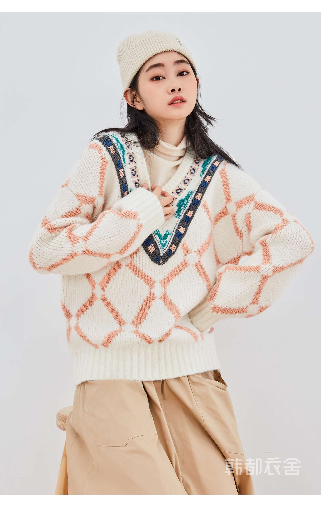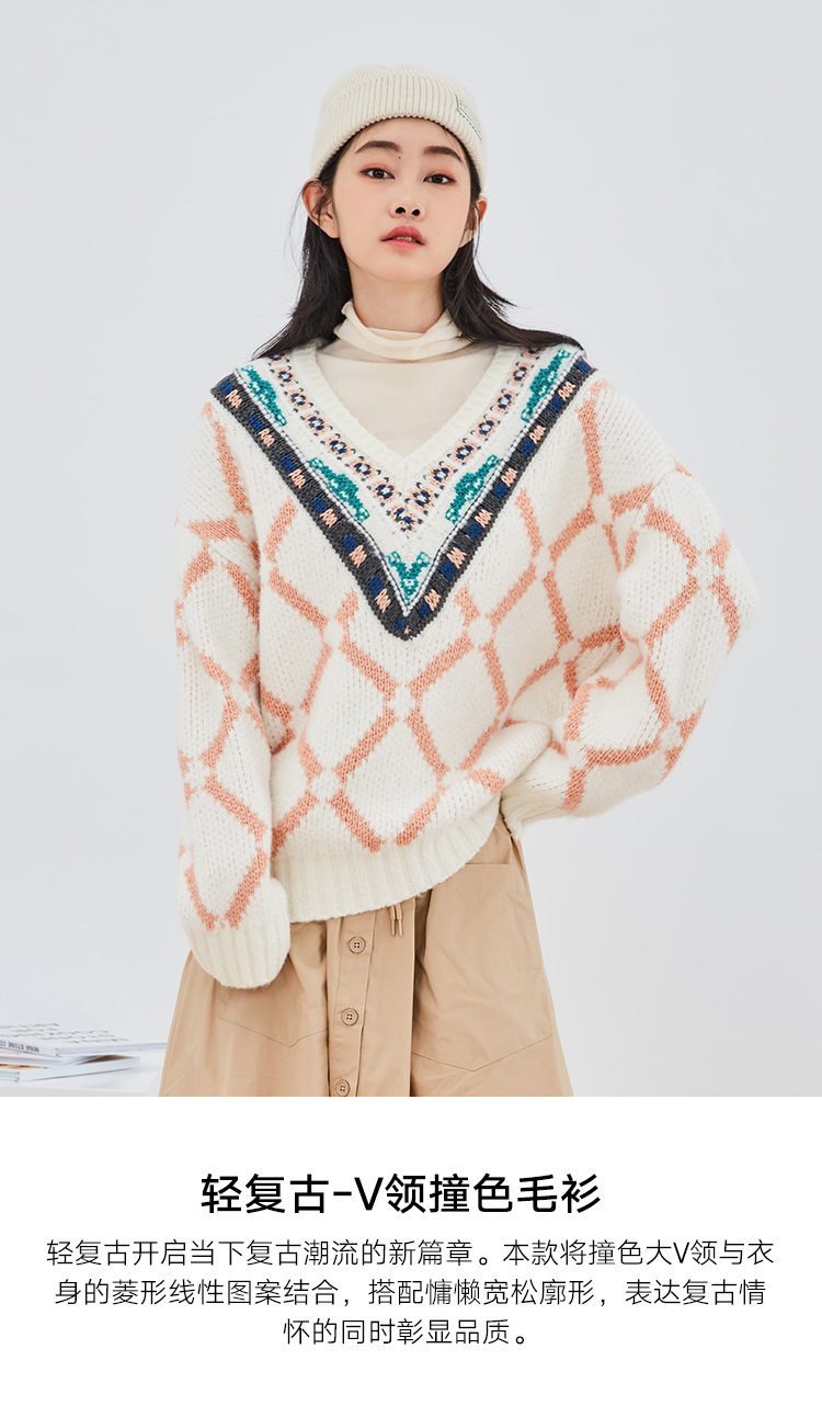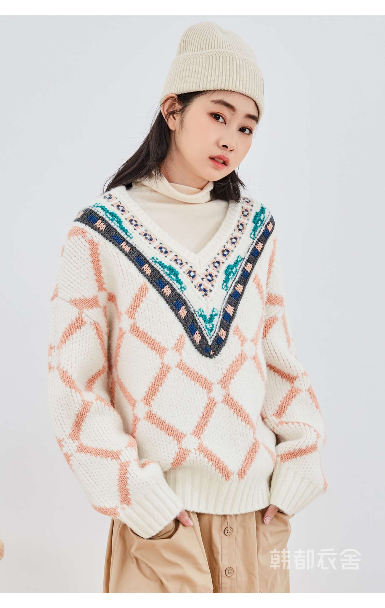 韩都衣舍2021春新款复古撞色毛衫大V领宽松学生毛针织衫女GQ11062