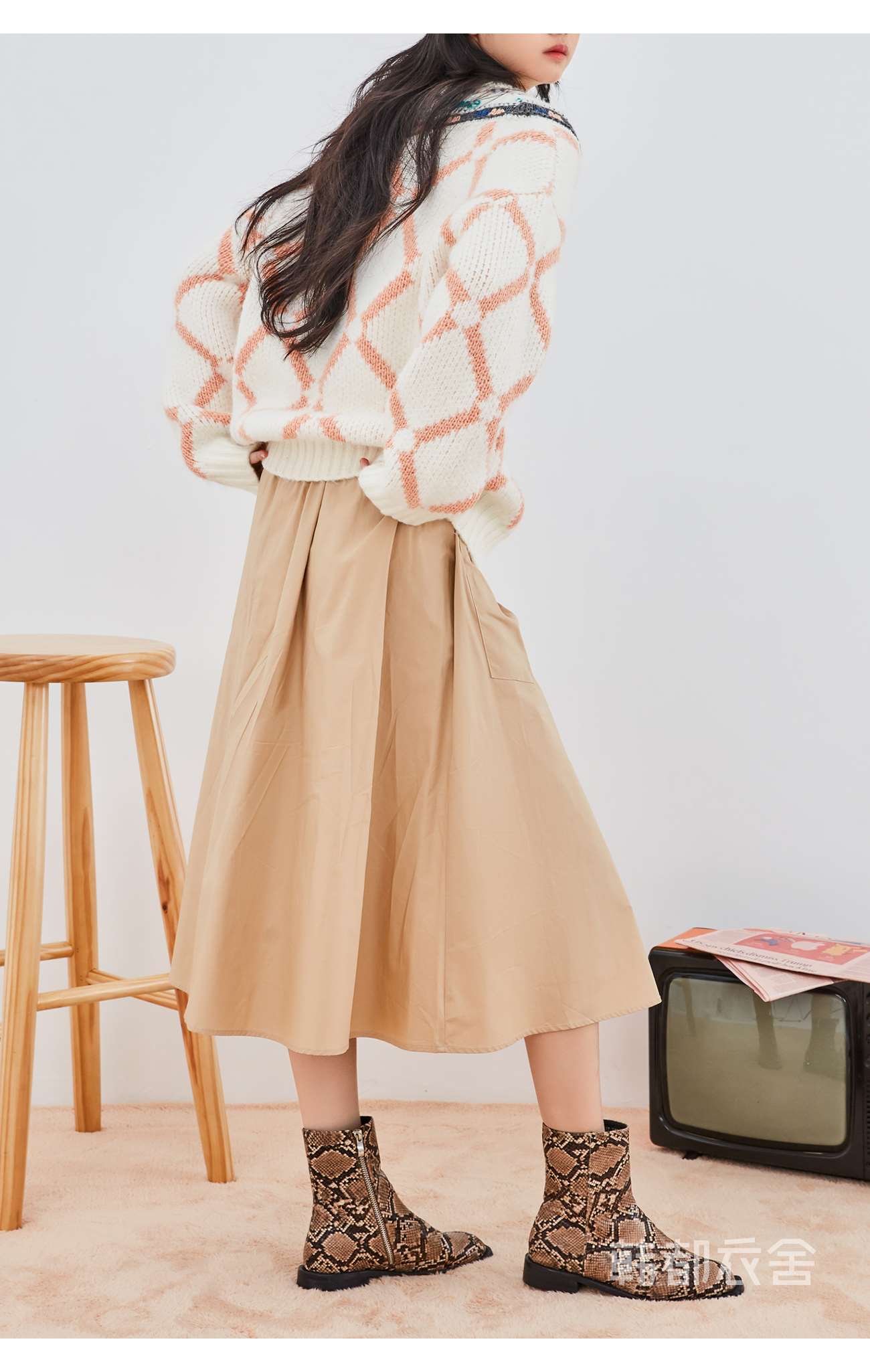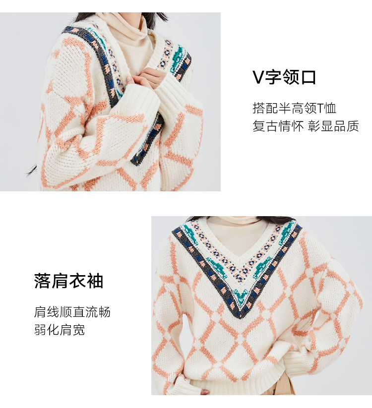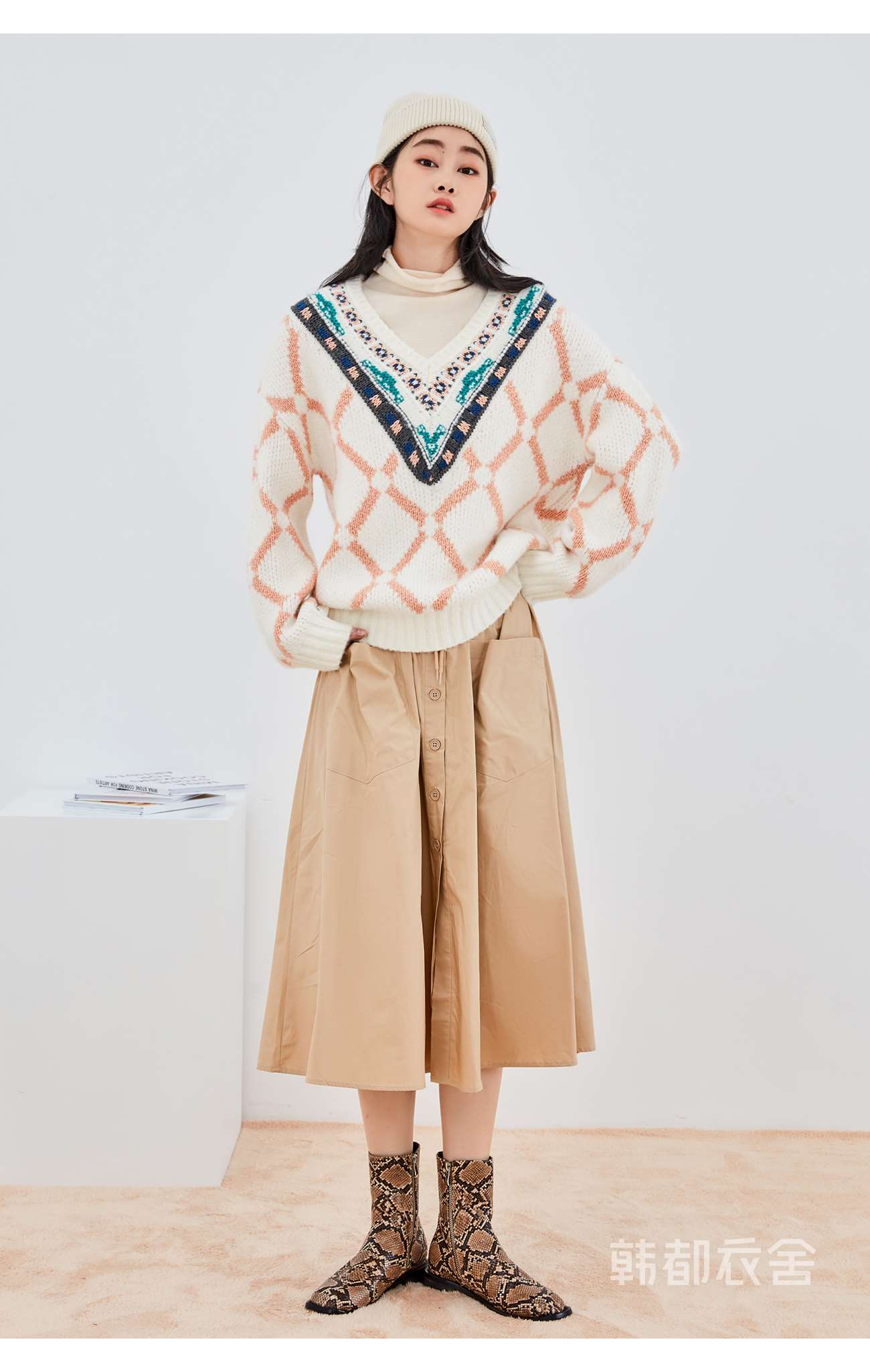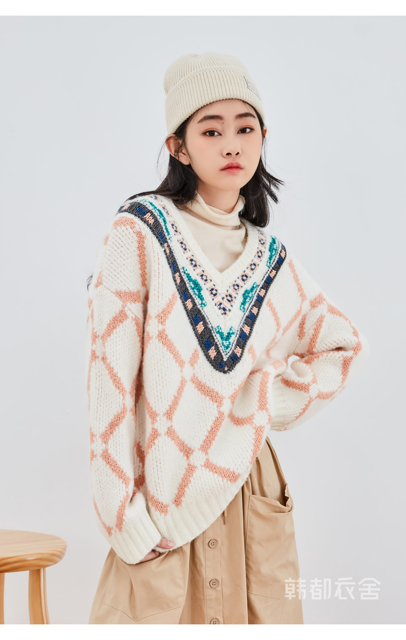 韩都衣舍2021春新款复古撞色毛衫大V领宽松学生毛针织衫女GQ11062
