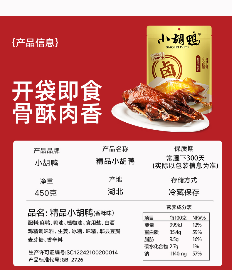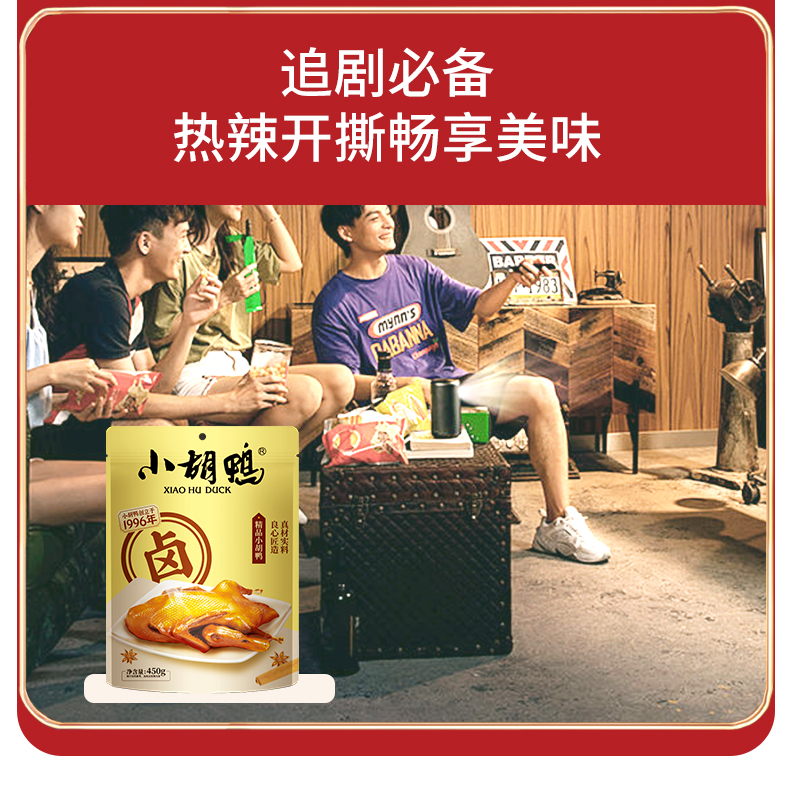 - 湖北小胡鸭食品有限责任公司成立于1996年,专注于鸭制品加工及水产卤制品制造及经营。励志于将小胡鸭香味飘香中华大地。