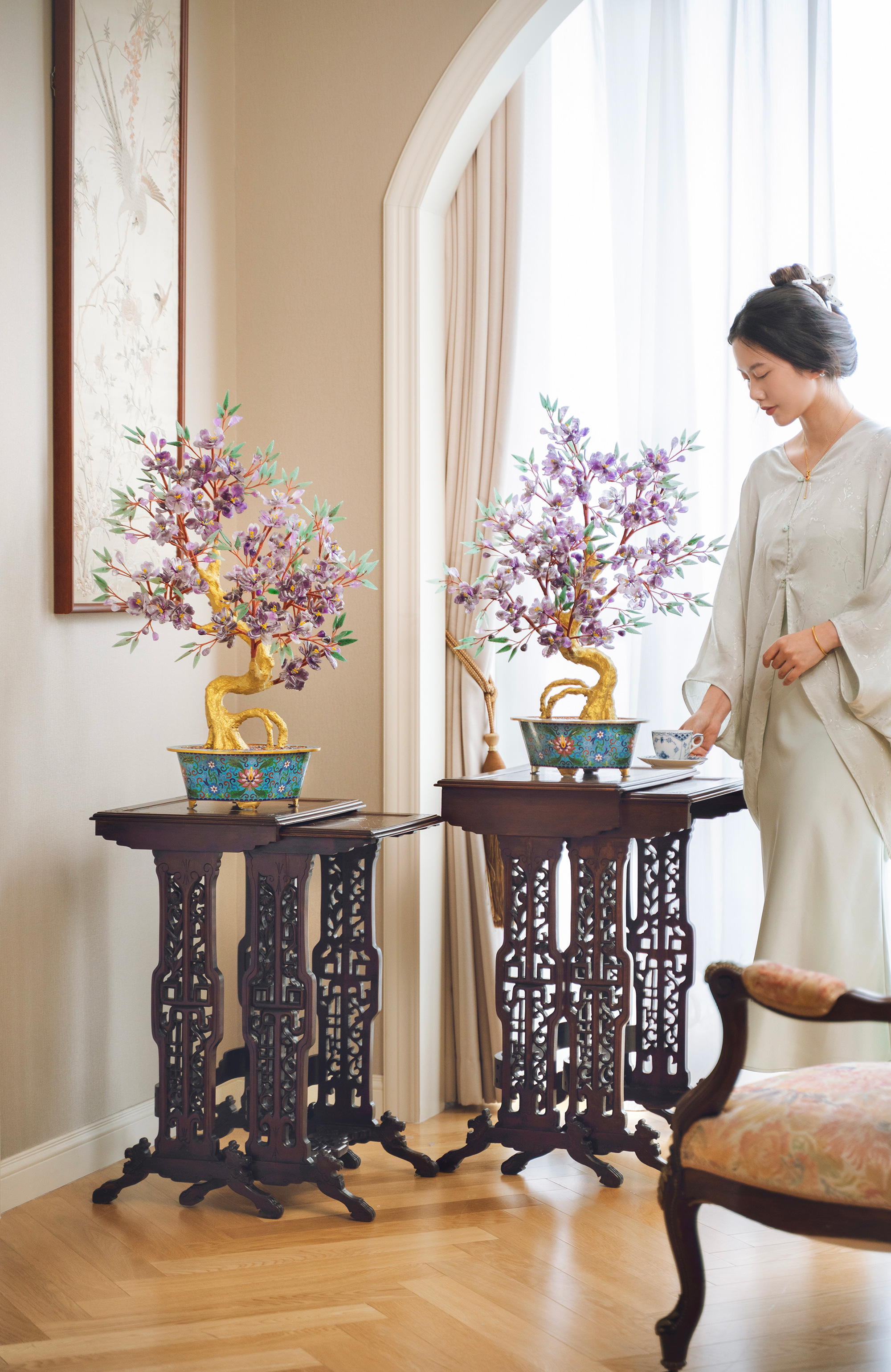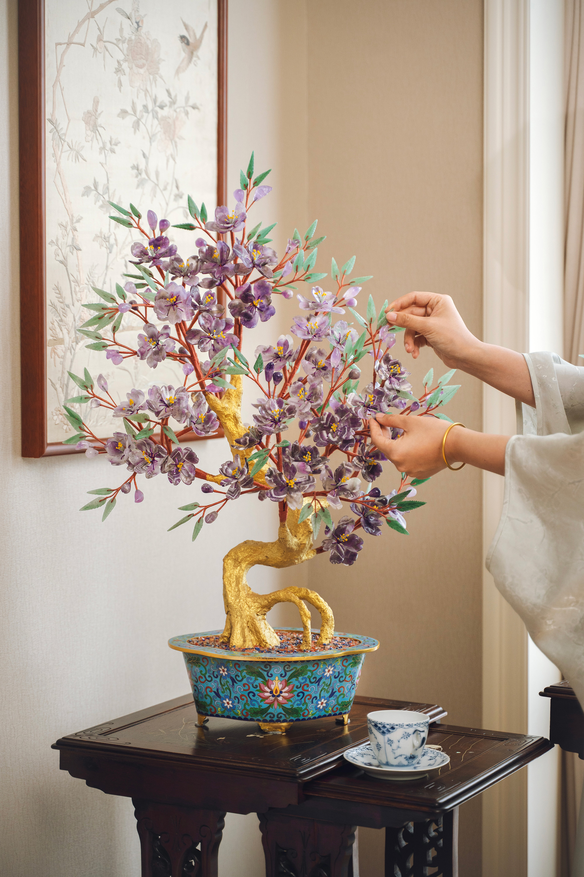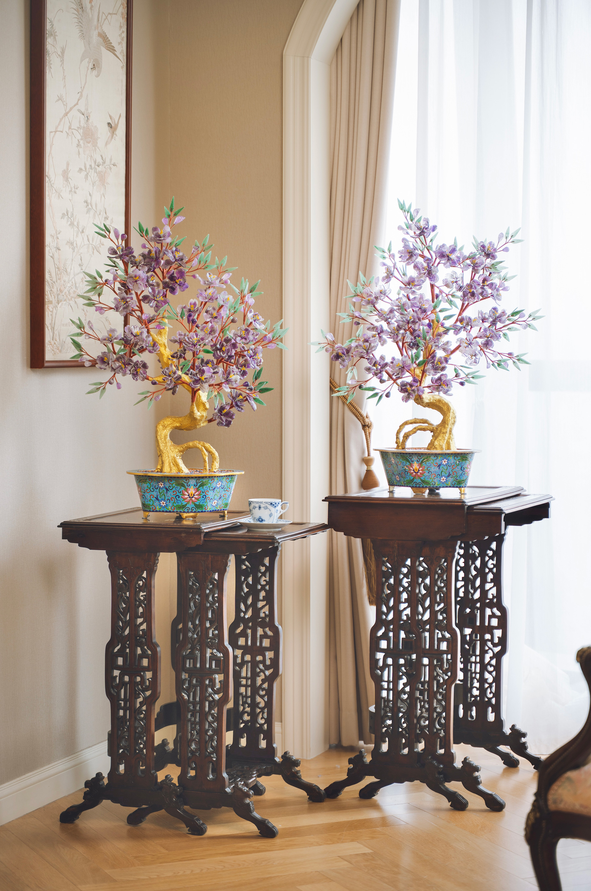 中国出品传统宝相花纹景泰蓝盆装饰「紫气东来」主题珍宝像生盆景一对