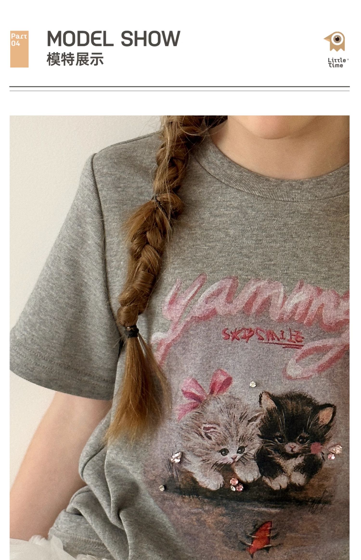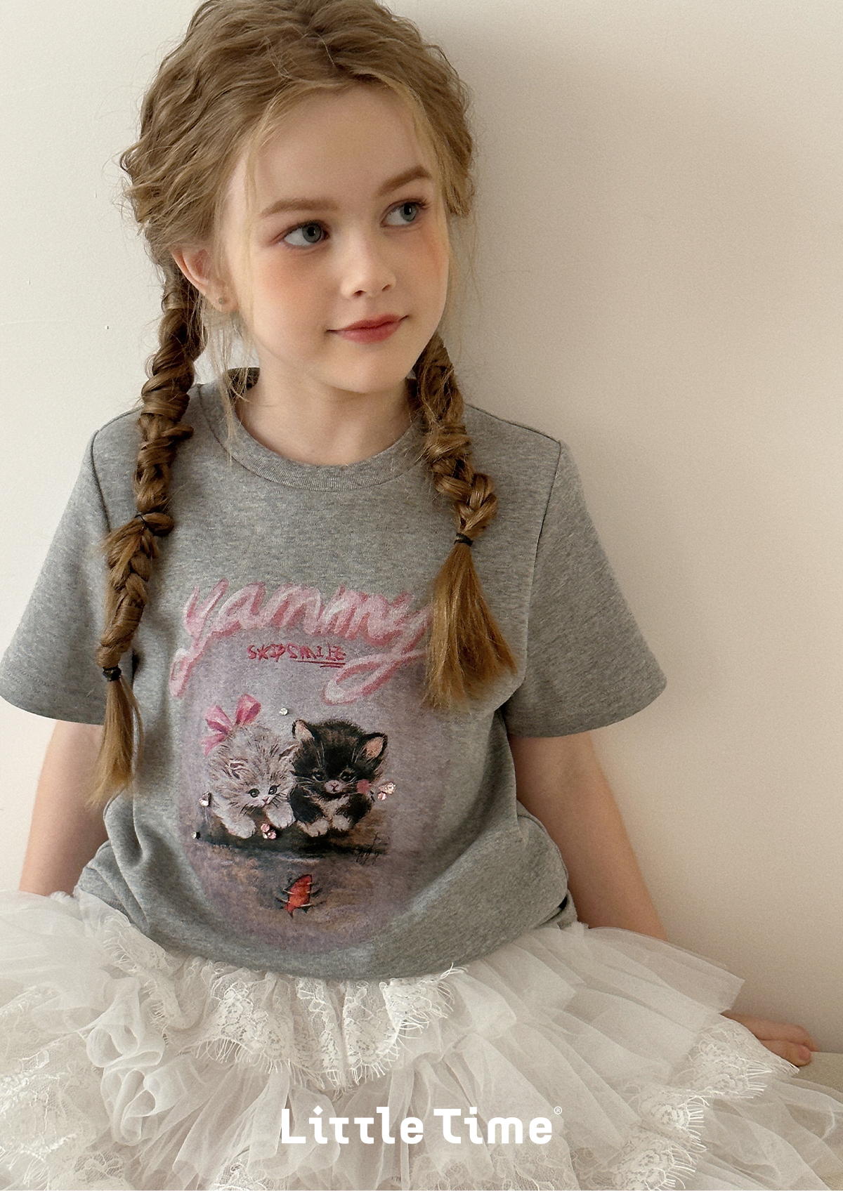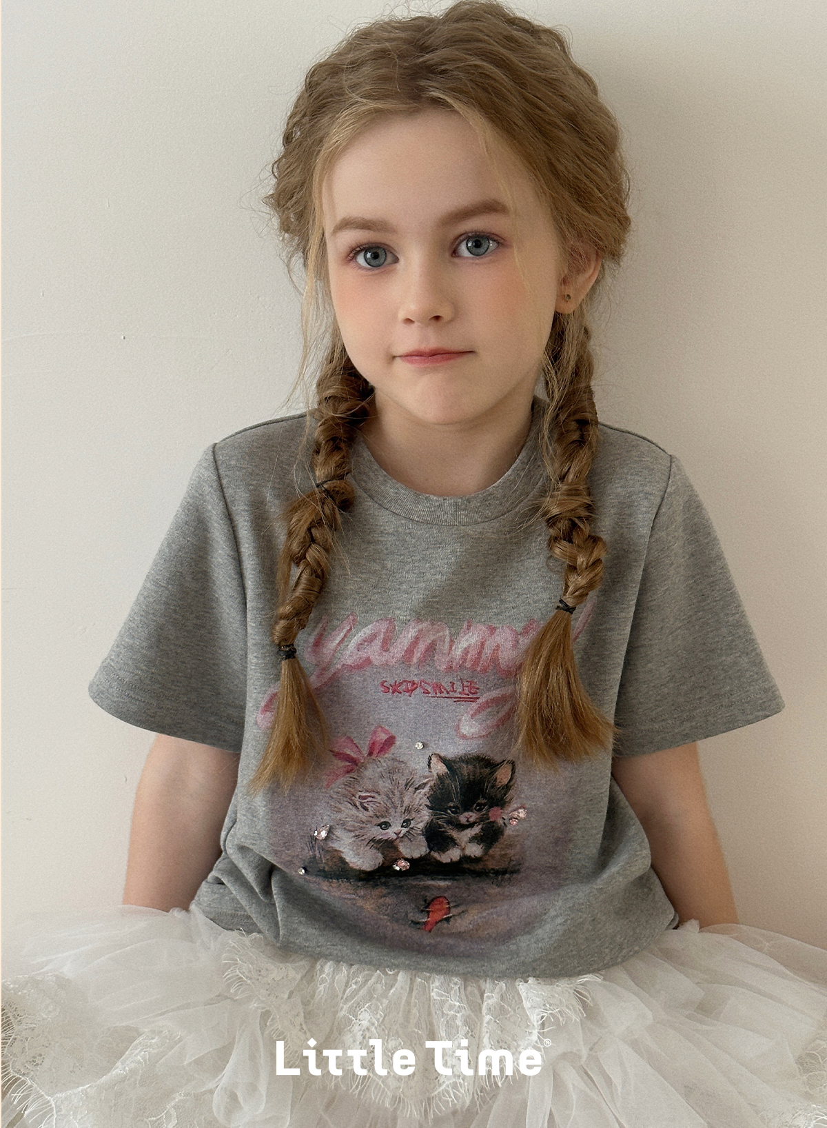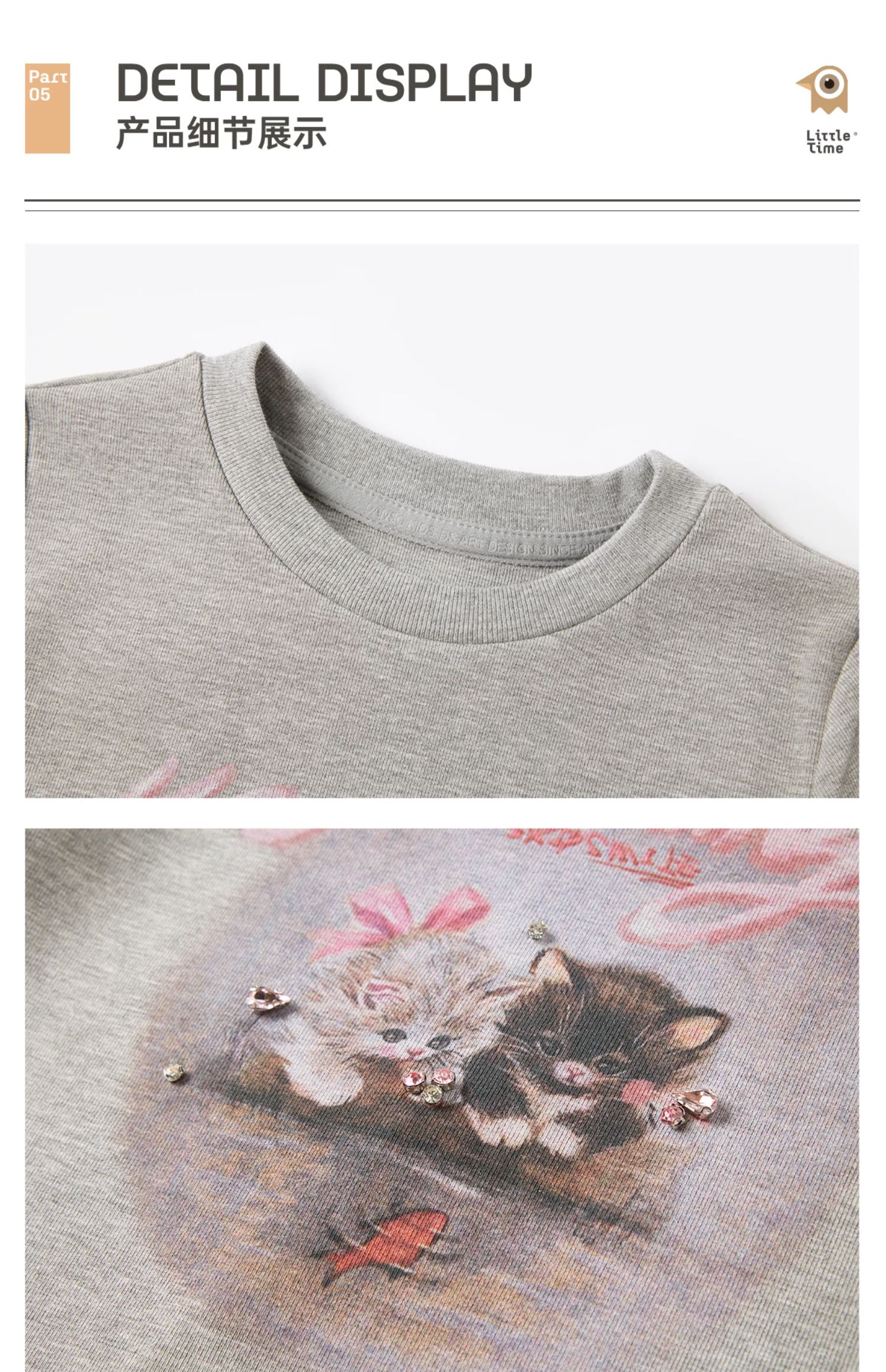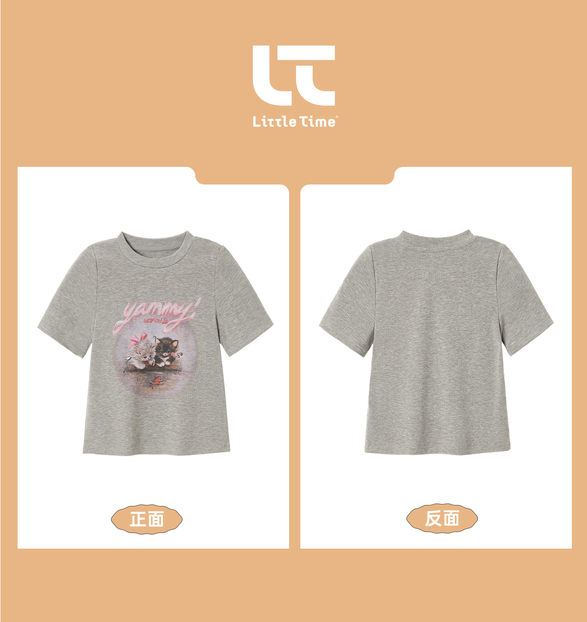 Little time女童短袖T恤夏装2025新款儿童可爱猫咪印花半袖上衣