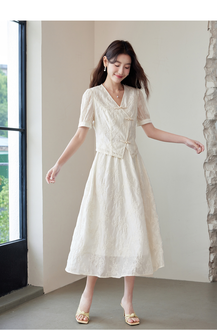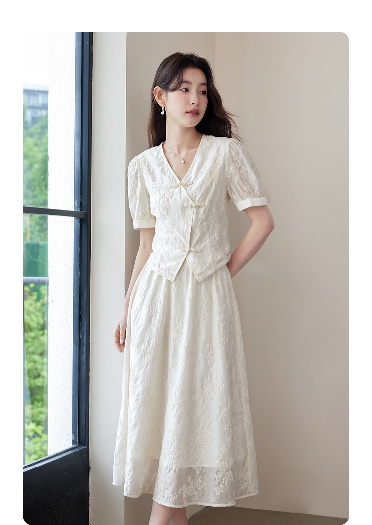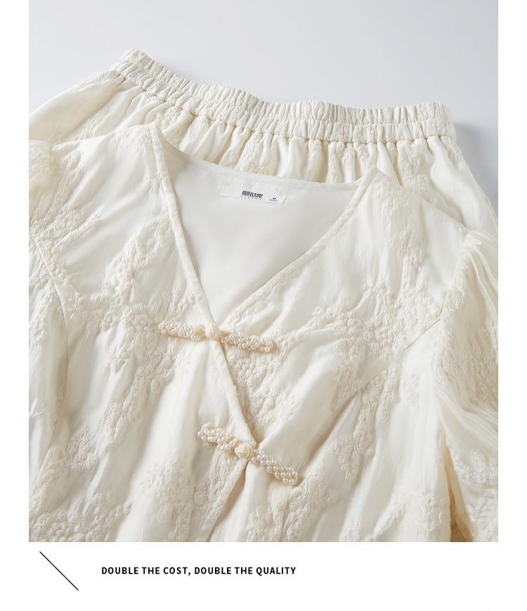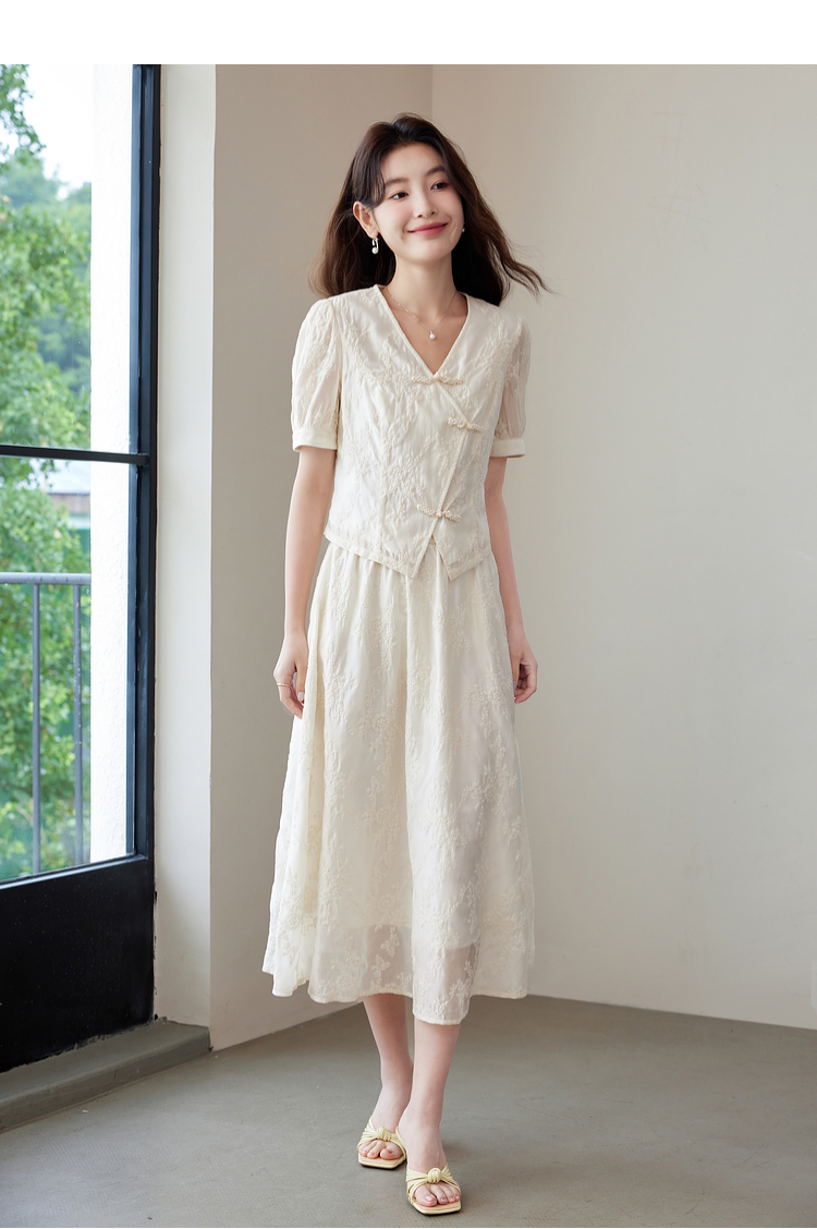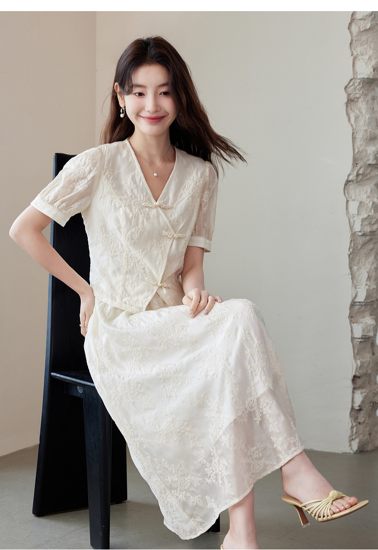 【五折购】熙世界夏款女装天丝新中式V领盘扣刺绣衬衫半身裙两件套装国风