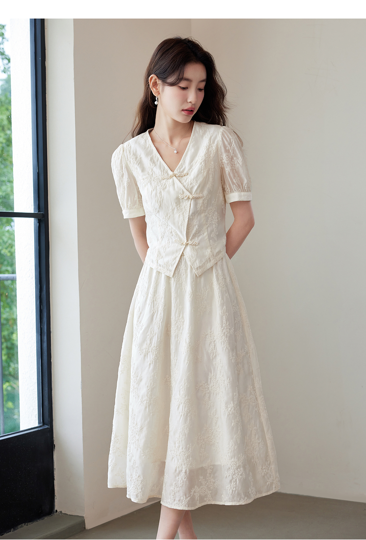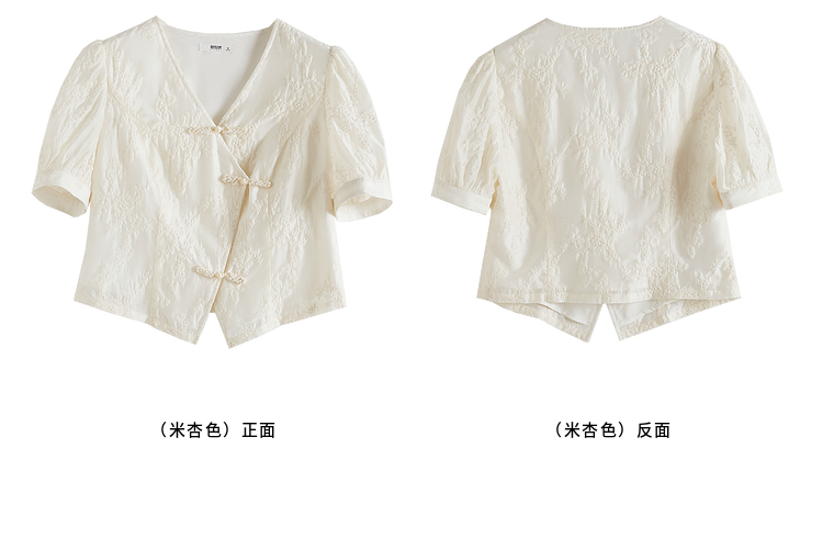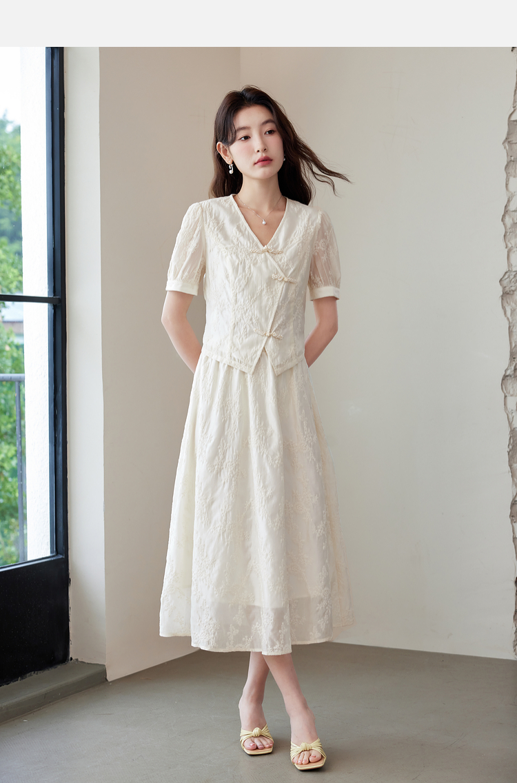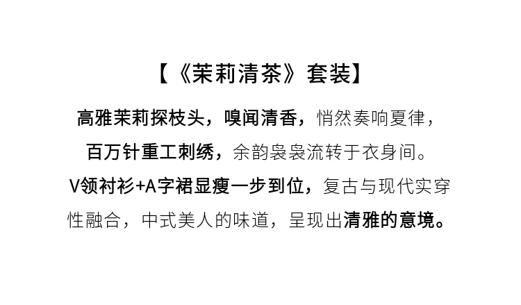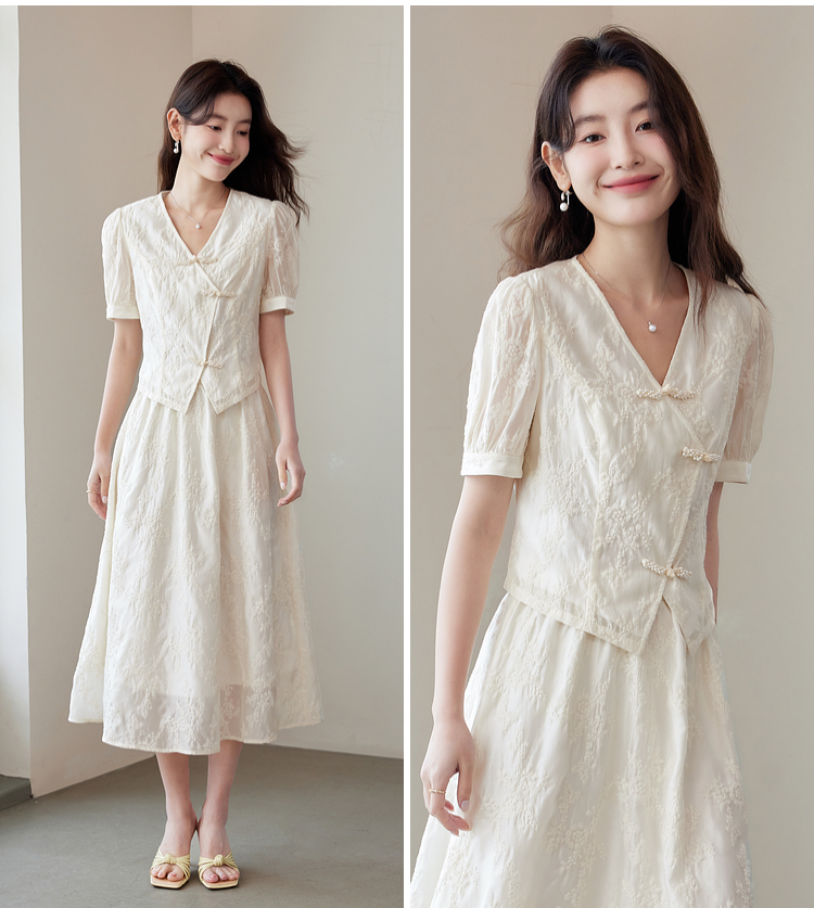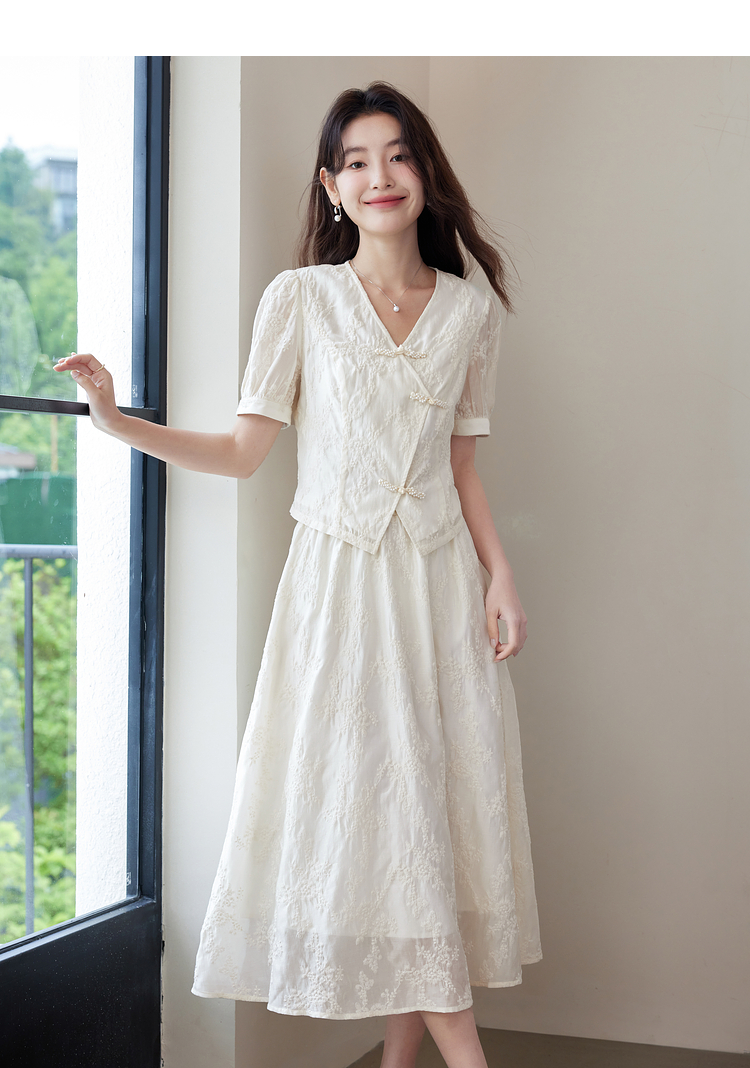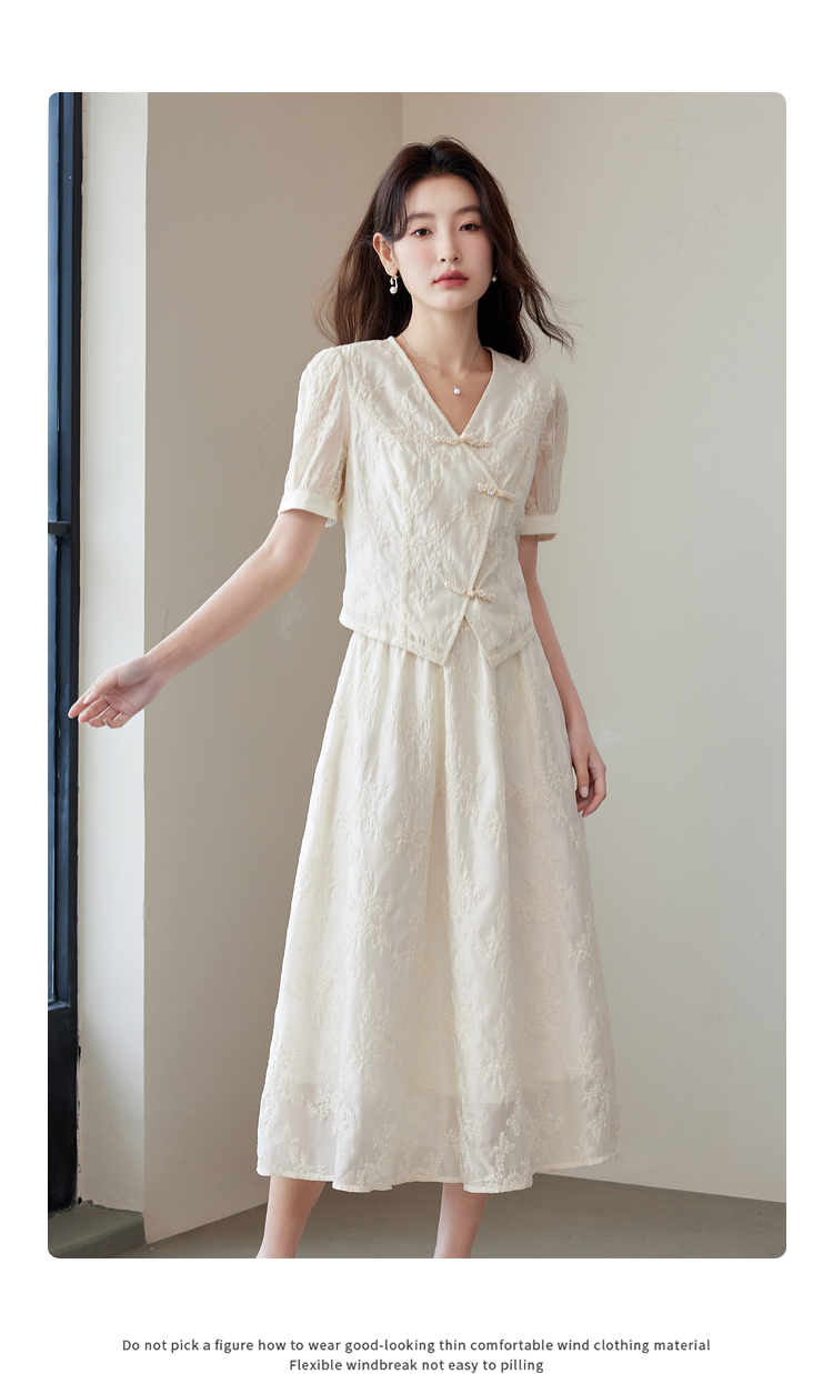 【五折购】熙世界夏款女装天丝新中式V领盘扣刺绣衬衫半身裙两件套装国风