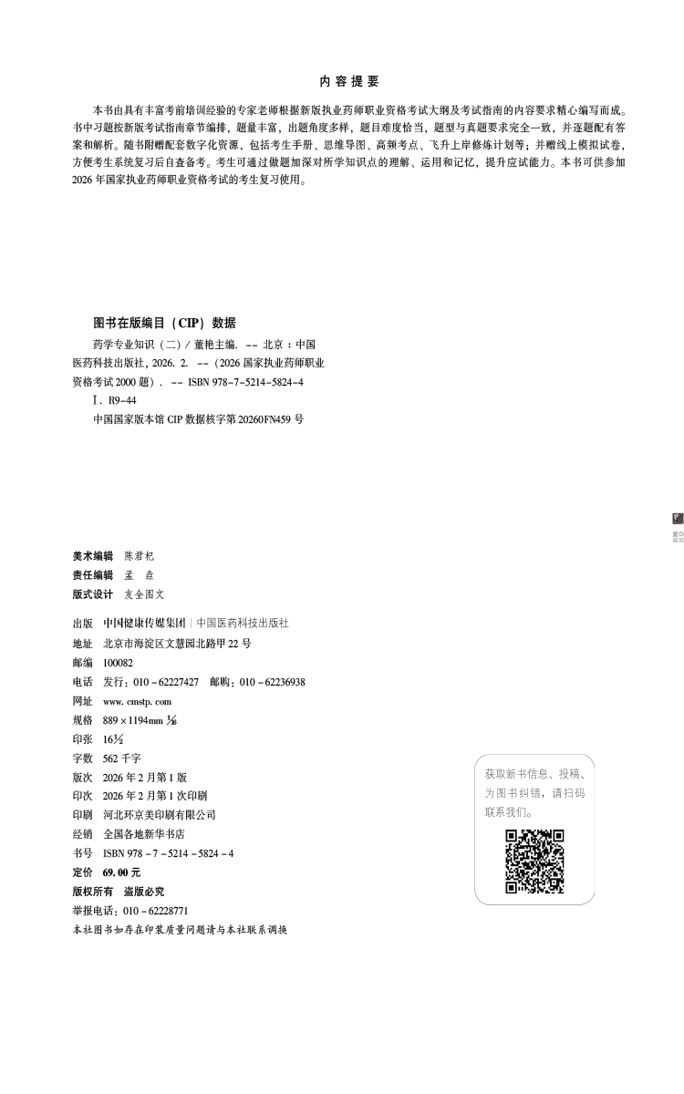 2026国家执业药师职业资格考试 2000题 药学专业知识(二) 董艳 主编 随书附赠配套数字化资源 9787521458244中国医药科技出版社