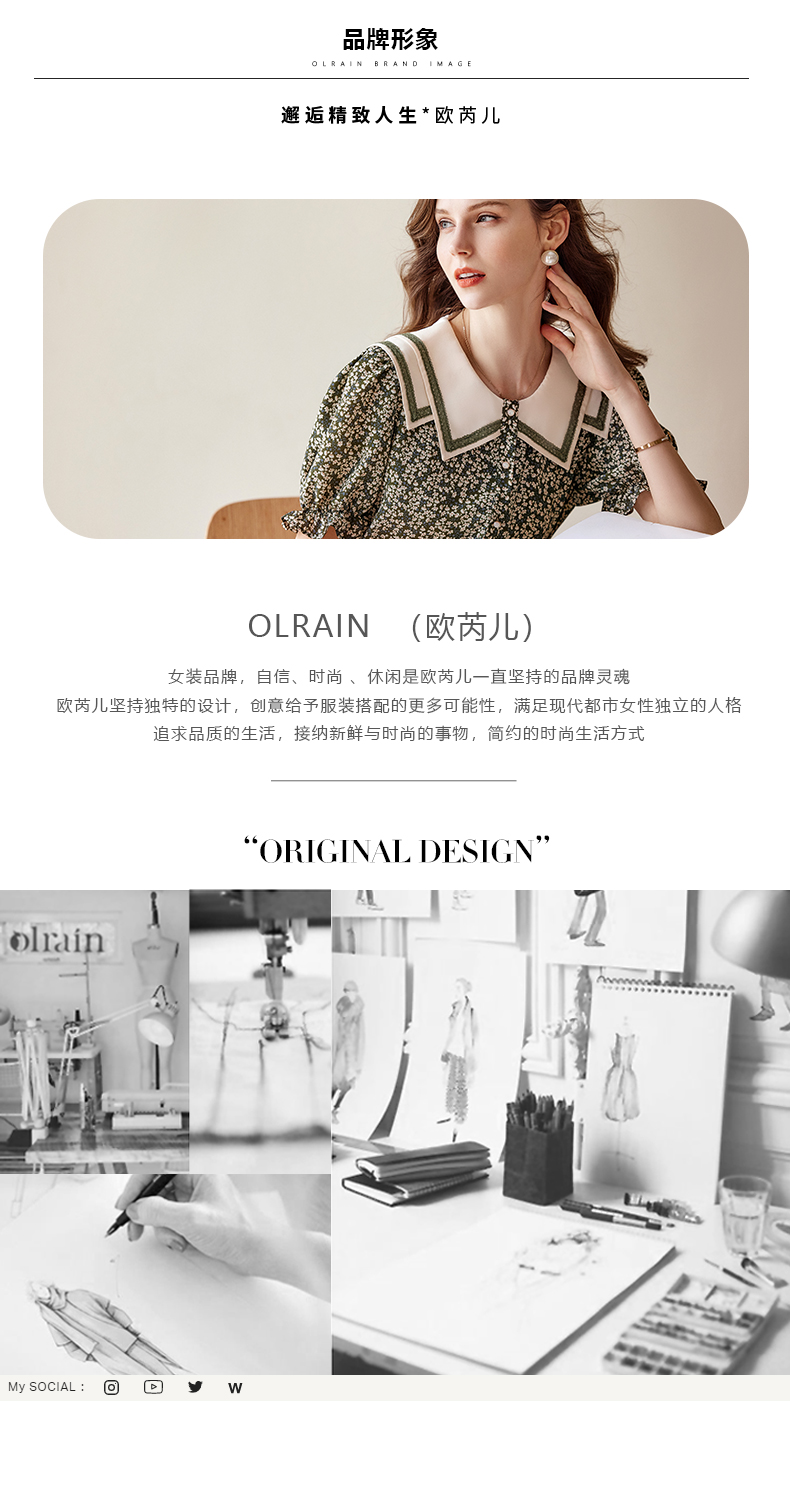“精致”是欧芮儿olrain品牌文化的核心,欧芮儿认为,精致的女人,不但要外在动人,更要内在迷人,内外兼修,有魅力、有气质、有内涵,自信而不自傲,优雅而不矫揉,自有万种风情而不轻浮,更不故作矜持。