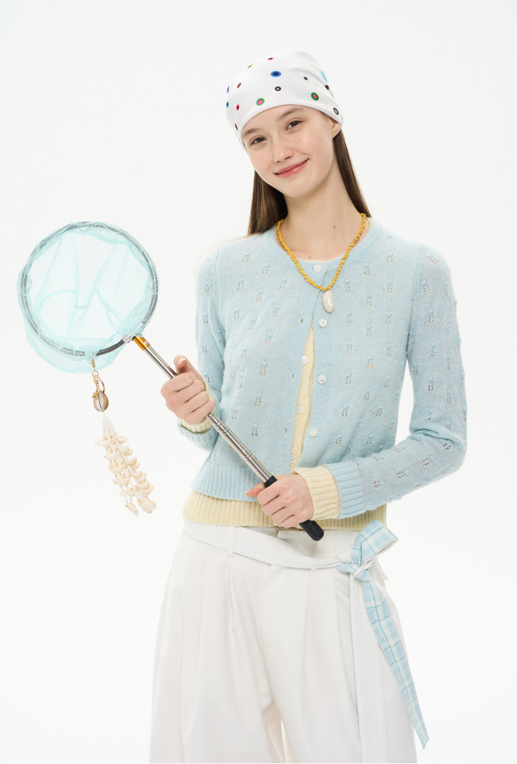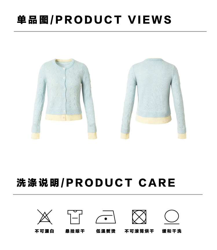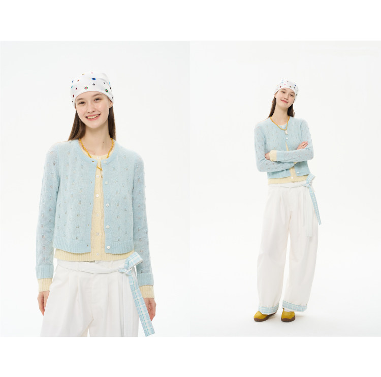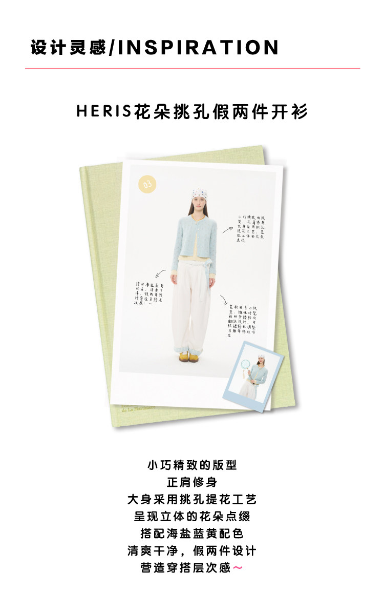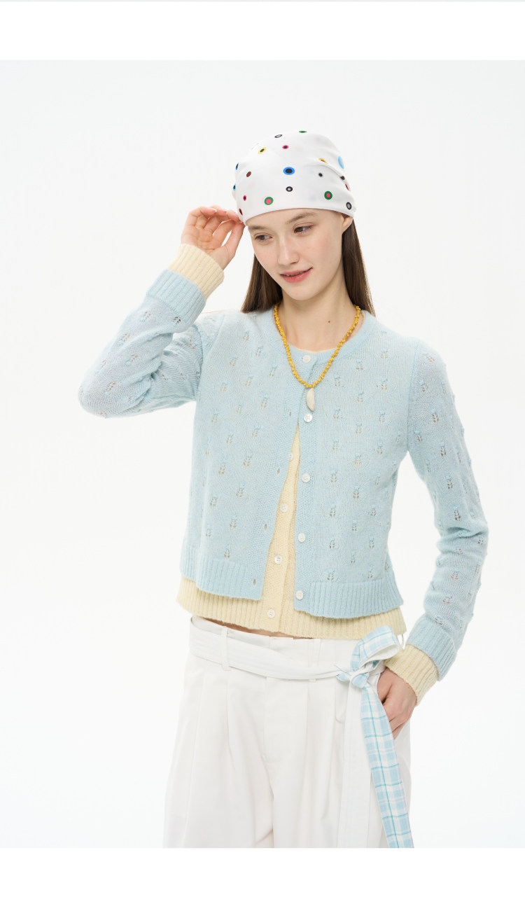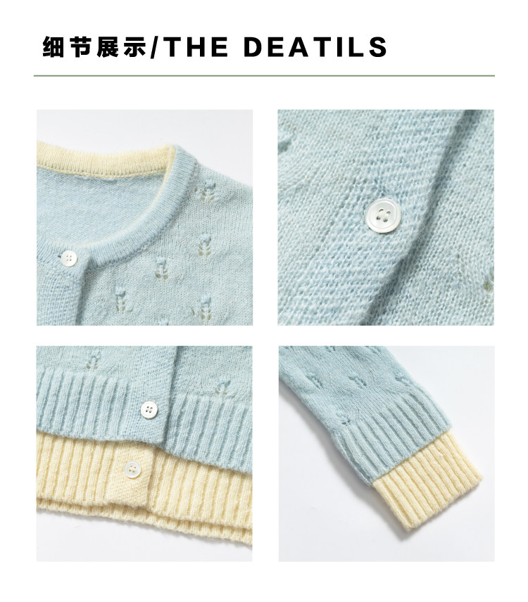 heris/H61102/花朵挑孔提花 空气感羊驼羊毛 奶蓝假两件针织开衫