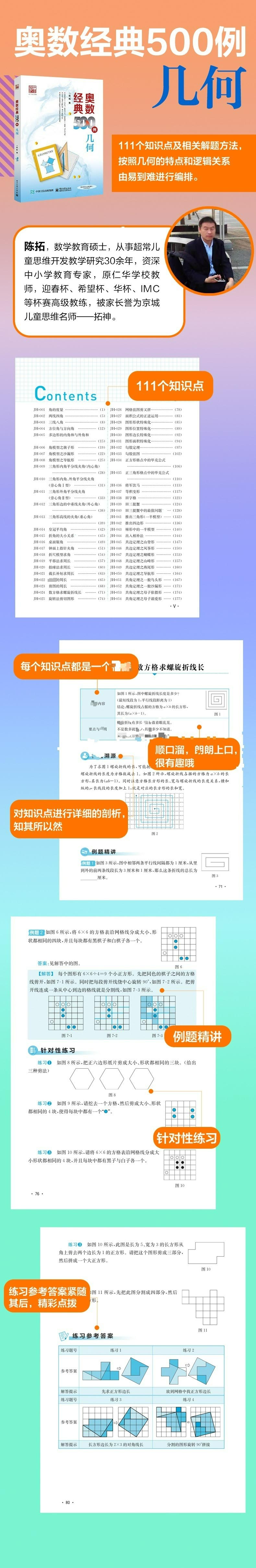 本书共有111个知识点及相关解题方法,按照几何的特点和逻辑关系由易到难进行编排。从角的概念开始,到立体图形中的索玛立方体结束。每个知识点就是一把利器,帮助学生快速理解知识的由来和运用。每个利器的名称都很鲜明,采用诙谐的顺口溜总结知识要点,通过"利器溯源",让读者知其然,更知其所以然。每个利器都配有例题精讲和针对性练习。通过对精选例题的学习和对应练习,希望读者能把一颗颗精美的知识明珠串在一起,进而形成完善的知识体系。本书适合小学中、高年级学生以及初中学生进行培优学习使用,也可作为数学竞赛者的专题培训教材。