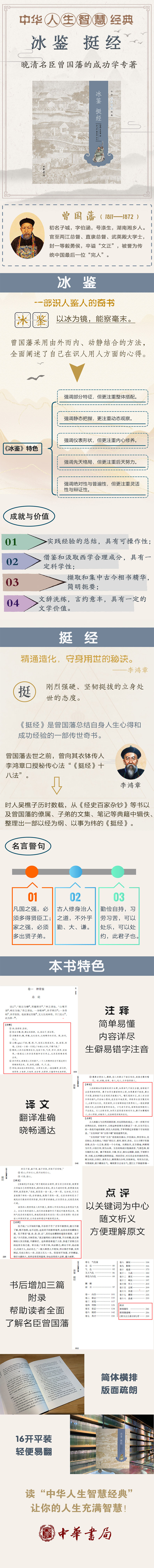 《冰鉴》是中国传统识人术第一奇书,曾国藩一生识人心得的总结。曾国藩能在晚清吏治败坏并特别腐朽的环境中揽尽天下英才,与他独到的识人才能密不可分。曾国藩的识人术,重神兼之以形,重常而辨之以奇,重礼而导之以术,就相论人,就神取人,从静态中把握人的本质,从动态中观察人的归宿。现代人阅读《冰鉴》,对于如何在纷繁复杂的人际交往中甄别人的优劣,极具实用性和启迪性。