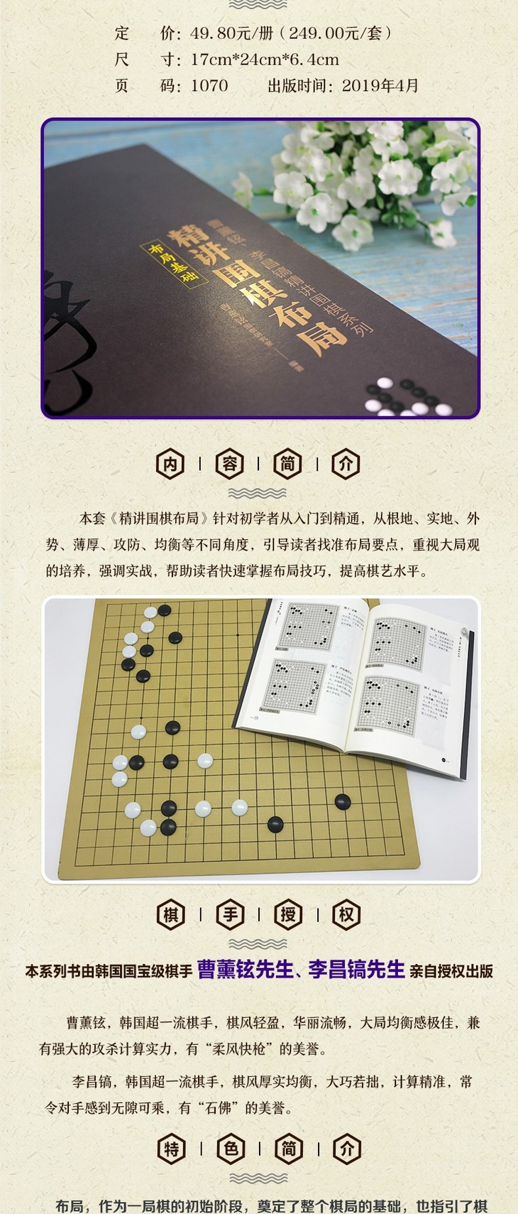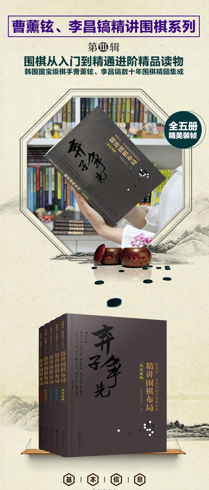 本套书,集韩国国#级棋手曹薰铉、李昌镐围棋精髓而成,分为《精讲围棋棋形》《精讲围棋定式》《精讲围棋布局》《围棋中盘技巧》《围棋对局技巧》《精讲围棋官子》《精讲围棋死活》《精讲围棋手筋》8个小套,对围棋进行全方位讲解,将于化学工业出版社陆续出版。