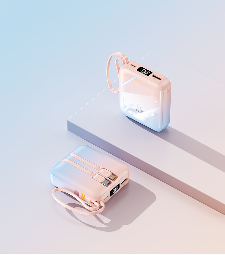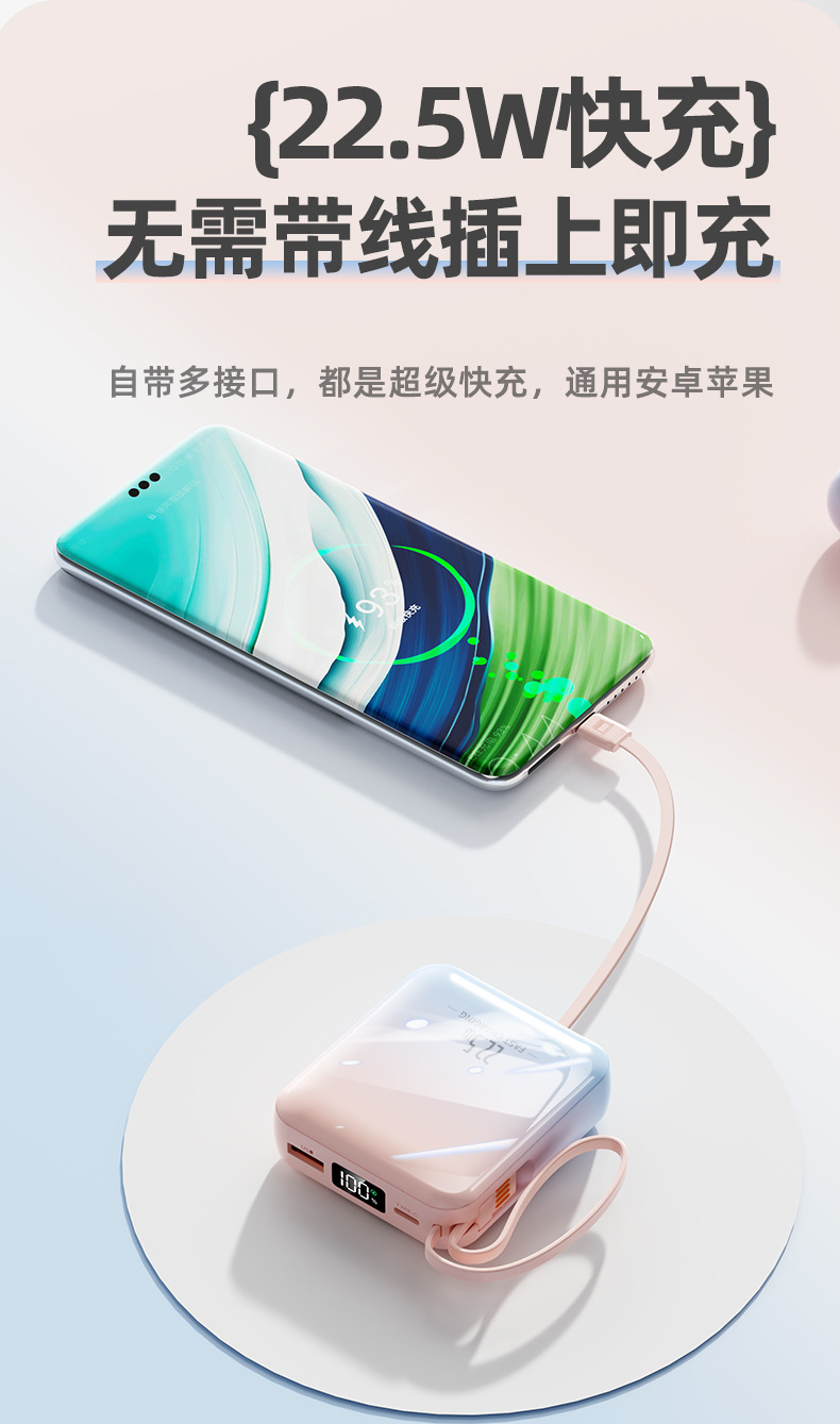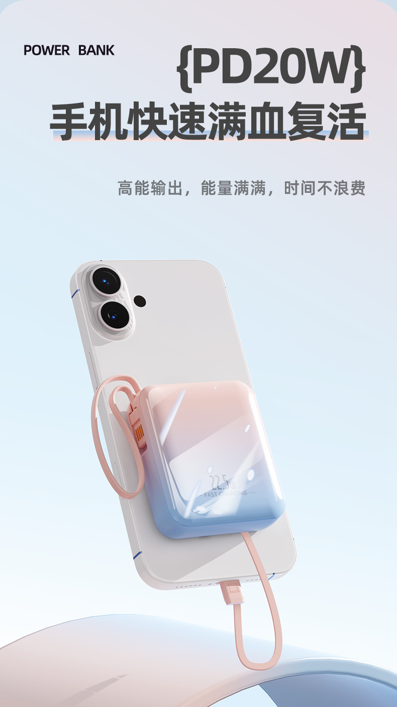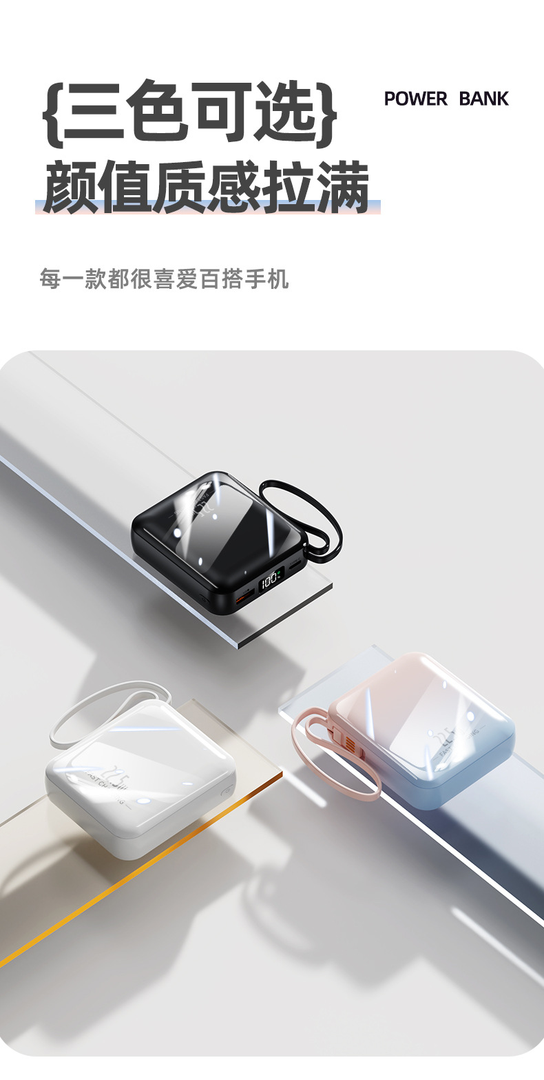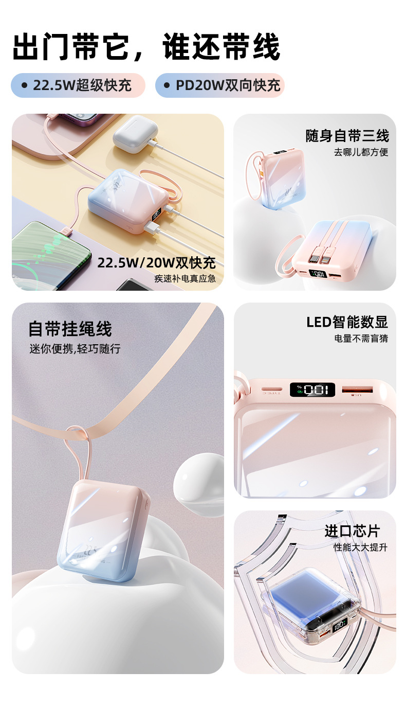 【新国标3C认证!创意撞色】超酷彩色渐变自带线快充电宝20000毫安大容量快充移动电源小巧方。ry