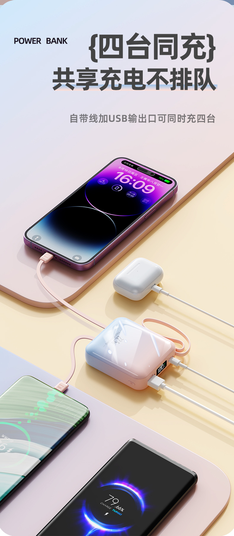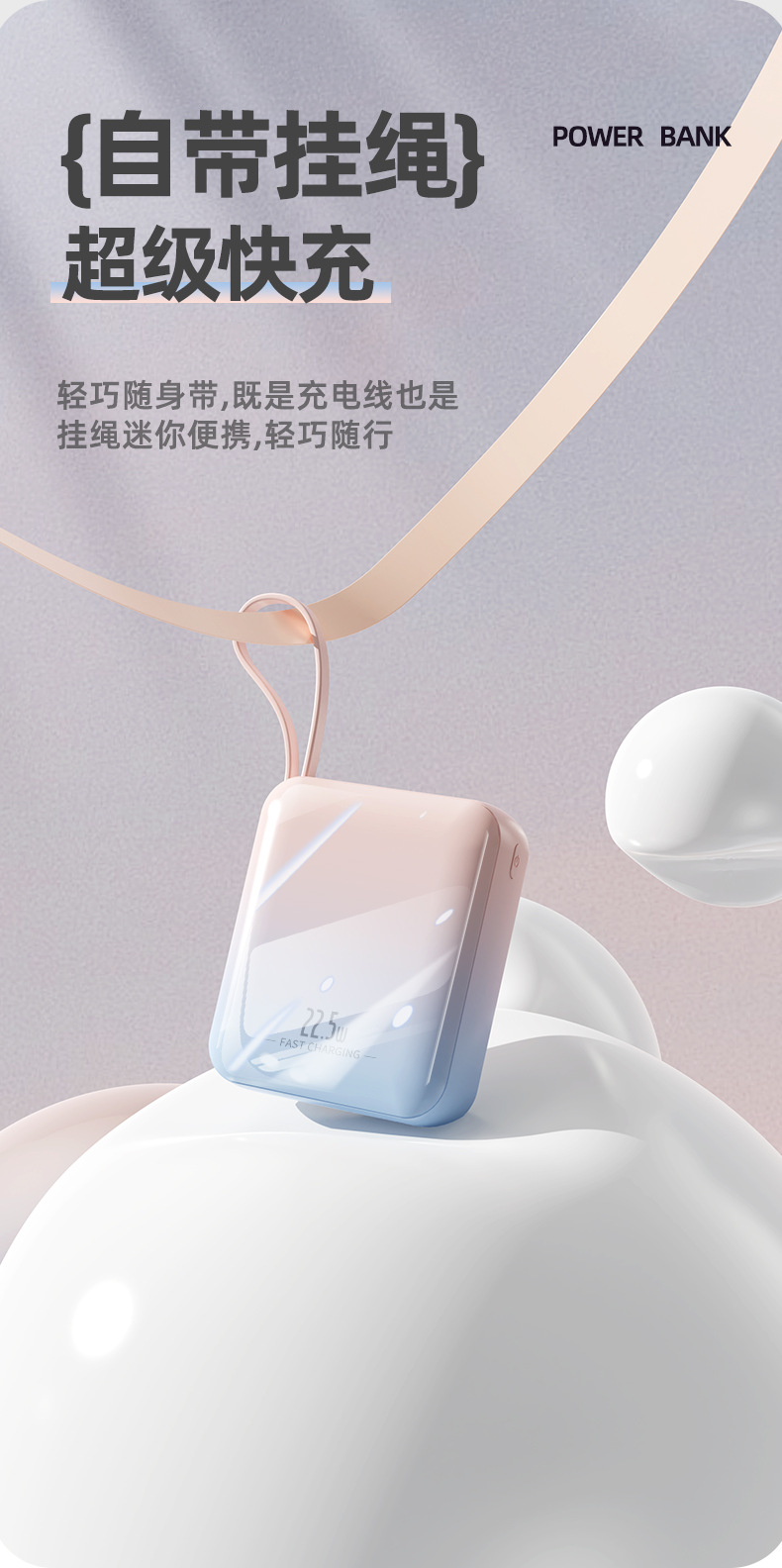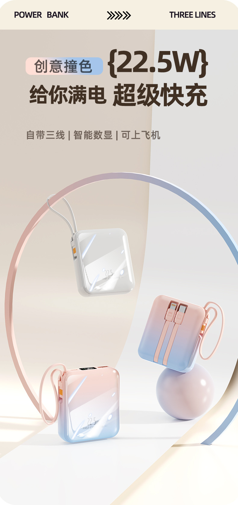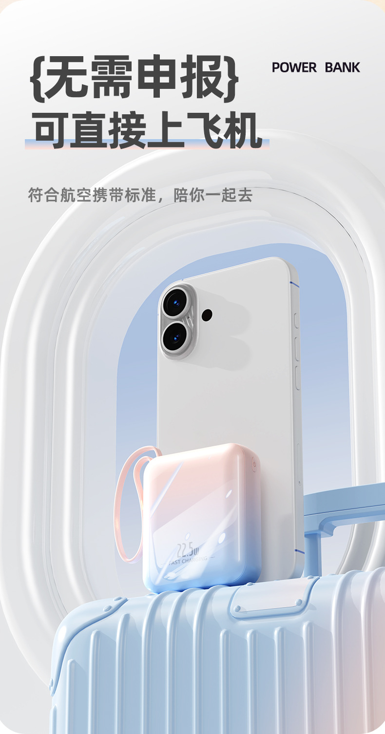 【新国标3C认证!创意撞色】超酷彩色渐变自带线快充电宝20000毫安大容量快充移动电源小巧方。ry