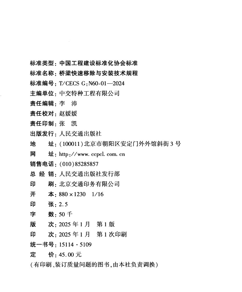 书名:桥梁快速移除与安装技术规程(T/CECS G:N60-01—2024)