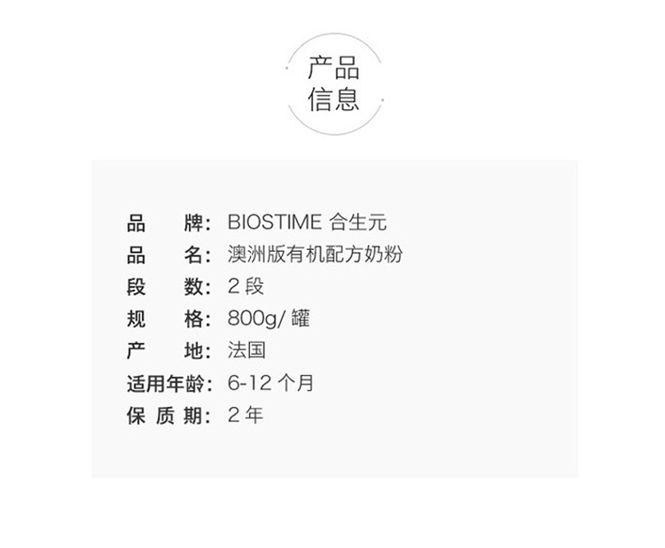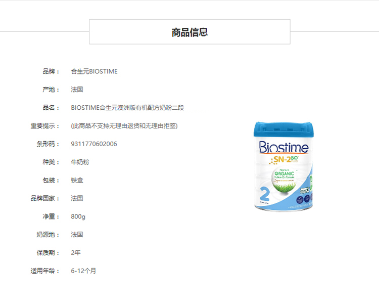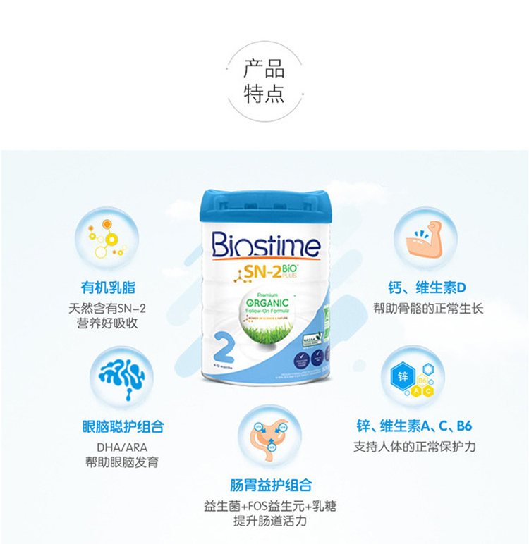 HNMG 澳洲版Biostime合生元蓝精灵有机配方奶粉 2段800g