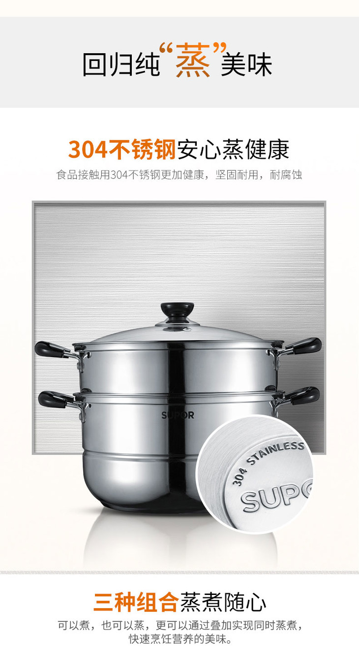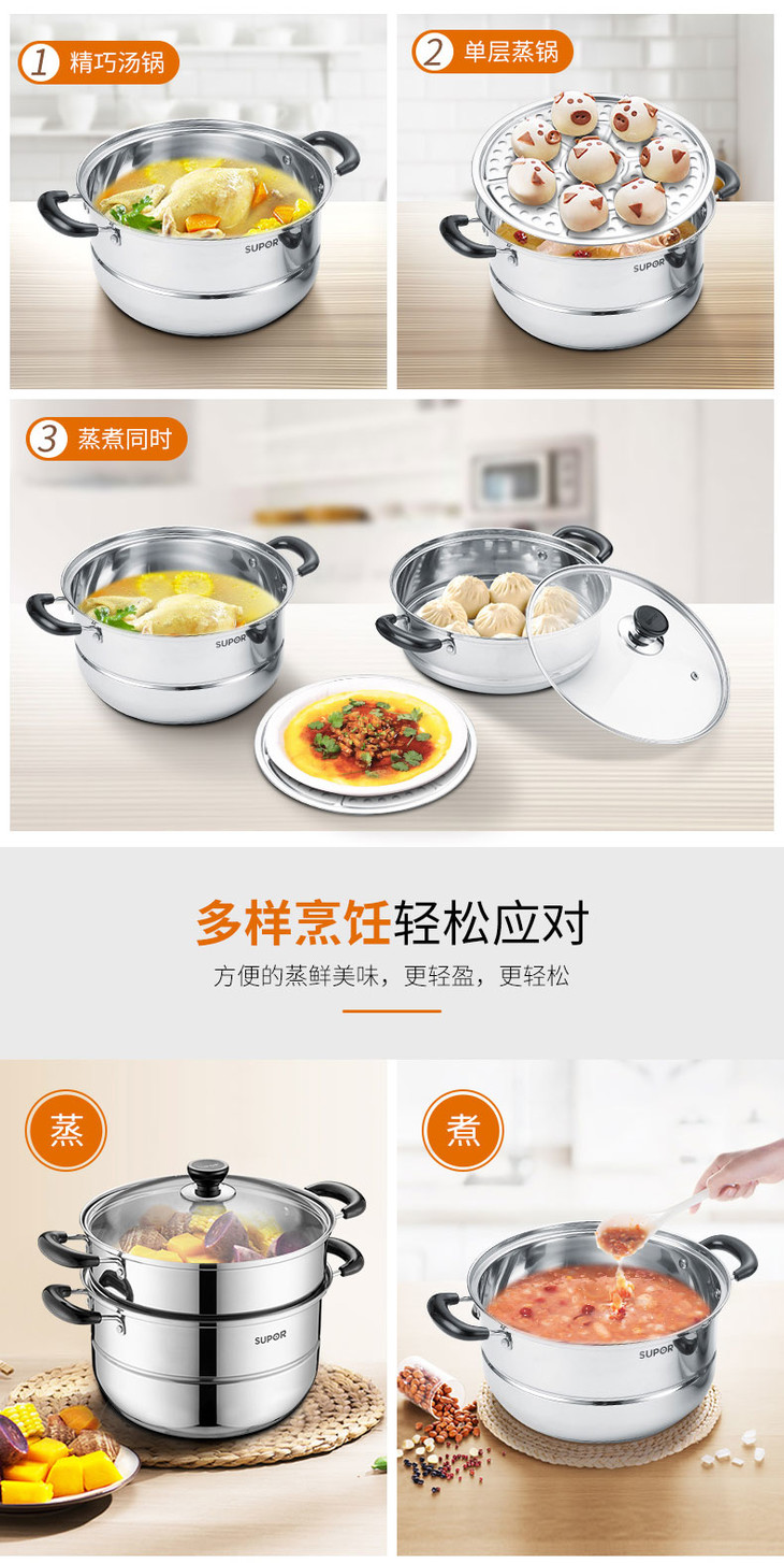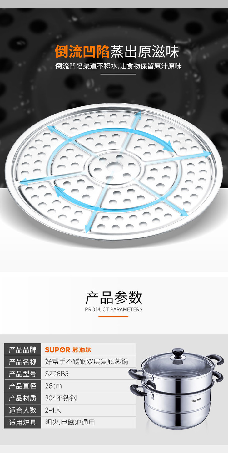 苏泊尔(506007)(SUPOR)好帮手不锈钢二层双层复底蒸锅汤锅26cm304不锈钢SZ26B5明火电磁炉通用