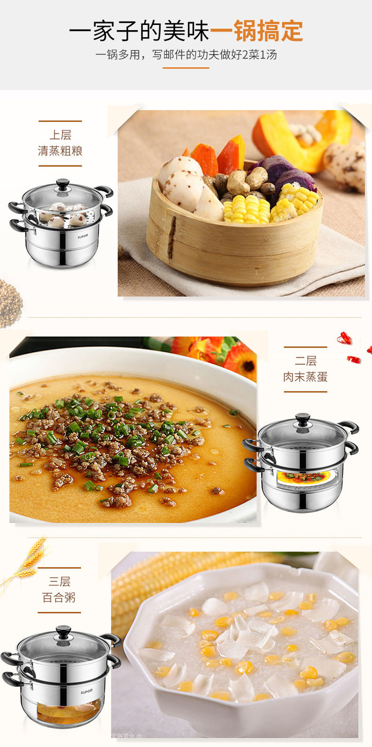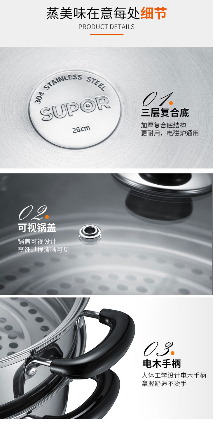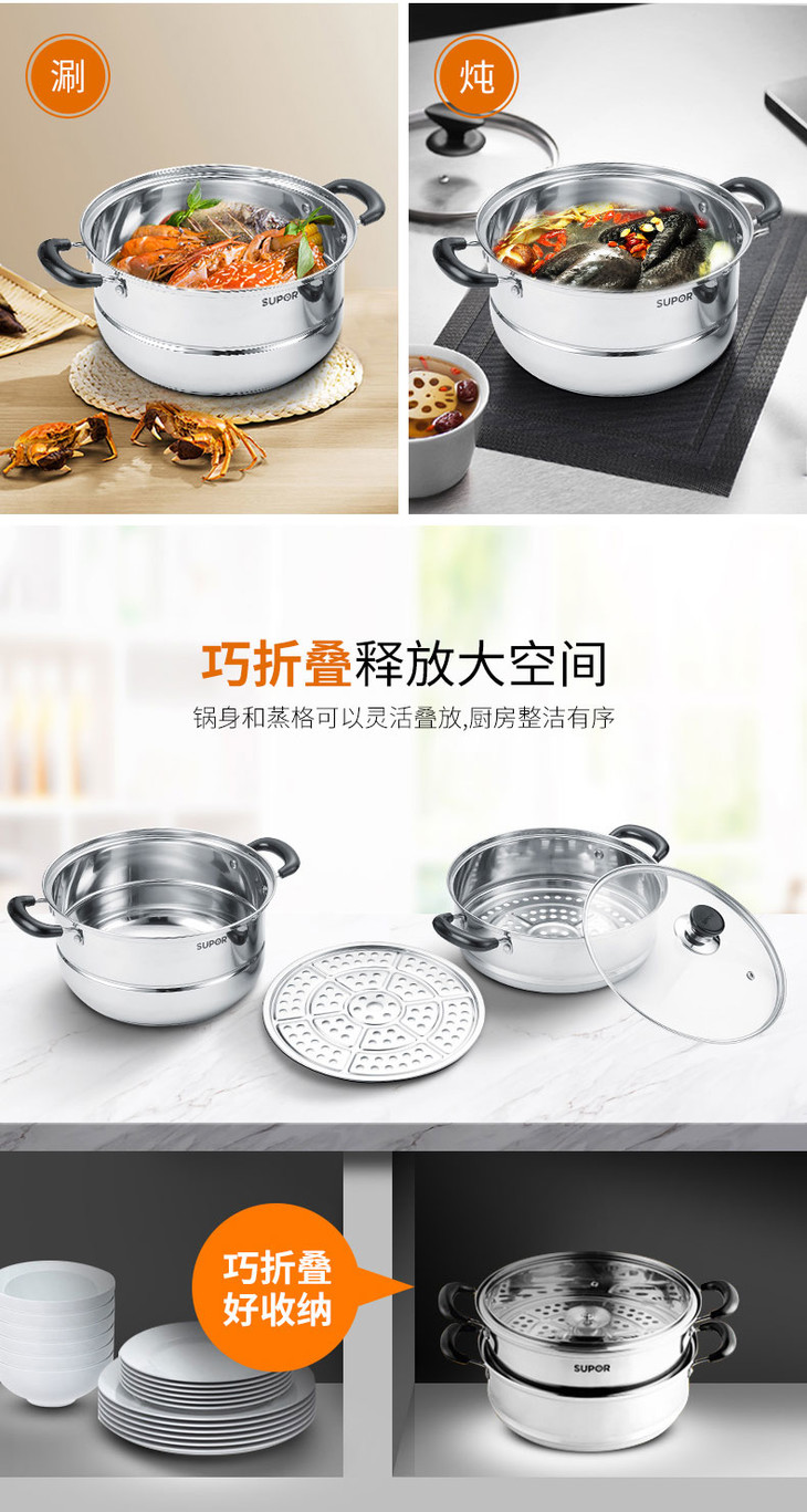 苏泊尔(506007)(SUPOR)好帮手不锈钢二层双层复底蒸锅汤锅26cm304不锈钢SZ26B5明火电磁炉通用