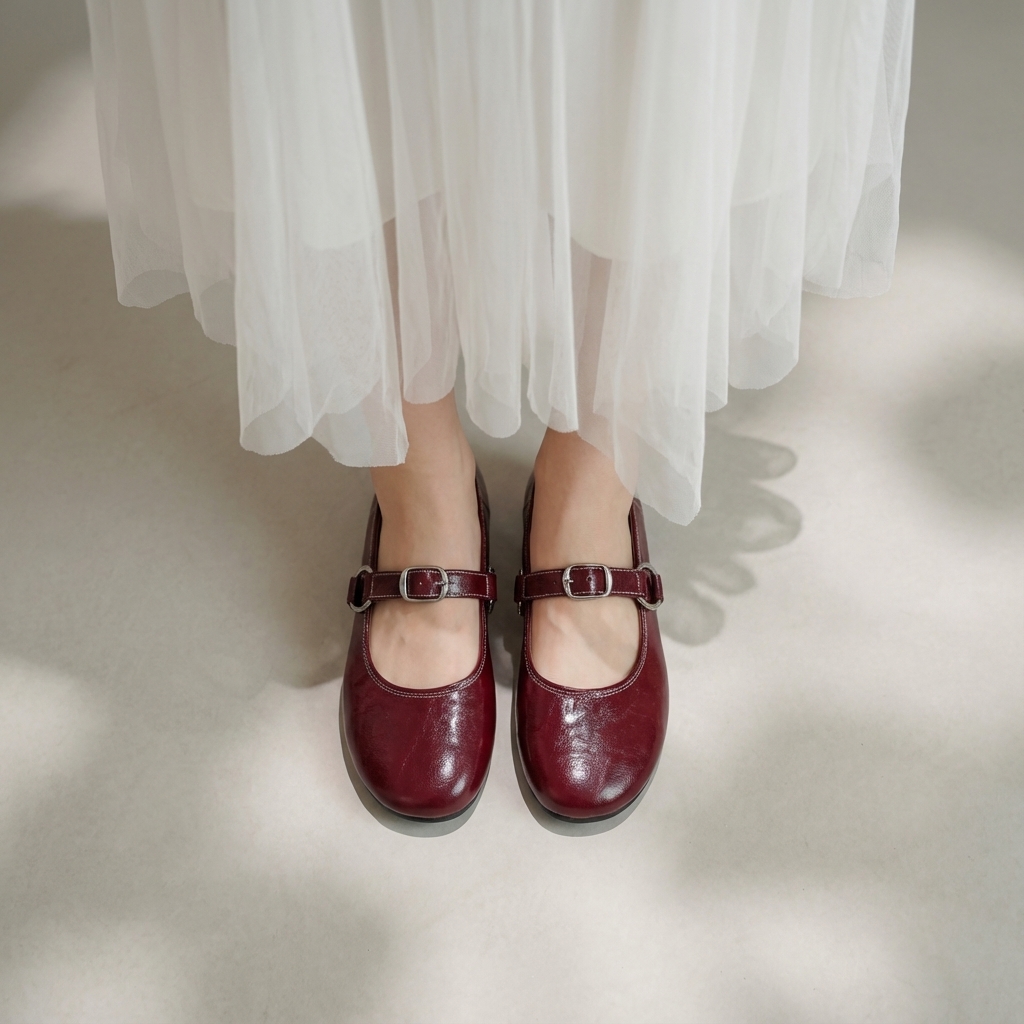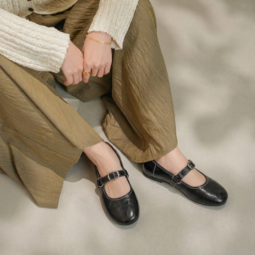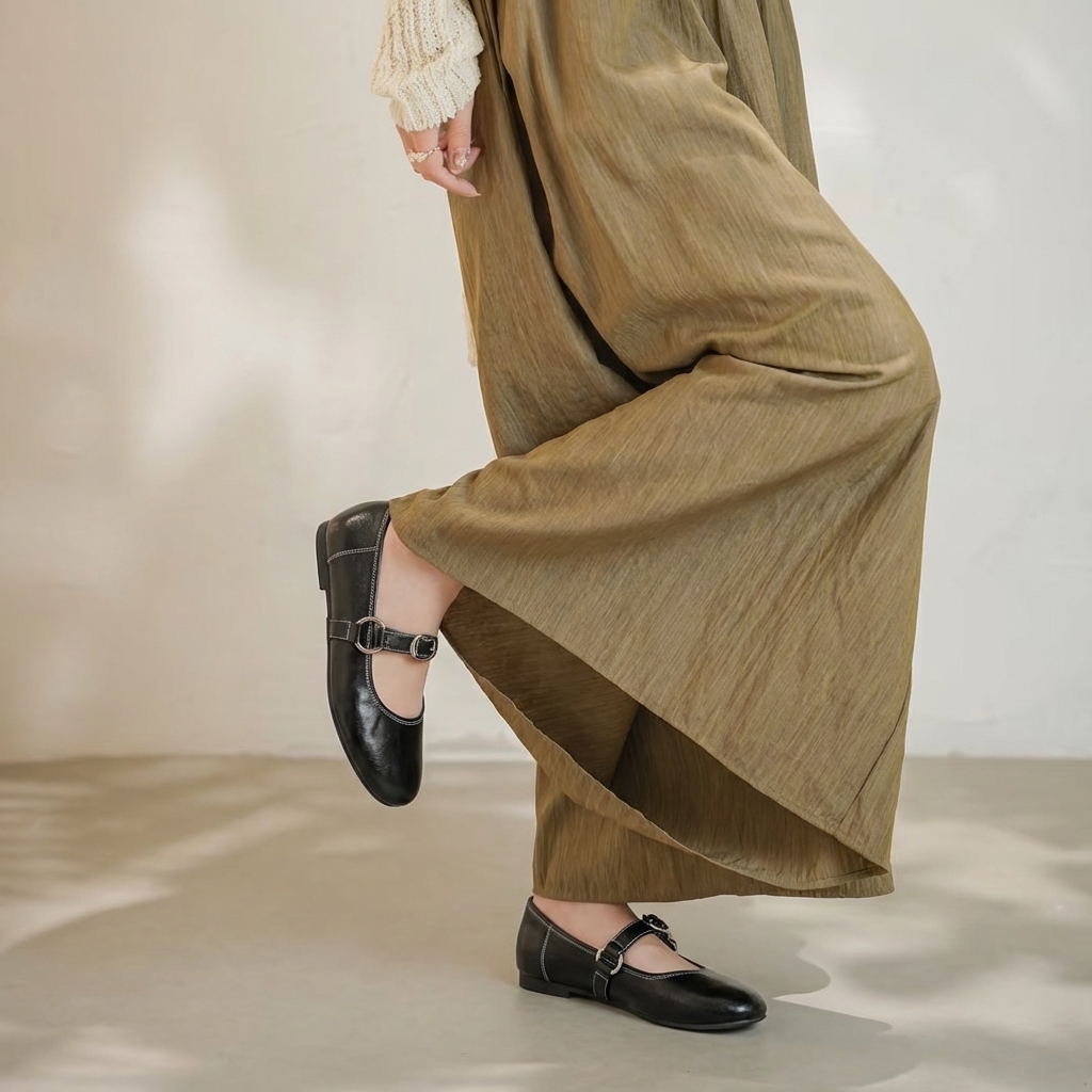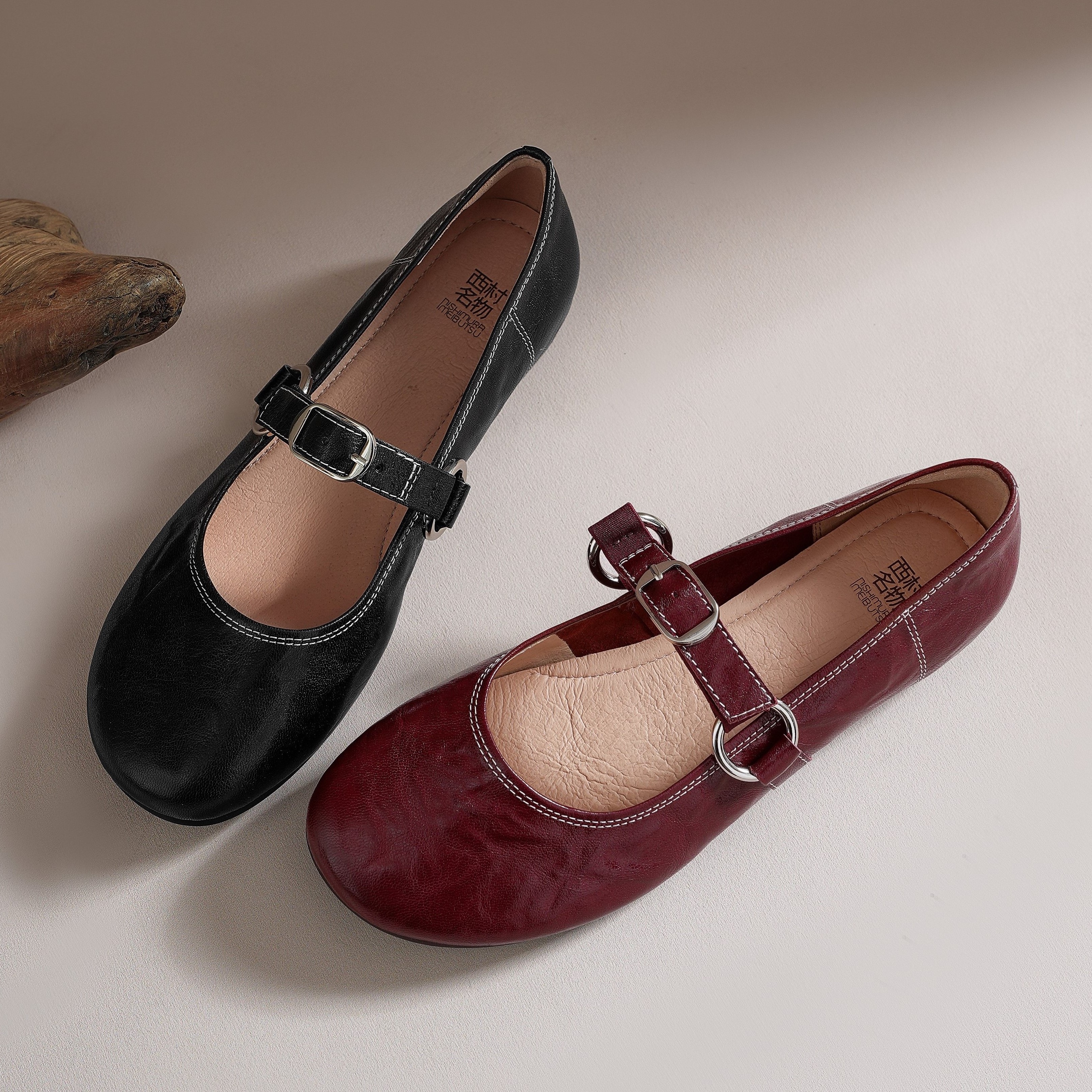 【羊皮革】西村名物2026年春季新款舒适平底原皮纯色浅口单鞋玛丽珍鞋T26AE17391