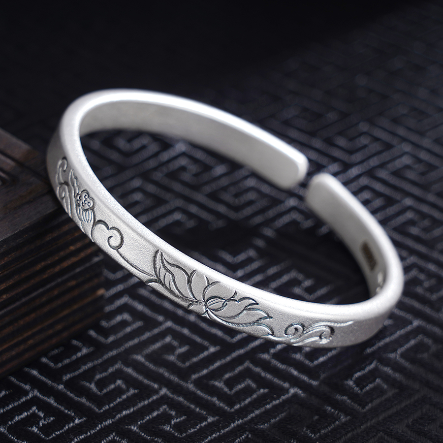 【寓意】:纯银开口手镯,镯面錾刻莲花莲蓬纹样,莲花喻纯净初心,莲蓬含多子硕果。二者结合,寓清心静气、丰饶圆满。