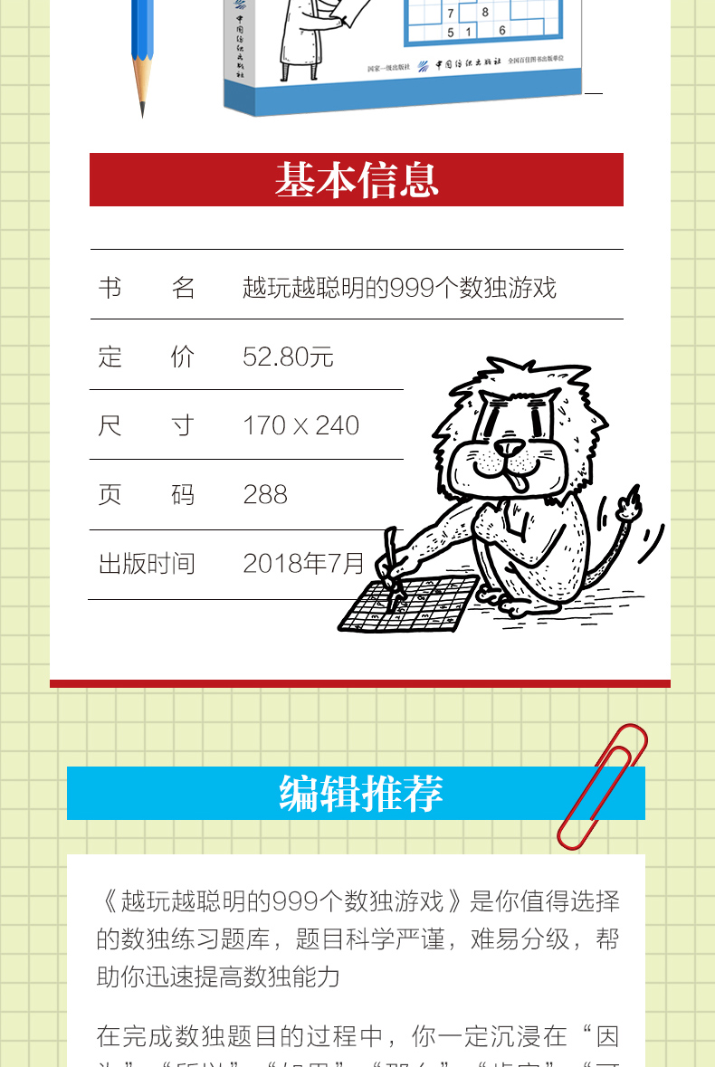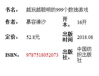 《越玩越聪明的999个数独游戏》数独是危险的事物,它让你忘记家庭,忘记工作,只想着房间里乱飞的纸片和涂涂改改的印迹。《泰晤士报》的这句评论生动地说明了数独的魅力,数独不仅能够训练人们的专注力,还能提高大家的逻辑思维能力。刚刚接触数独的读者通常靠猜数来完成盘面,可是如果掌握各种技巧的话,就会又快又准确地完成盘面。本书是一本数独技巧与题目的合集,*章介绍了标准数独的各种基本解法,第二章介绍了十种变形数独的技巧,之后章节提供了999道不同类别不同难度的数独题目,你可以由易到难,一步步进行挑战,也可以随性而至选择题目,享受你的闲暇时光和碎片时间。