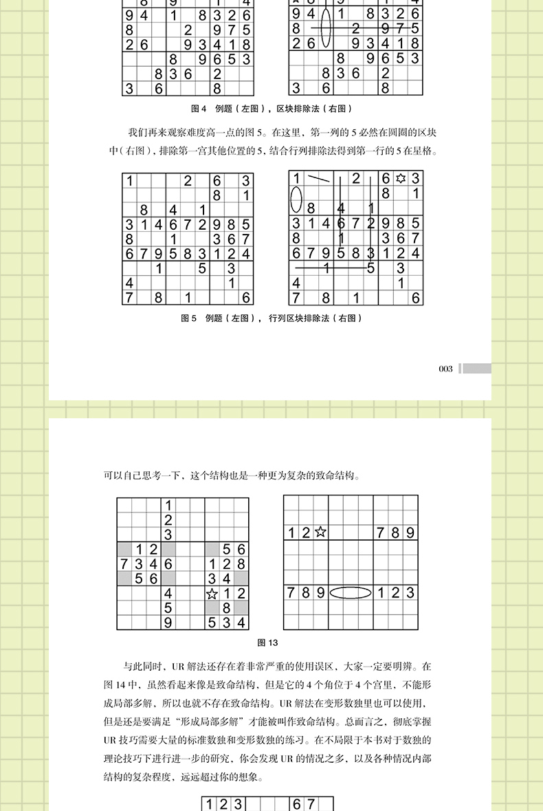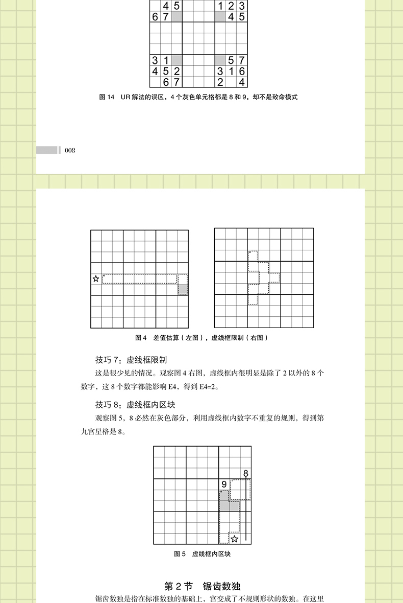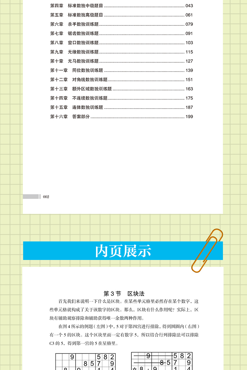 章 标准数独解法第1节 余数法//001第2 节 排除法//001第3 节 区块法//003第4 节 数对//004第5 节 数组//005第6 节 性解法//006第二章 变形数独解法 节 杀手数独//009第2 节 锯齿数独//013第3 节 窗口数独//016第4 节 无缘数独//017第5 节 无马数独//018第6 节 同位数独//019第7 节 对角线数独//020第8 节 额外区域数独//021第9 节 不连续数独//0220 节 连体数独//023第三章 标准数独初级题目//025第四章 标准数独中级题目//043第五章 标准数独题目//061第六章 杀手数独训练题//079第七章 锯齿数独训练题//091第八章 窗口数独训练题//103第九章 无缘数独训练题//115第十章 无马数独训练题//127第十一章 同位数独训练题//139第十二章 对角线数独训练题//151第十三章 额外区域数独训练题//163第十四章 不连续数独训练题//175第十五章 连体数独训练题//187第十六章 答案部分//199