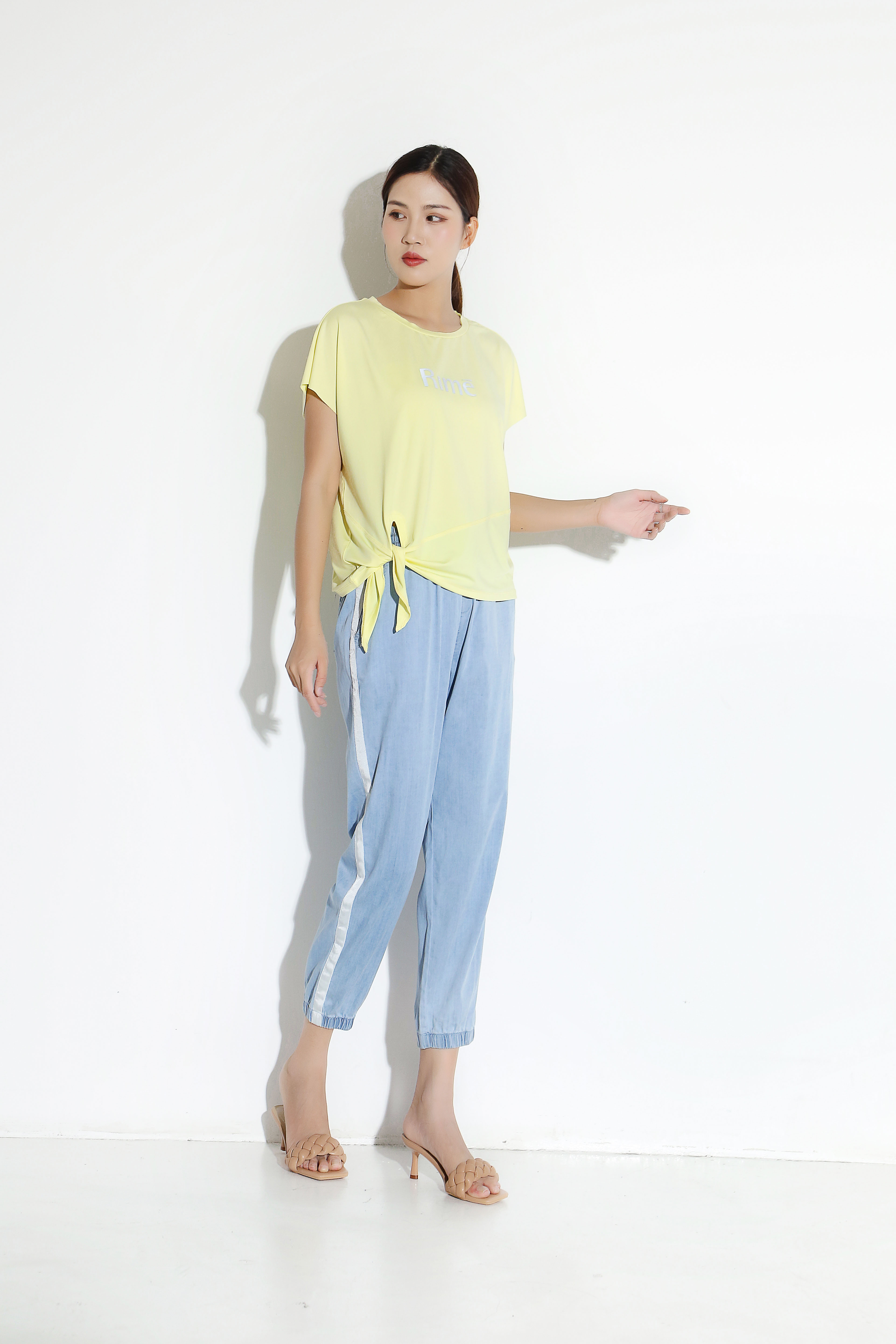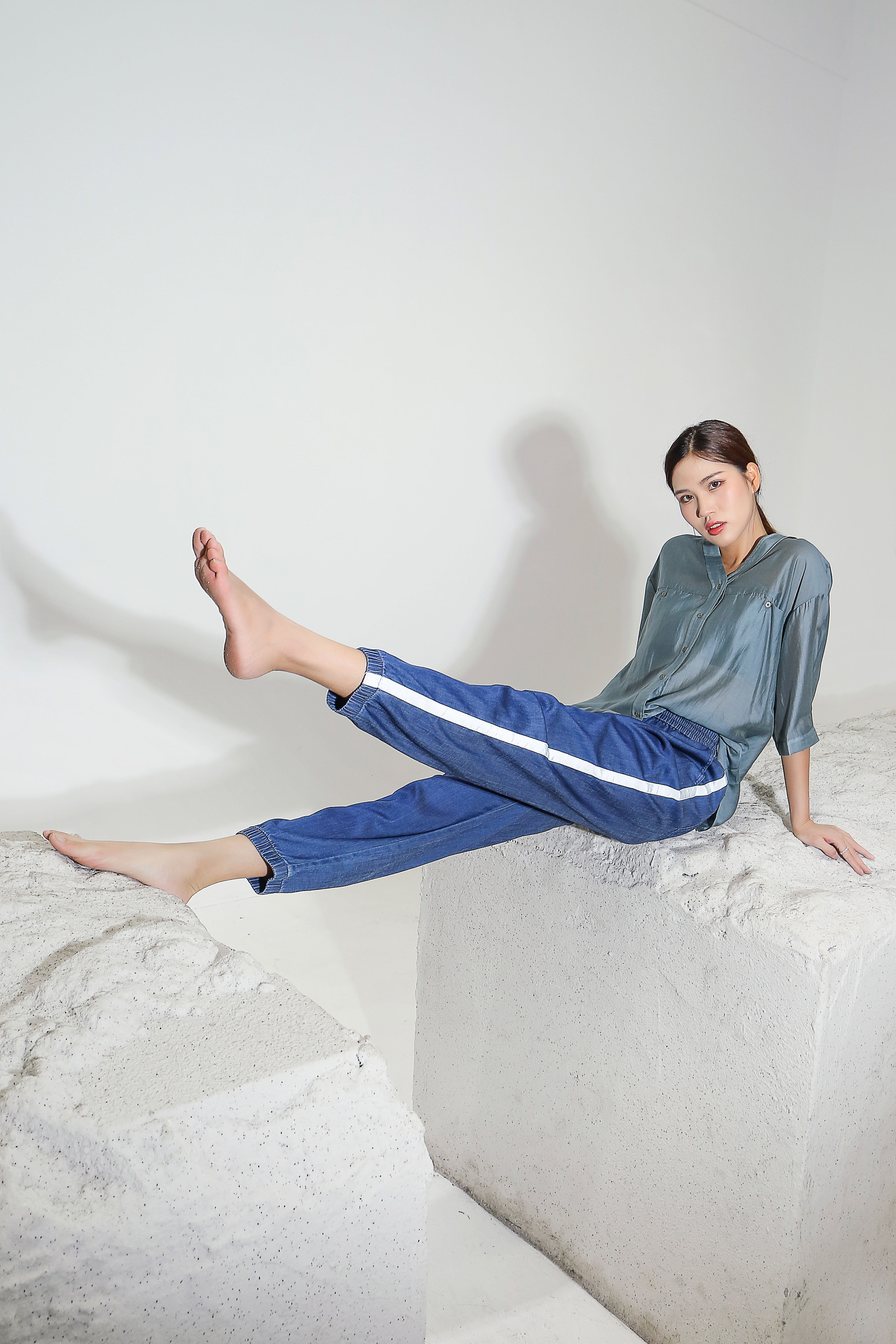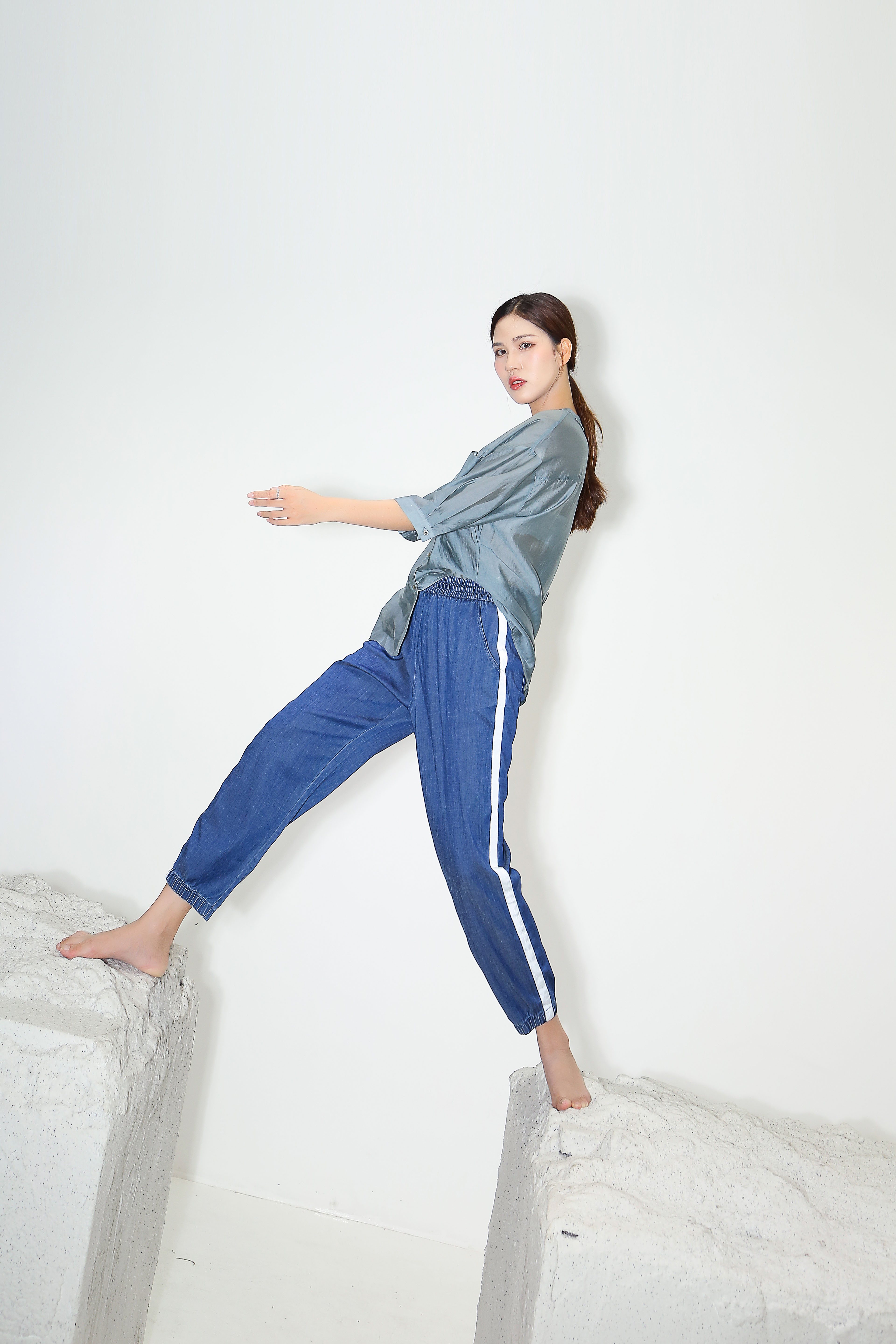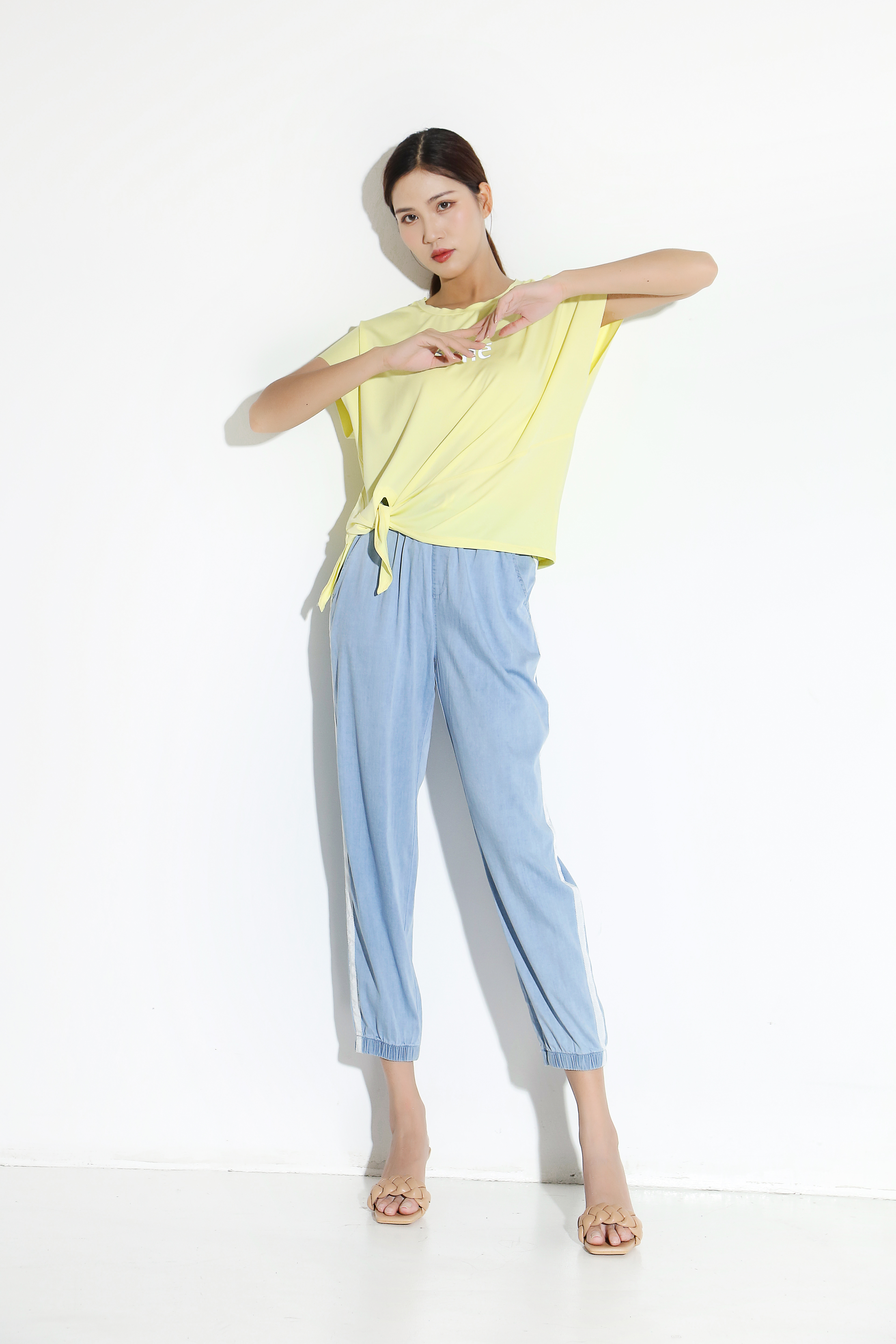 天丝牛仔拼接宽松显瘦九分扎脚裤27032