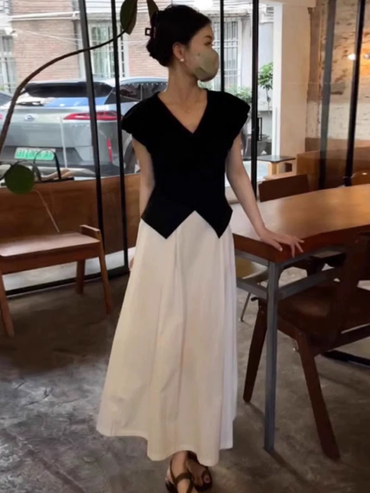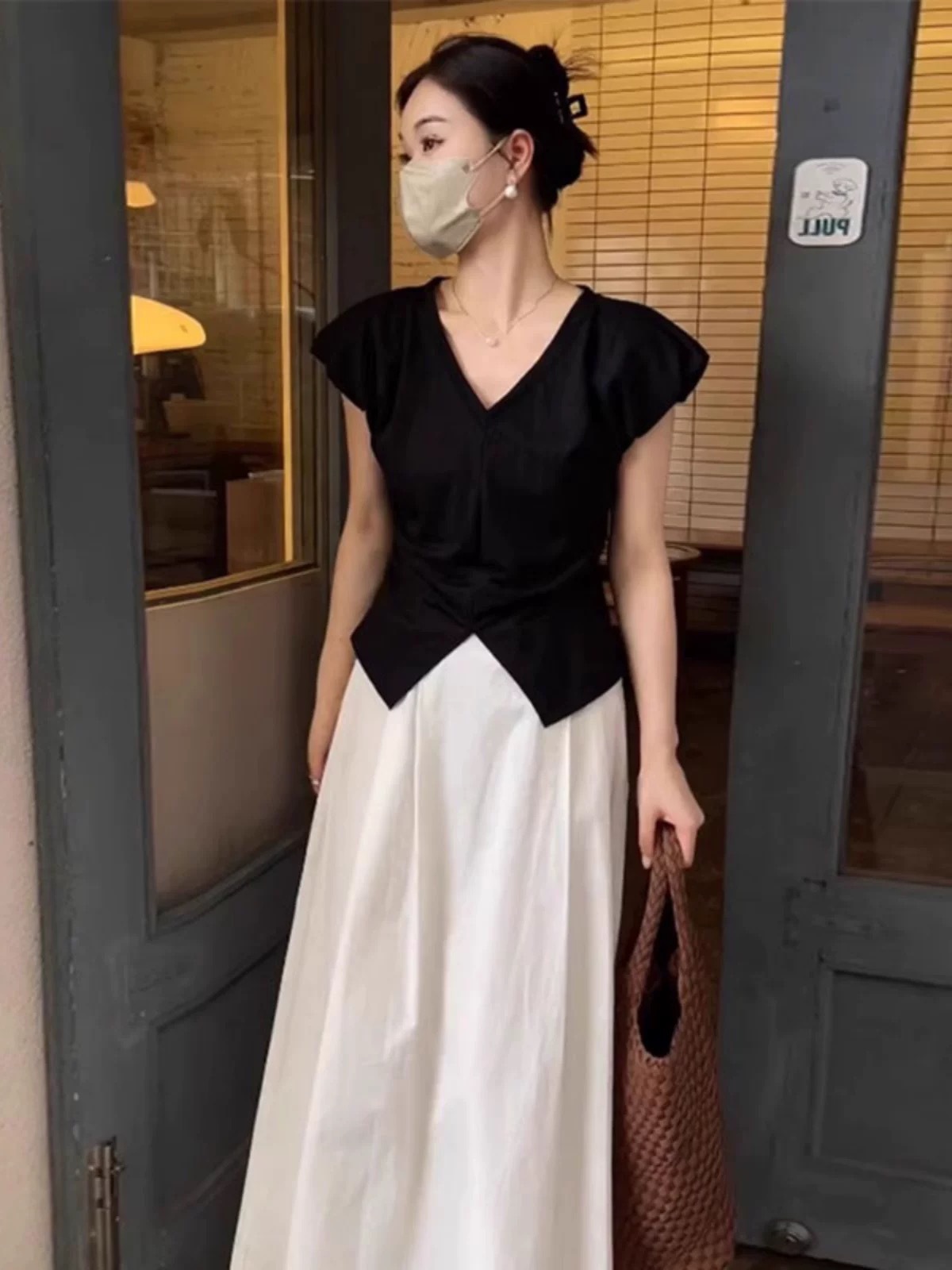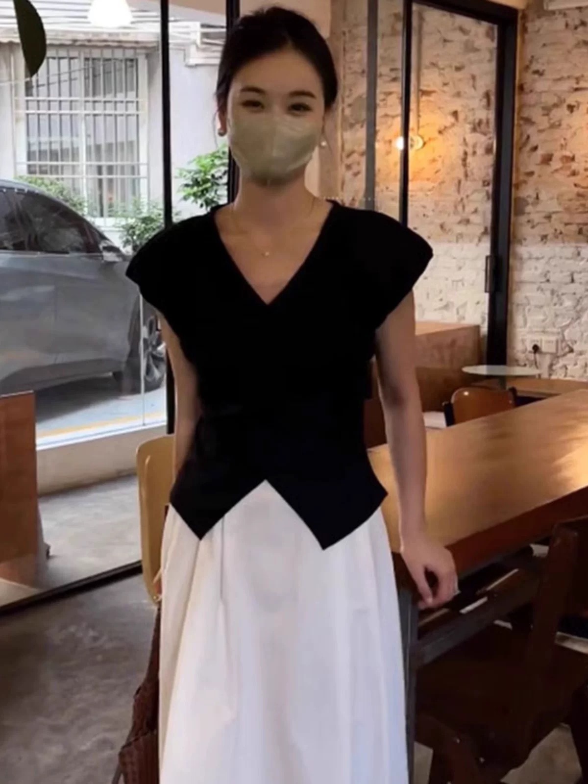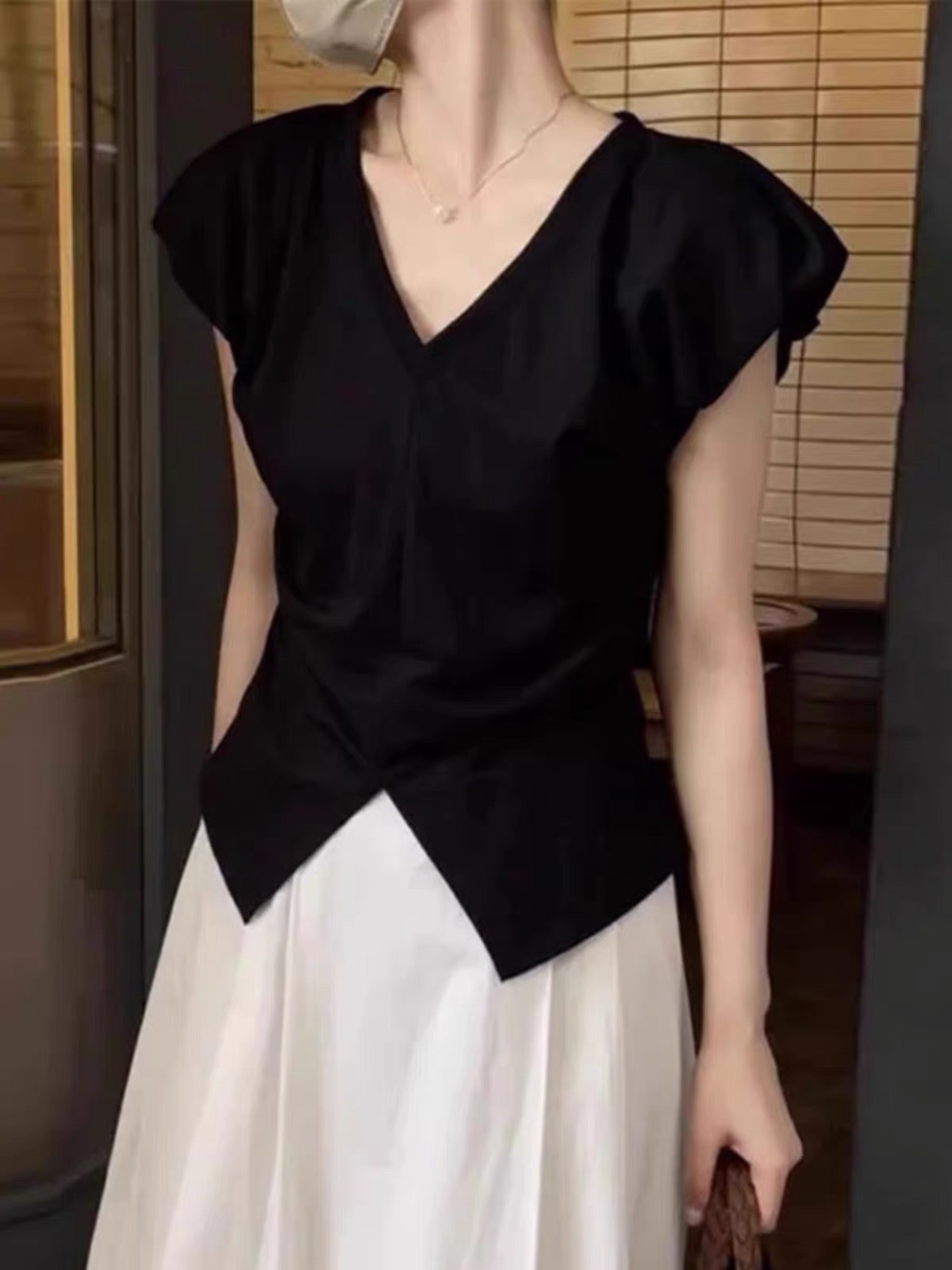 【不规则开叉V领短袖】t恤女夏季新款 黑色修身显瘦收腰小飞袖上衣