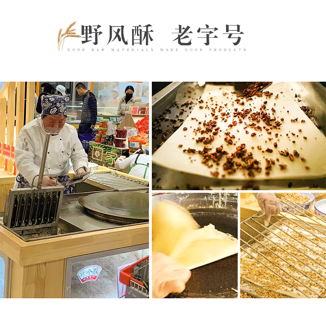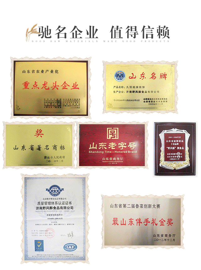 - 济南野风酥食品有限公司是一家从事绿色无公害农产品深加工,生产山东特产食品的企业。职工总人数586人,其中高中级技术人员56人。2007年济南野风酥食品有限公司被山东省人民政府授予省级农业产业化经营重点龙头企业。我公司生产的糖酥煎饼等系列产品曾连续获农业部、山东省优质产品奖,被人民大会堂定为国宴用品。“九顶塔”牌商标获得“省优”“部优”商标称号。全国著名的营养学家于若木曾来厂视察并亲笔题词,姜春云、苏毅然等国家、省级领导先后来厂视察。“野风酥”被中国食品协会评为“优秀民族食品”,获得“中华名吃”称号。产品连续获得国家级食品展销会的畅销产品奖,成为山东省的特色食品,省、市旅游局的十佳旅游商品。“山东煎饼”和“山东烧饼” 被认证为绿色食品。