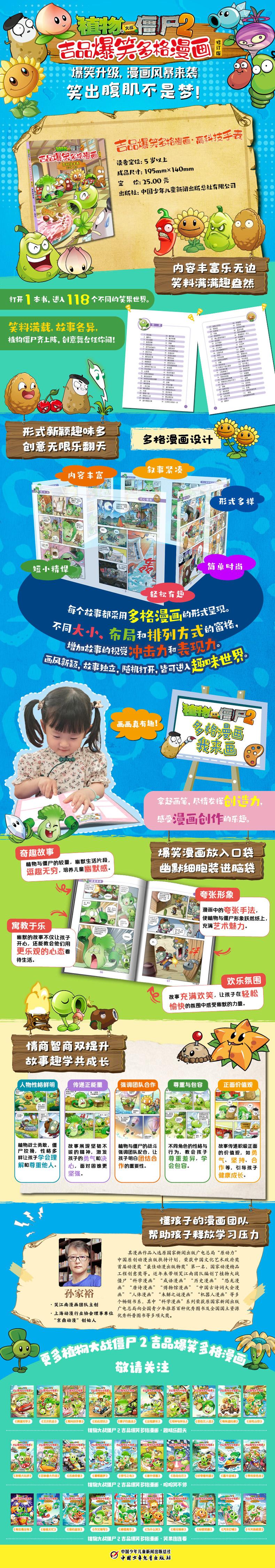 《植物大战僵尸2吉品爆笑多格漫画(修订版)·高科技手表》,利用风靡全球的电脑游戏“植物大战僵尸2”中的素材,以多格漫画的形式全新演绎新一代植物与僵尸的爆笑故事。在编排上,每页漫画为一组,运用分镜手法,用多格画面来诠释一个完整独立的小情节,每个页面都有自己的爆笑点。在内容上,讲述了两个阵营内部以及相互对垒作战时的趣闻和笑料。在风格上,故事篇幅短小、画风笔触简练,但却清晰地传递出了幽默和诙谐的味道。