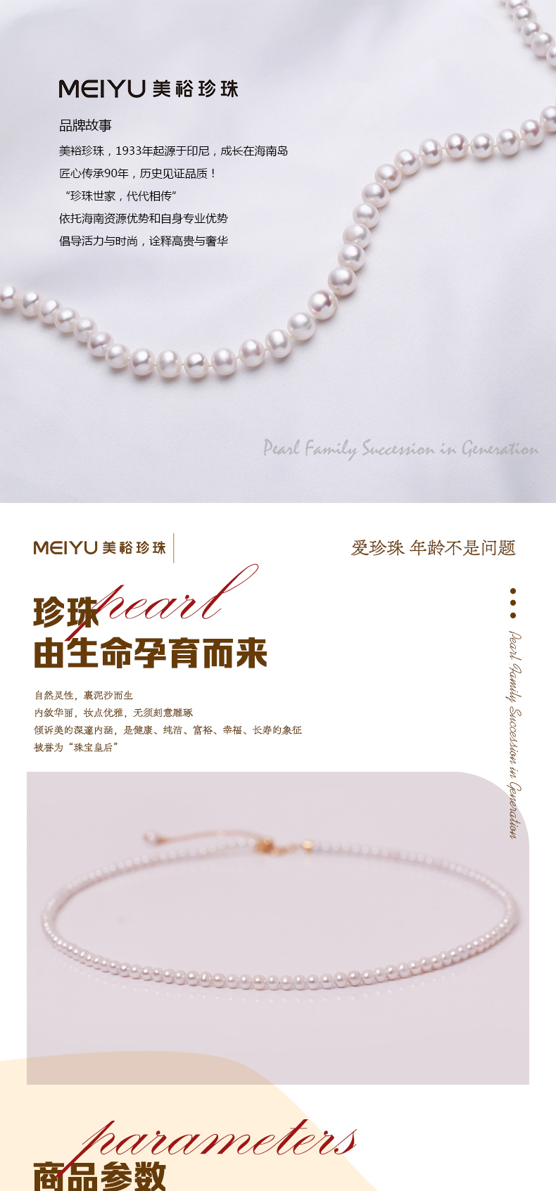 珍珠世家,代代相传。美裕珍珠,1933年起源于印尼,成长于海南岛。依托海南资源优势和自身专业优势,以经营南珠、南洋珠为主,专注于珍珠文化的挖掘和传播,把珍珠代表的爱意,永不间断地传承下去。