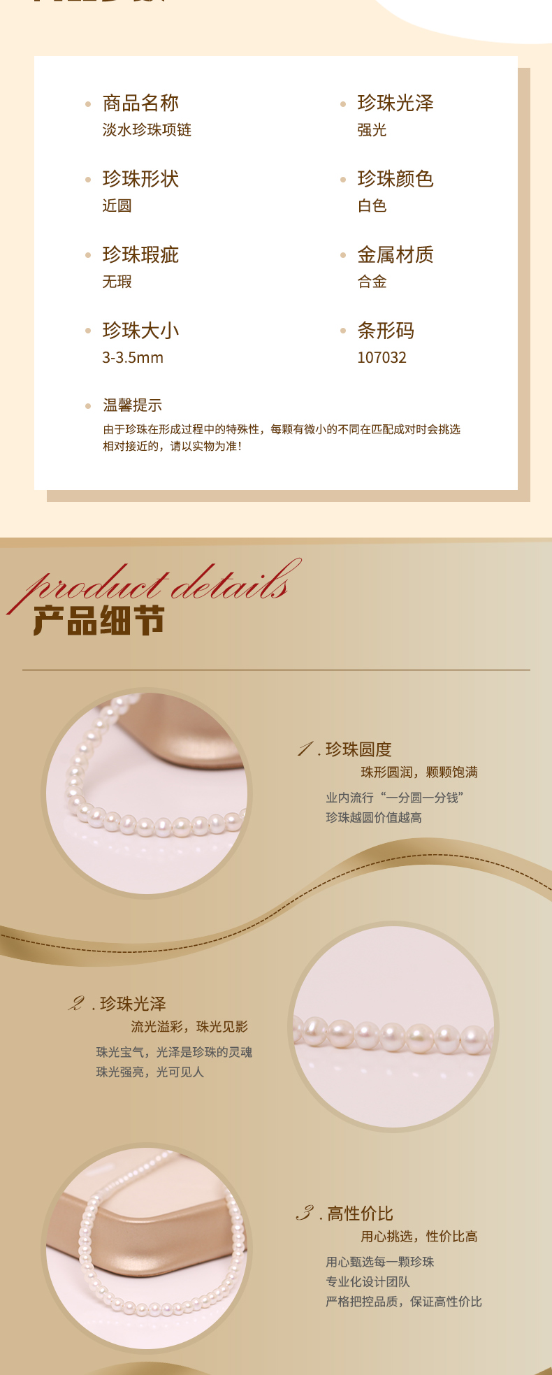 淡水珍珠项链 小米珠链 3-3.5mm白 107032