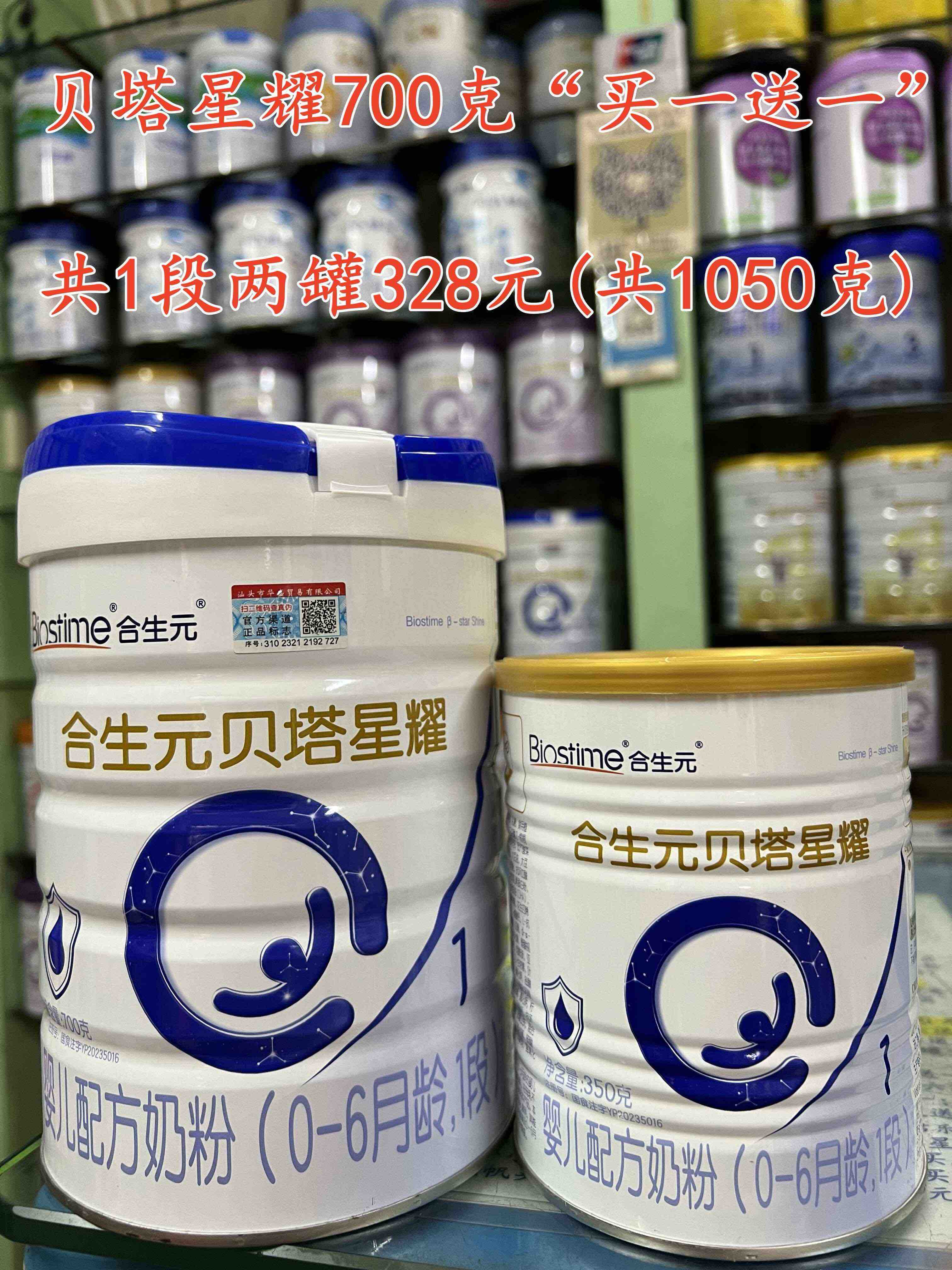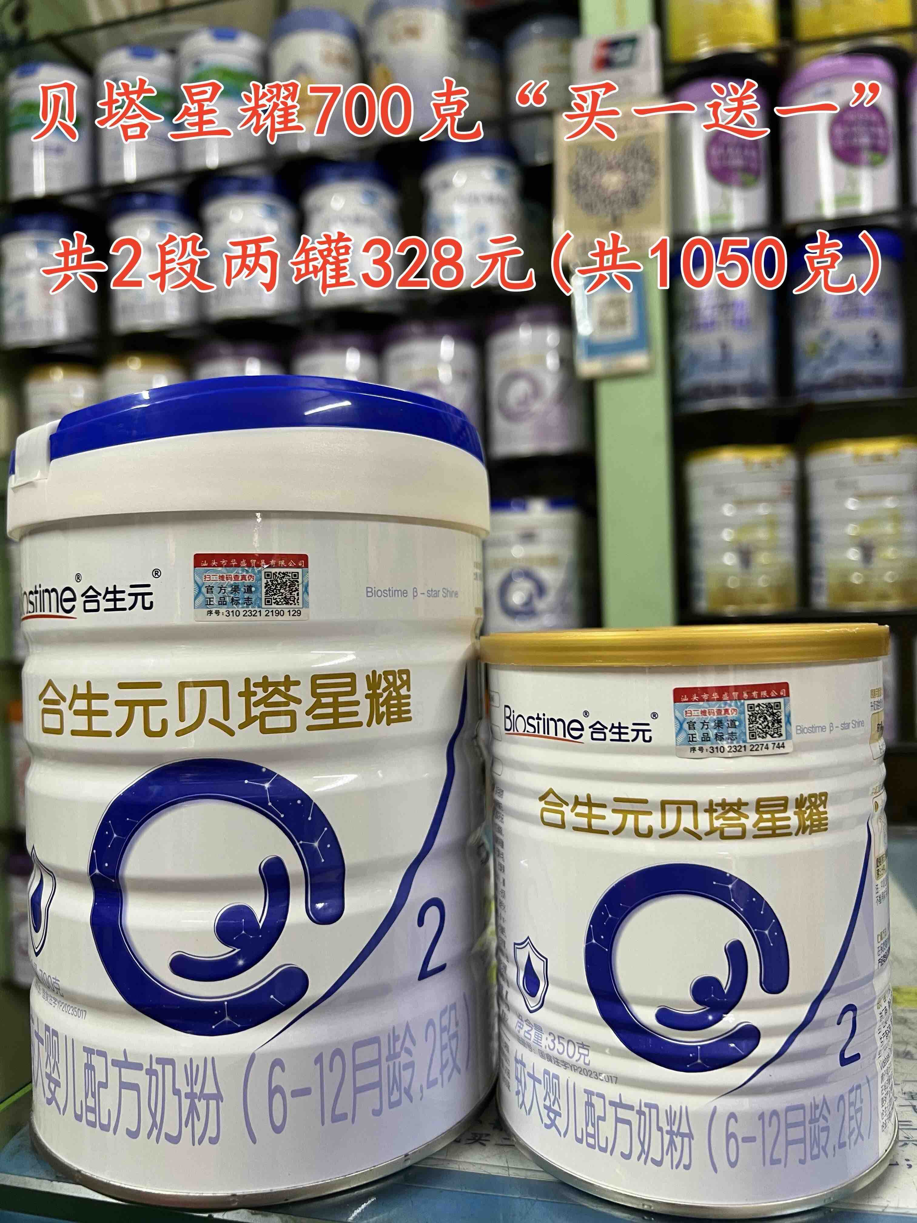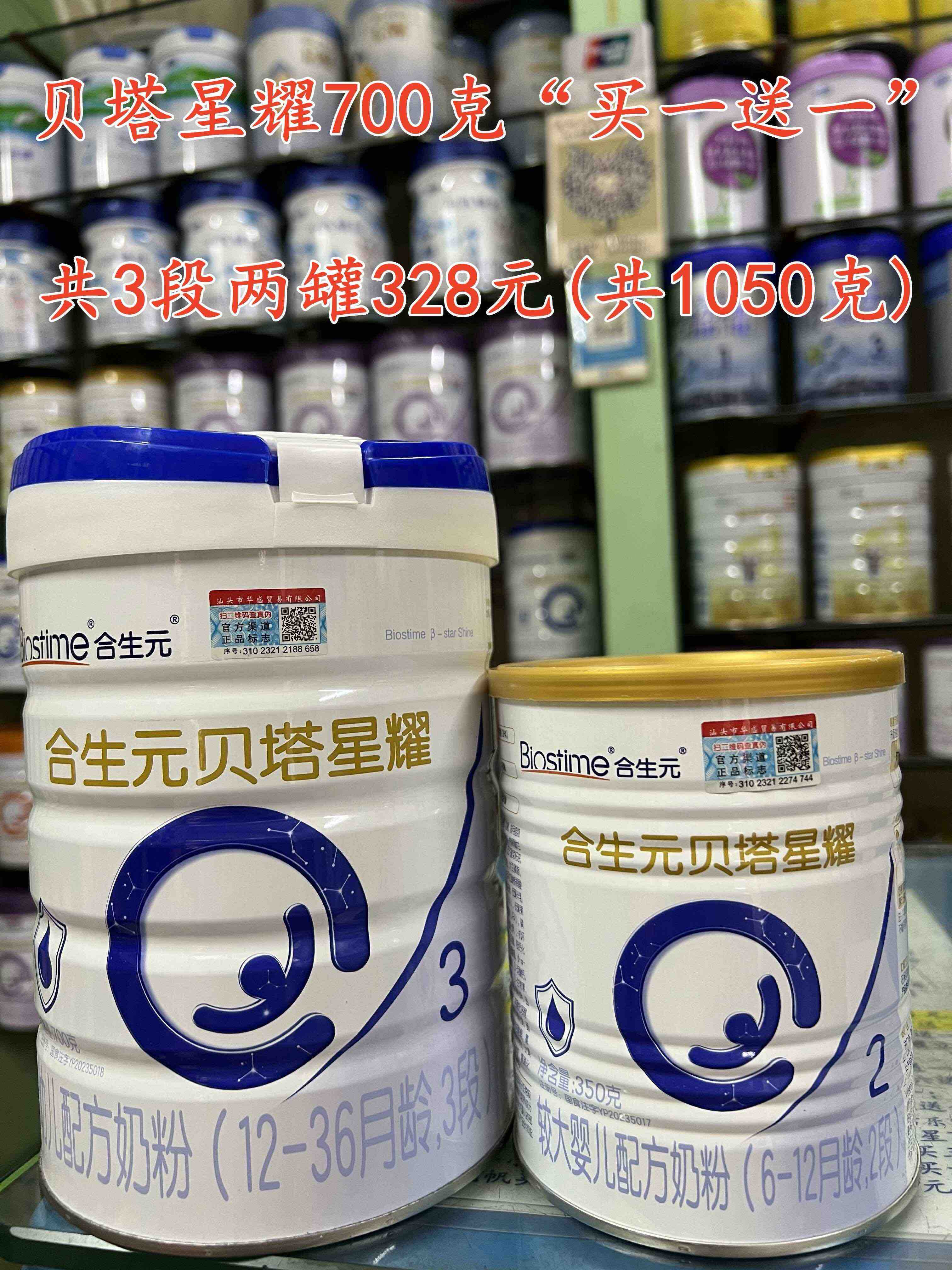 合生元贝塔星耀“买一送一”, 购700克一罐赠送350克一罐,共一组两罐328元。 (1段、2段和3段任选)