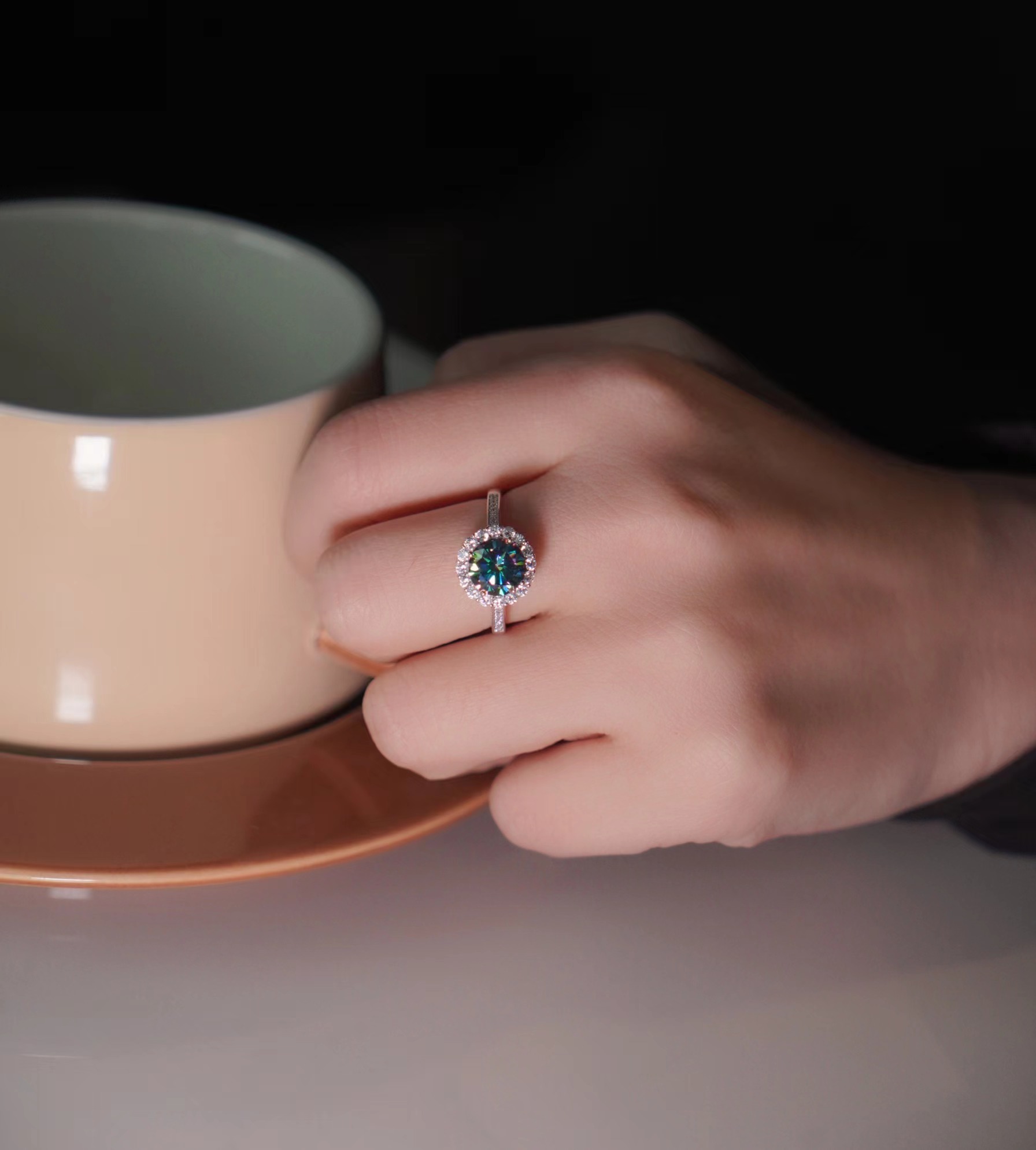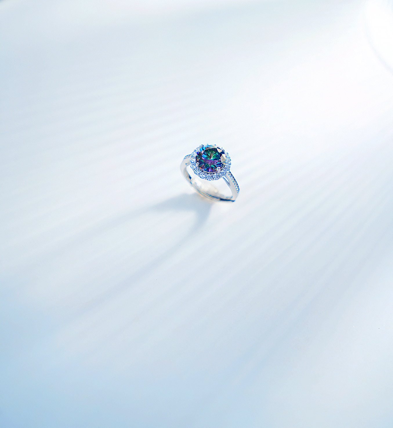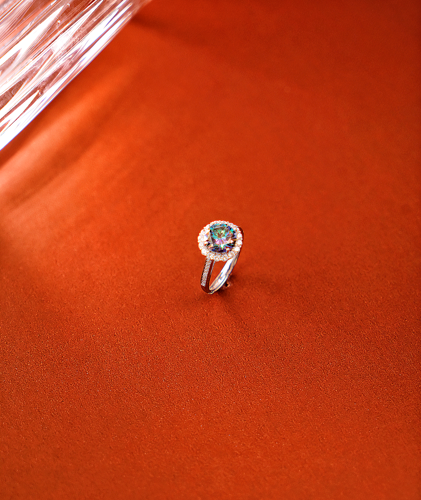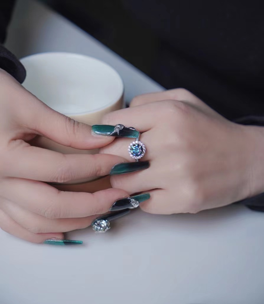L925银莫桑石戒指 蓝钻圆形戒指带证书时尚复古轻奢侈小众炫彩