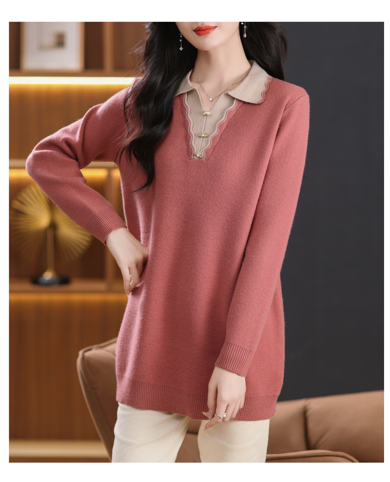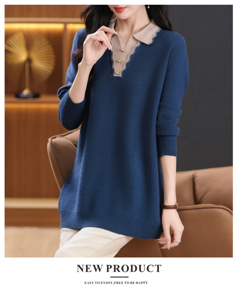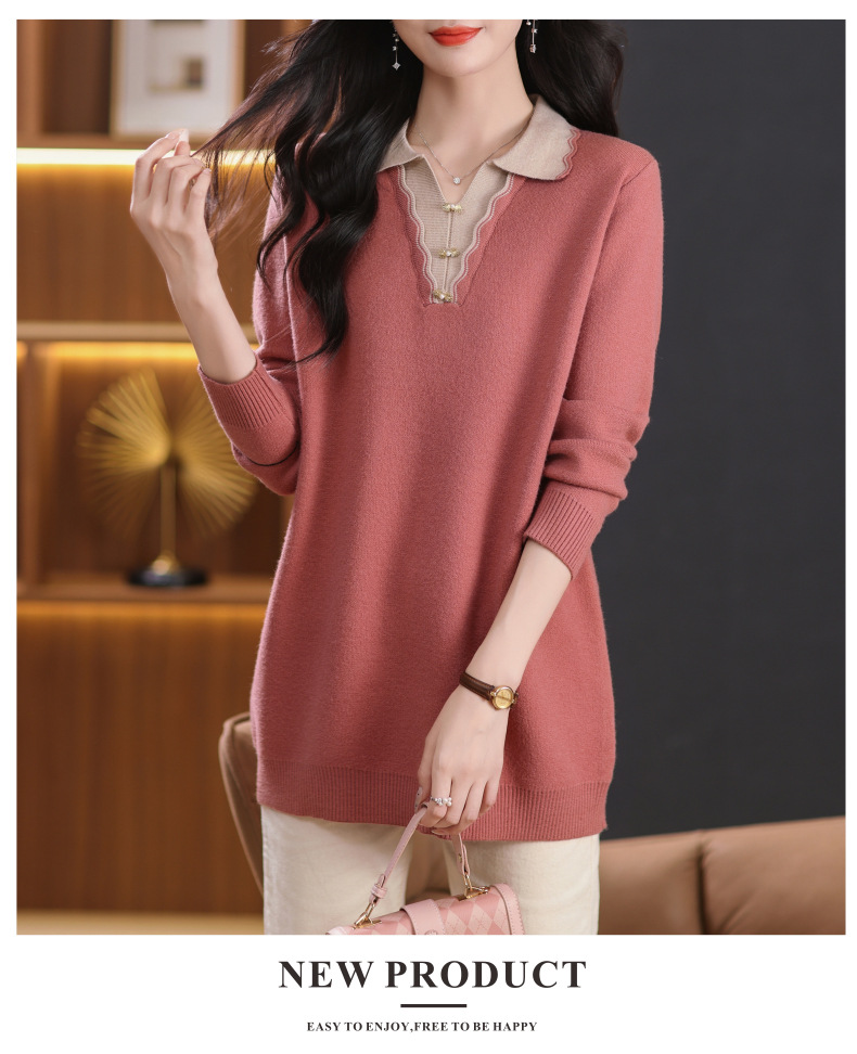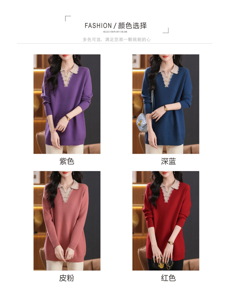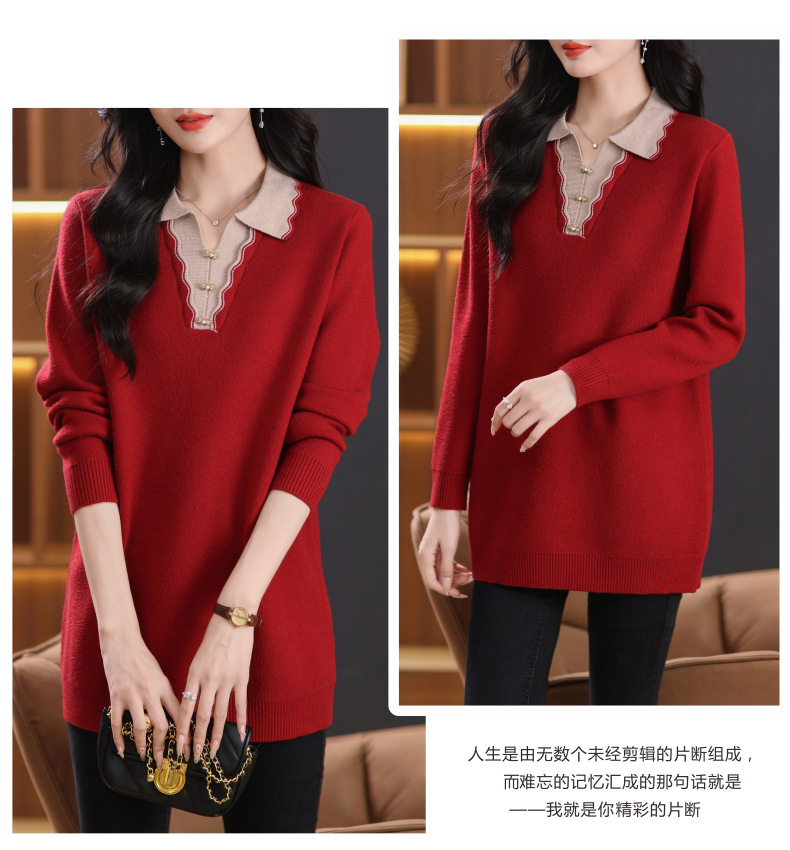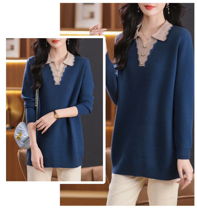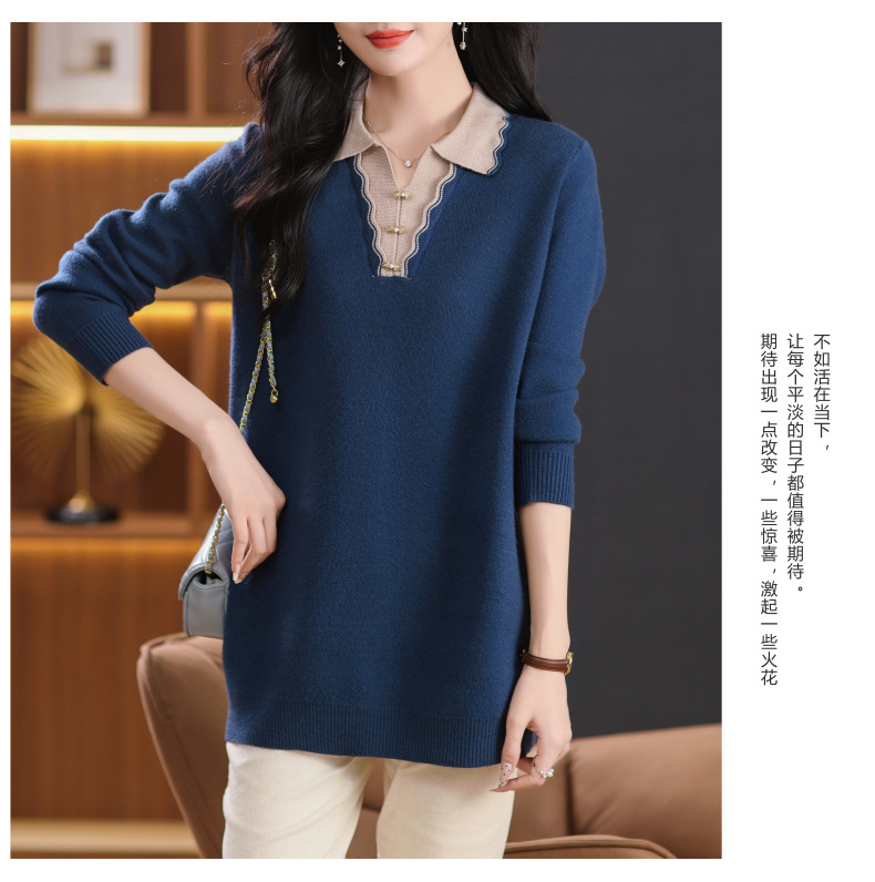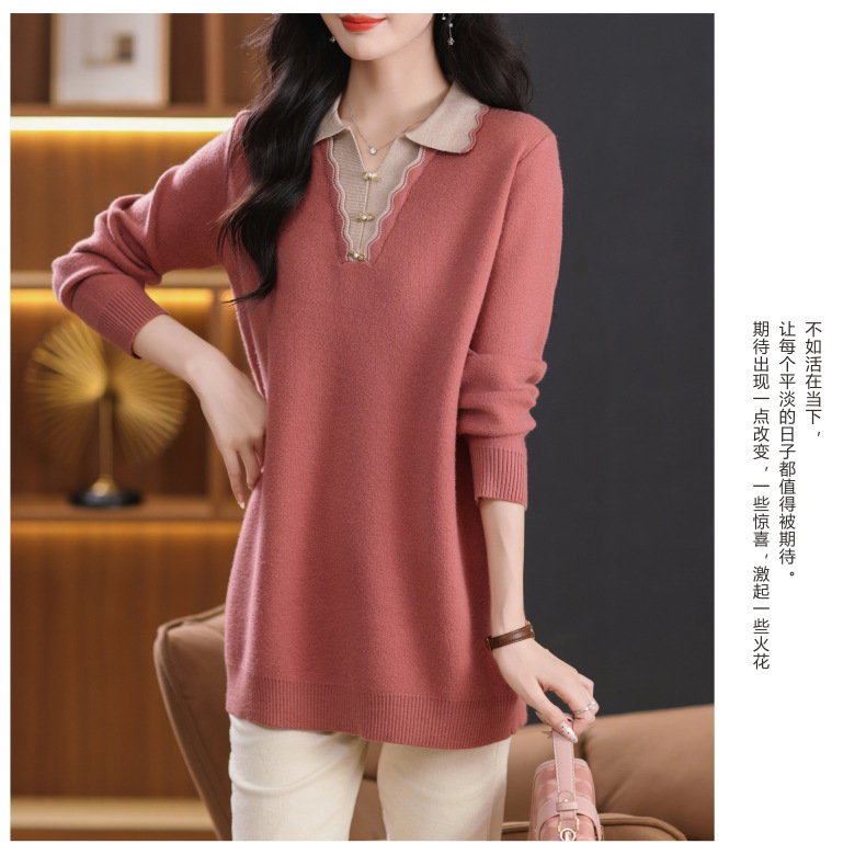 翻领拼色中长款毛衣,宽松休闲针织衫百搭打底衫CC-5-6115