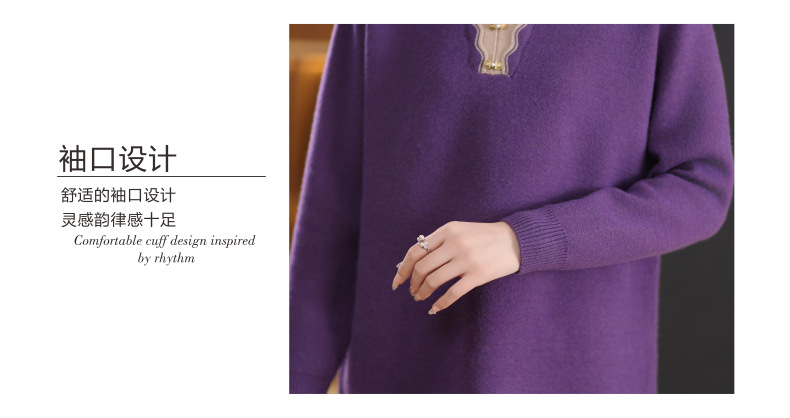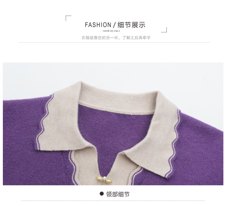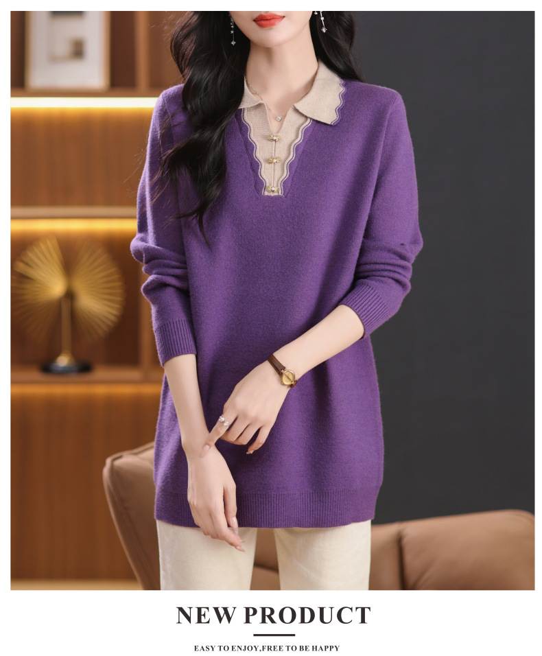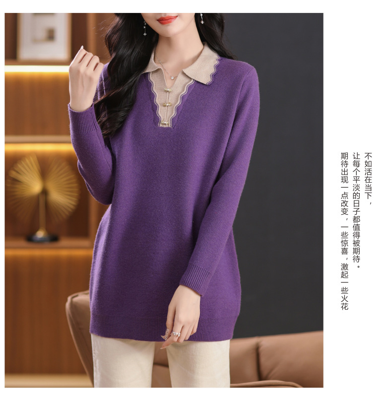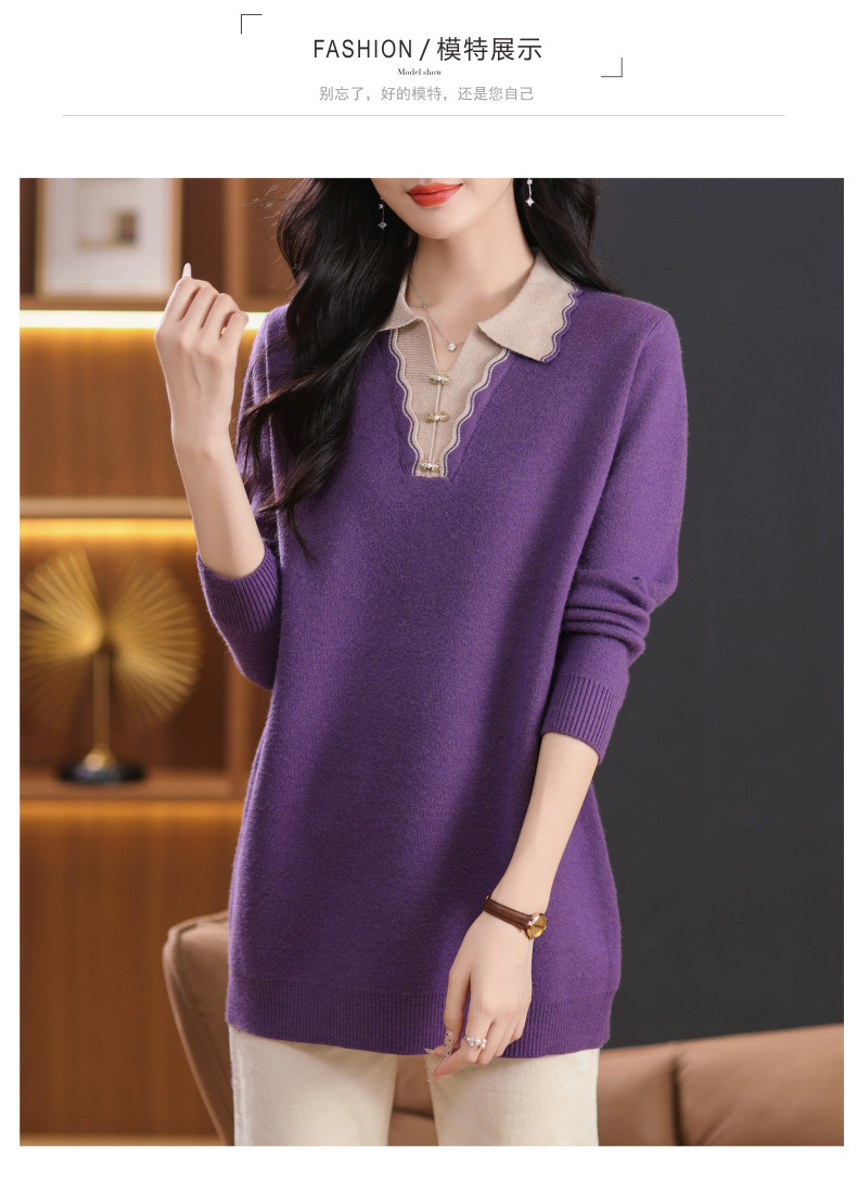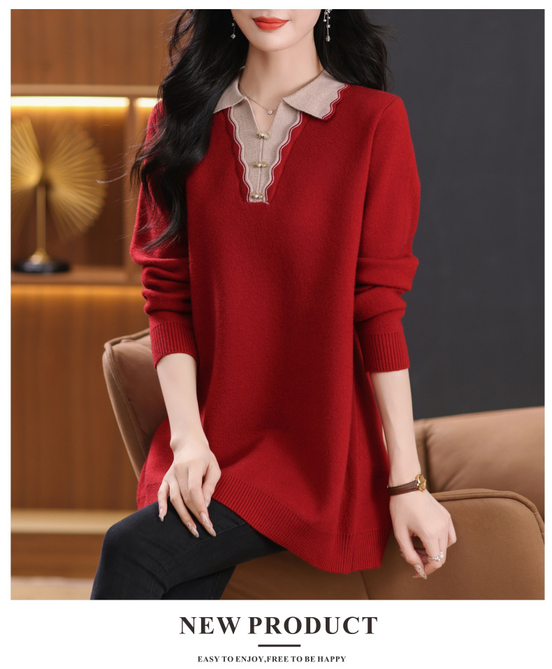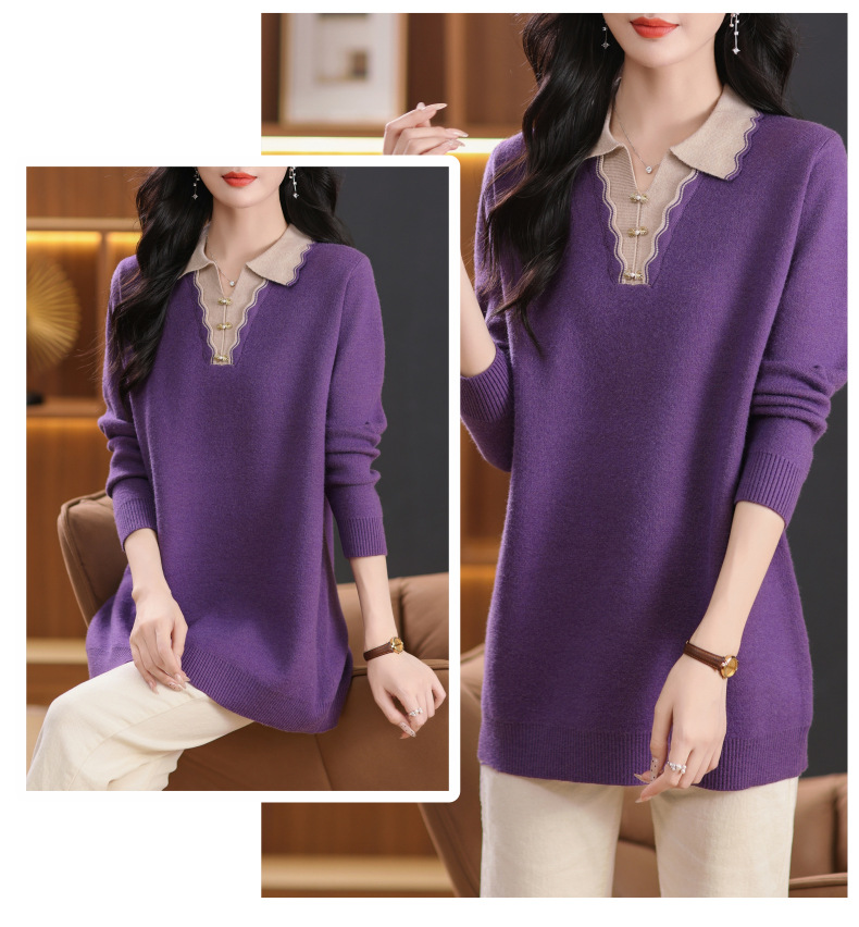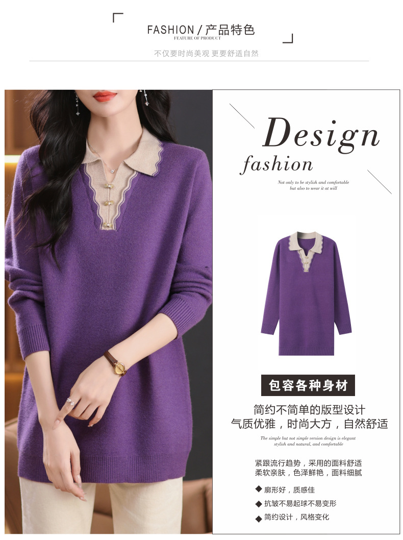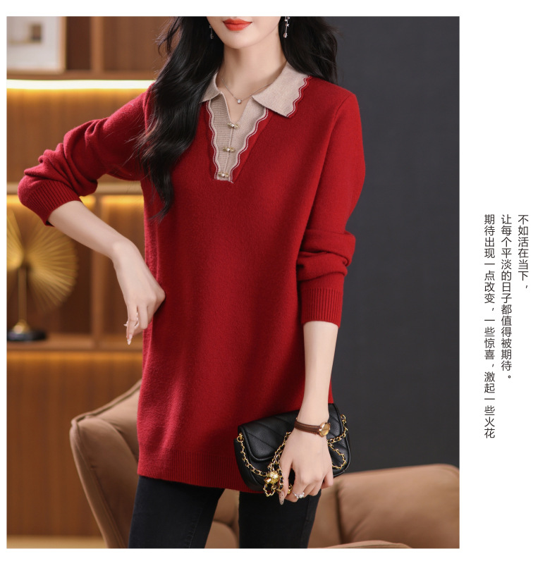 翻领拼色中长款毛衣,宽松休闲针织衫百搭打底衫CC-5-6115